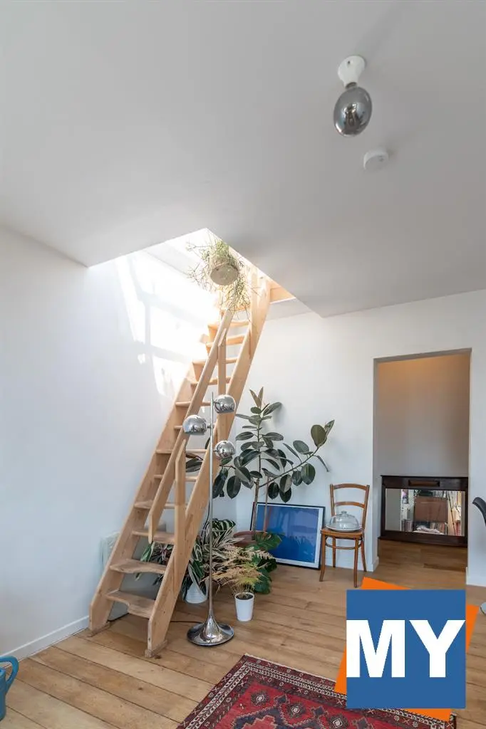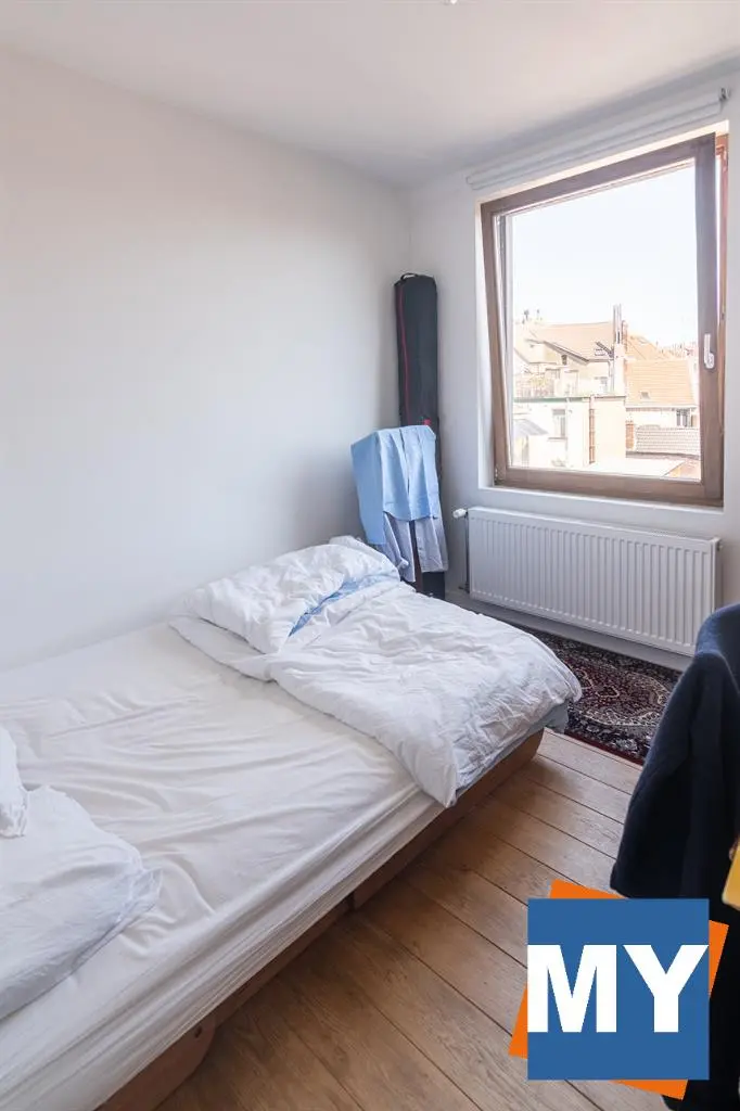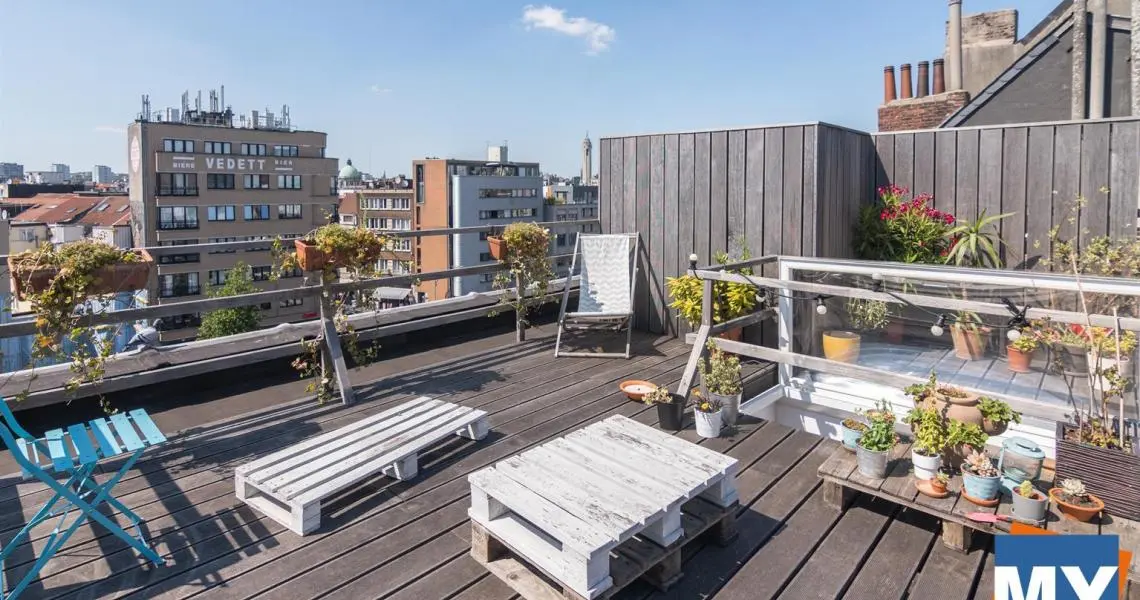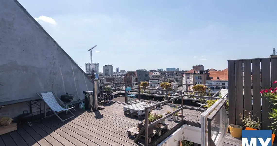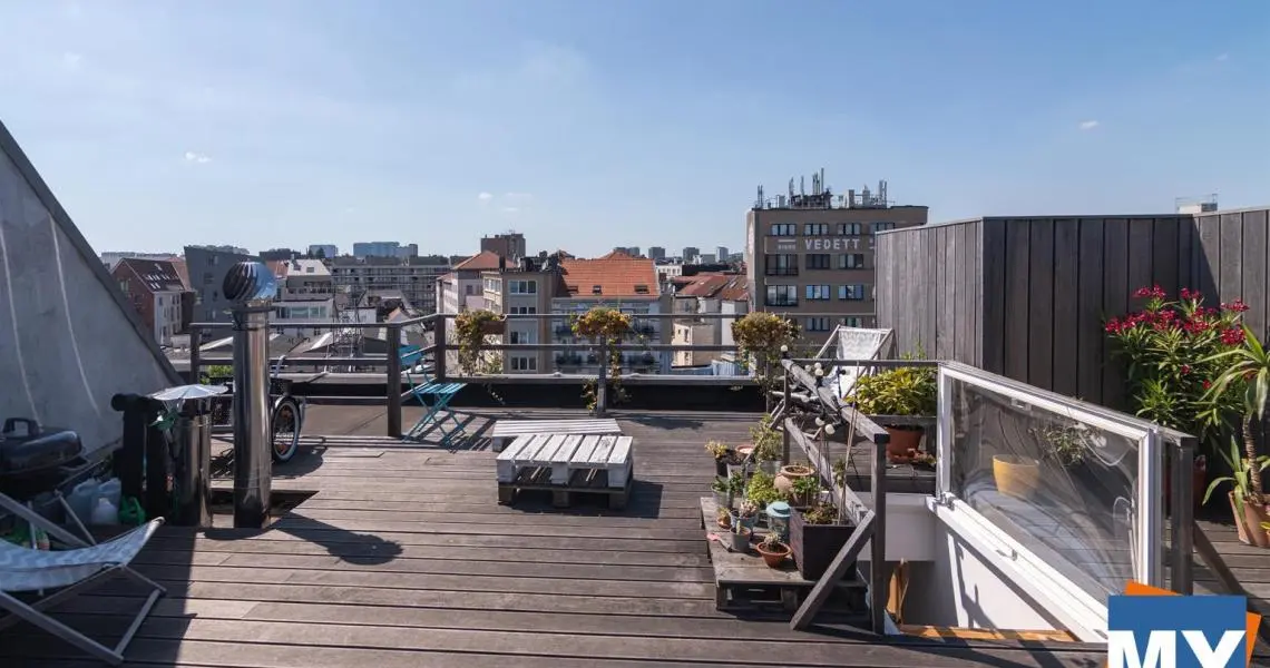 Bruxelles - Superbe appartement 2 chambres de +/- 70m² avec une magnifique terrasse sur le toit de +/- 51 m² et sa vue sur Bruxelles situé dans le quartier Dansaert juste en face du canal de Bruxelles comprenant un hall d'entrée donnant accès un beau séjour, une cuisine full équipée (frigo, congélateur, lave vaisselle, four, taque), une salle de douche ainsi que deux chambres lumineuses. 4ème étage sans ascenseur.