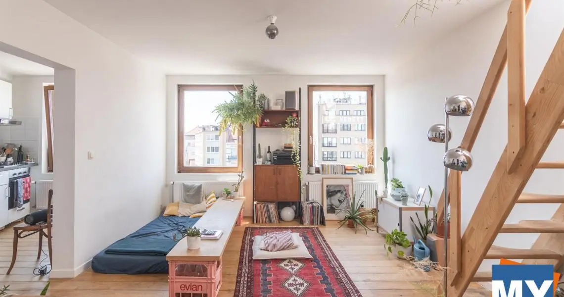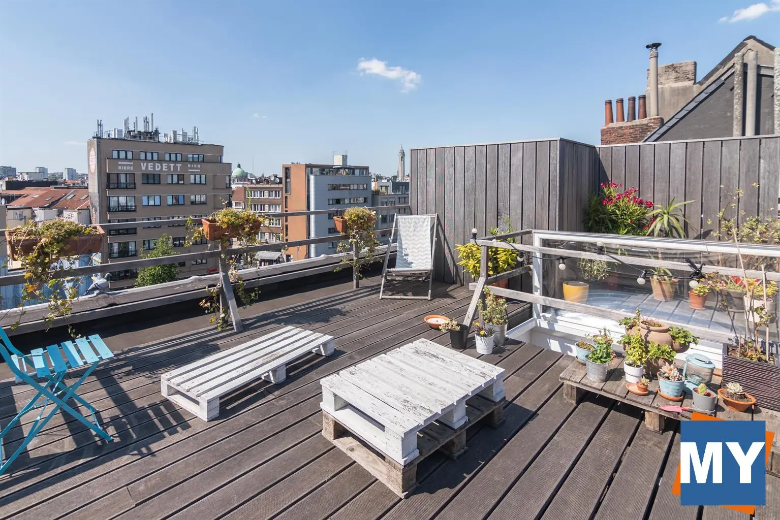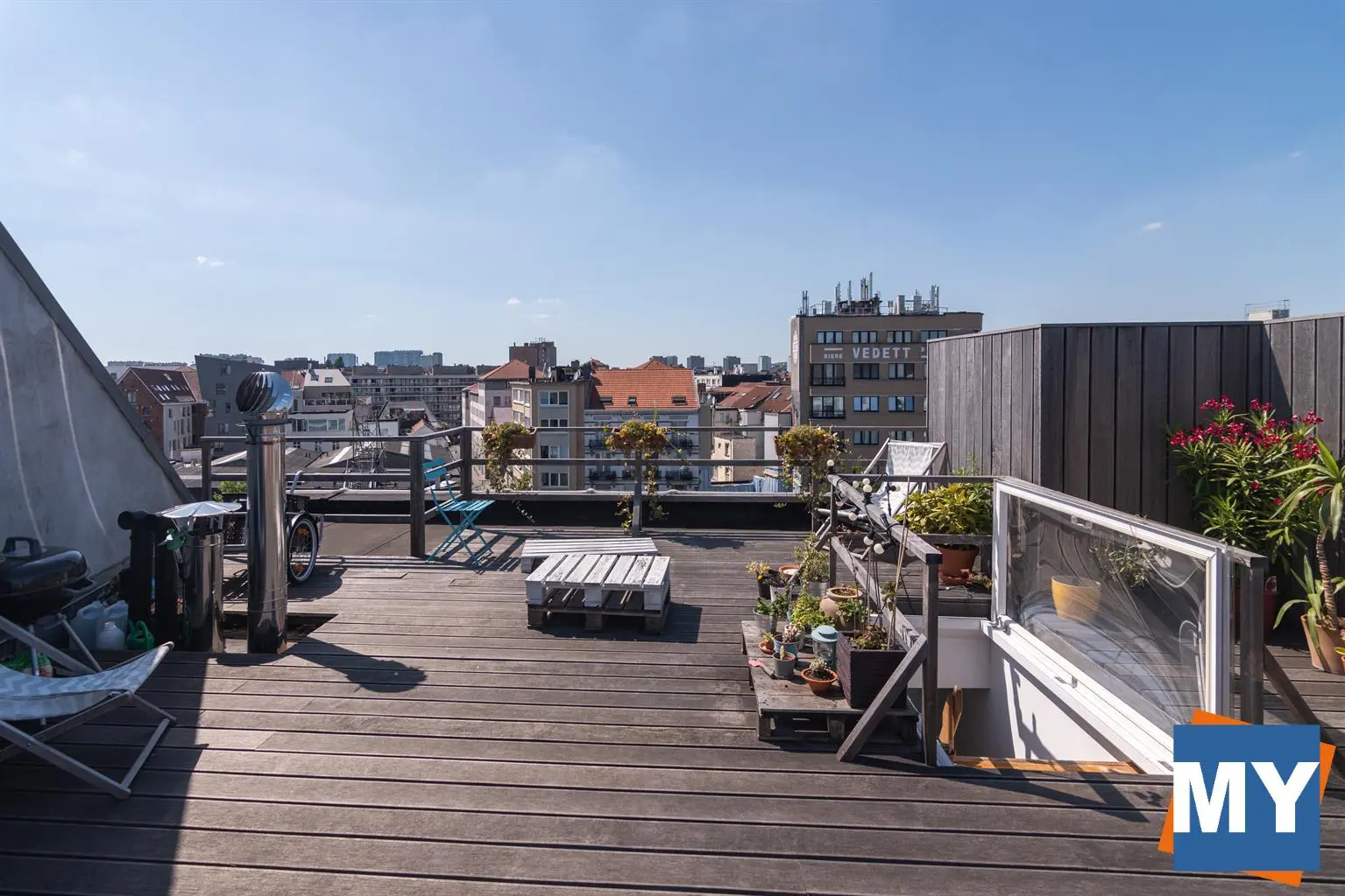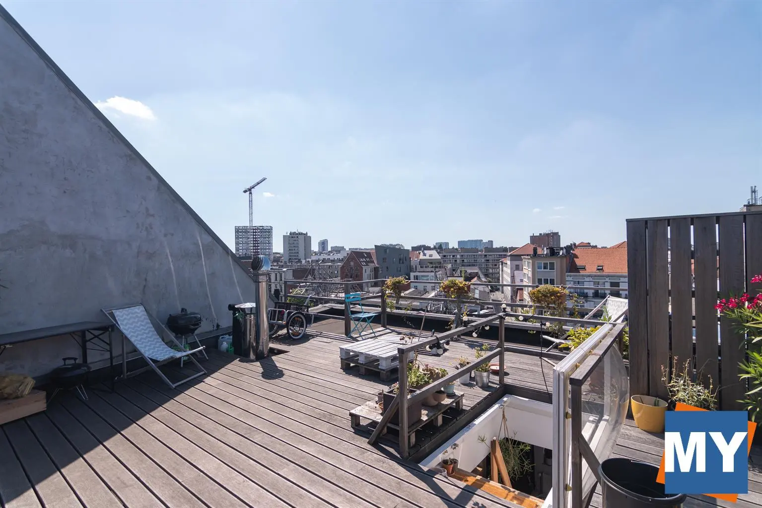 Bruxelles - Superbe appartement 2 chambres de +/- 70m² avec une magnifique terrasse sur le toit de +/- 51 m² et sa vue sur Bruxelles situé dans le quartier Dansaert juste en face du canal de Bruxelles comprenant un hall d'entrée donnant accès un beau séjour, une cuisine full équipée (frigo, congélateur, lave vaisselle, four, taque), une salle de douche ainsi que deux chambres lumineuses. 4ème étage sans ascenseur.