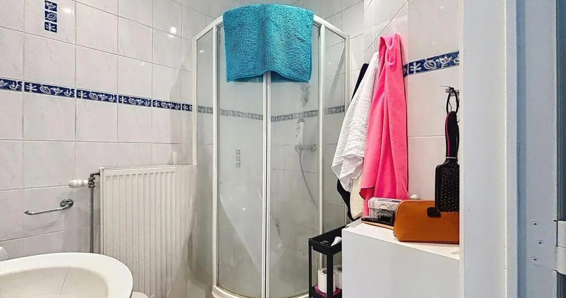Salle de douche fonctionnelle avec WC, qui sera rafraîchie avant le début du bail (nouveau lavabo et nouvelle cabine de douche)