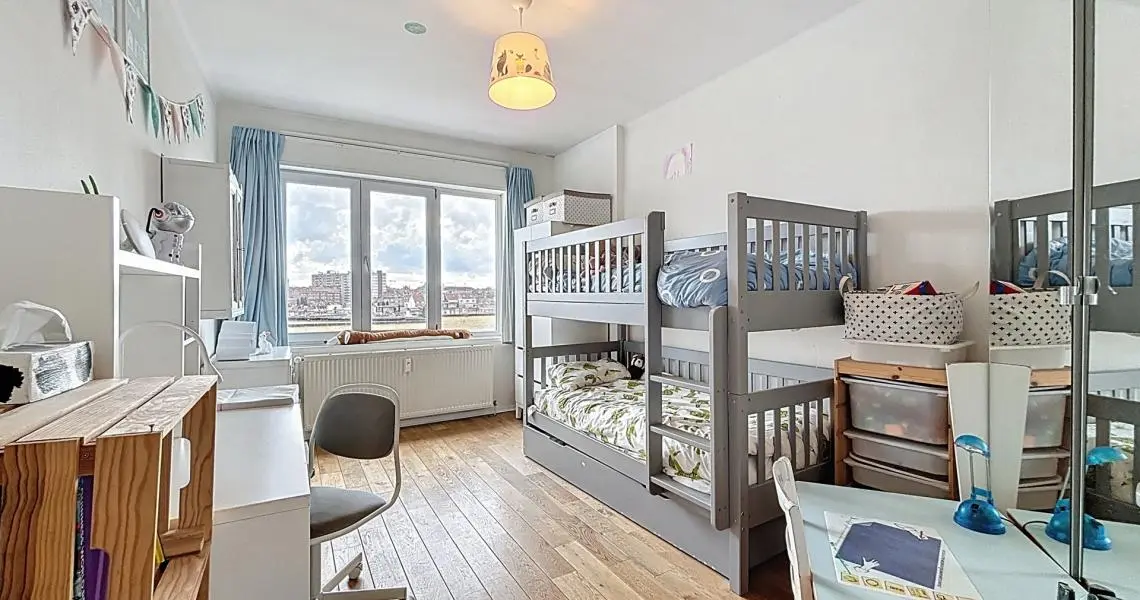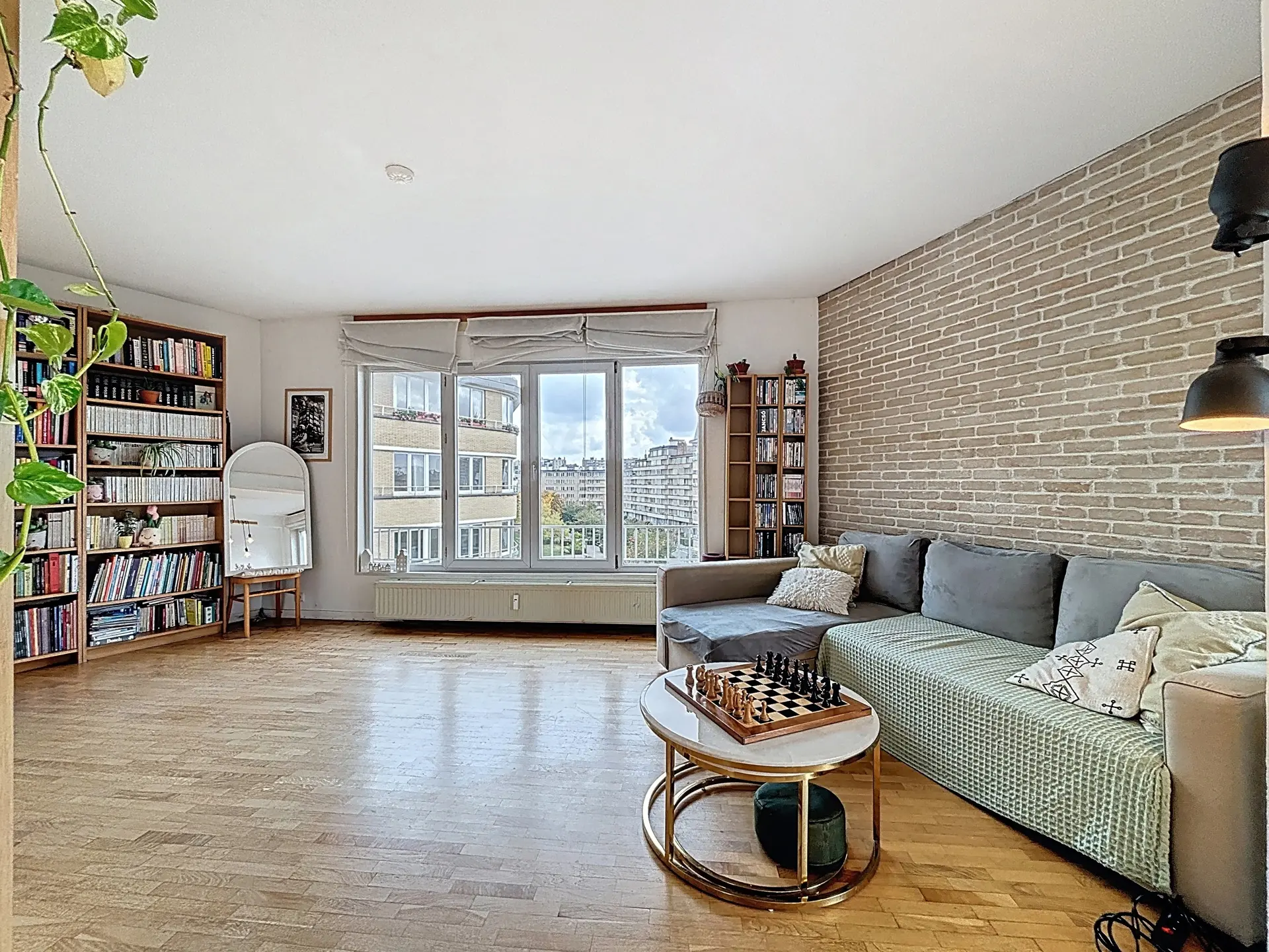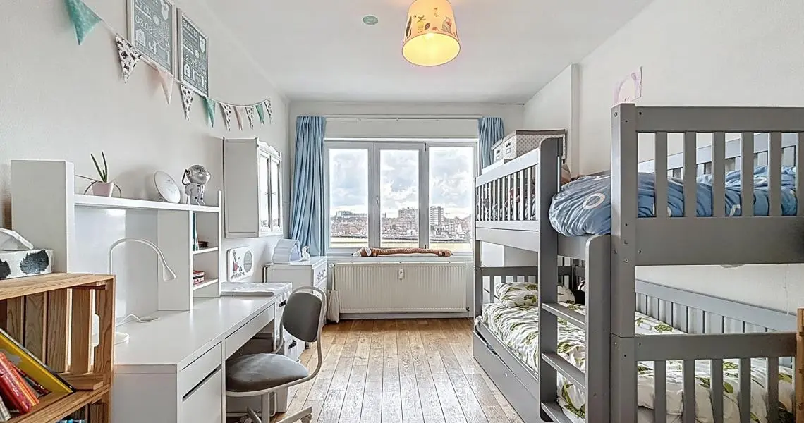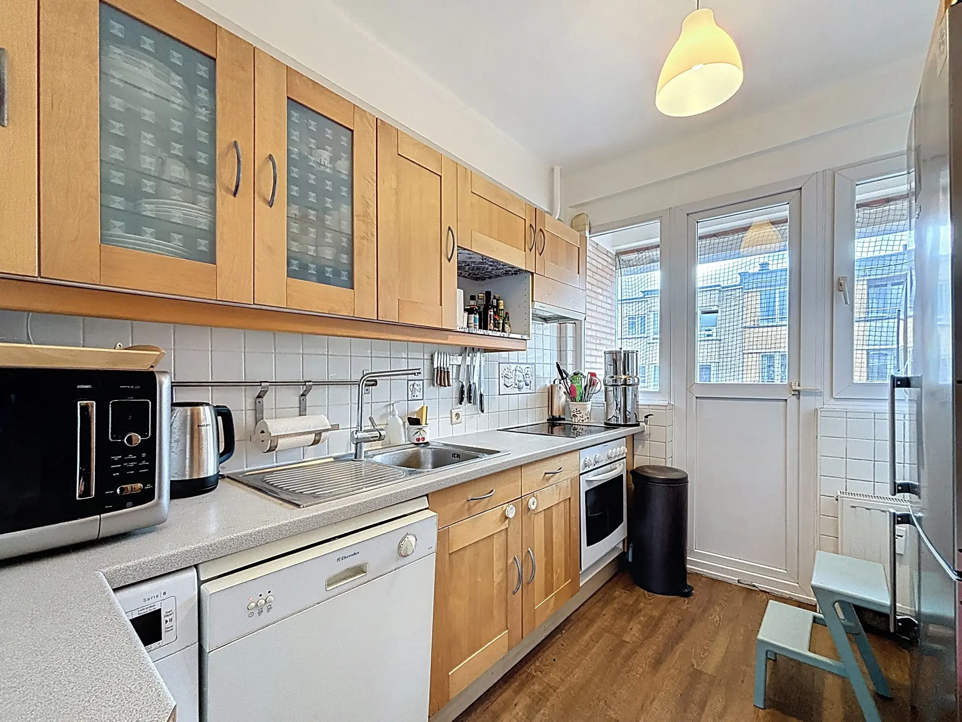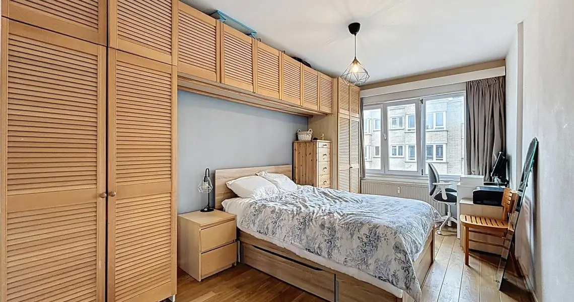 Le hall d’entrée, doté de rangements, mène à une spacieuse pièce de vie de ±45 m² baignée de lumière, offrant une vue dégagée sur la place. La cuisine équipée s’ouvre sur un balcon agréable. Côté nuit, deux grandes chambres de 15 m² et 14 m² et une salle de bain avec toilette complètent l’ensemble.