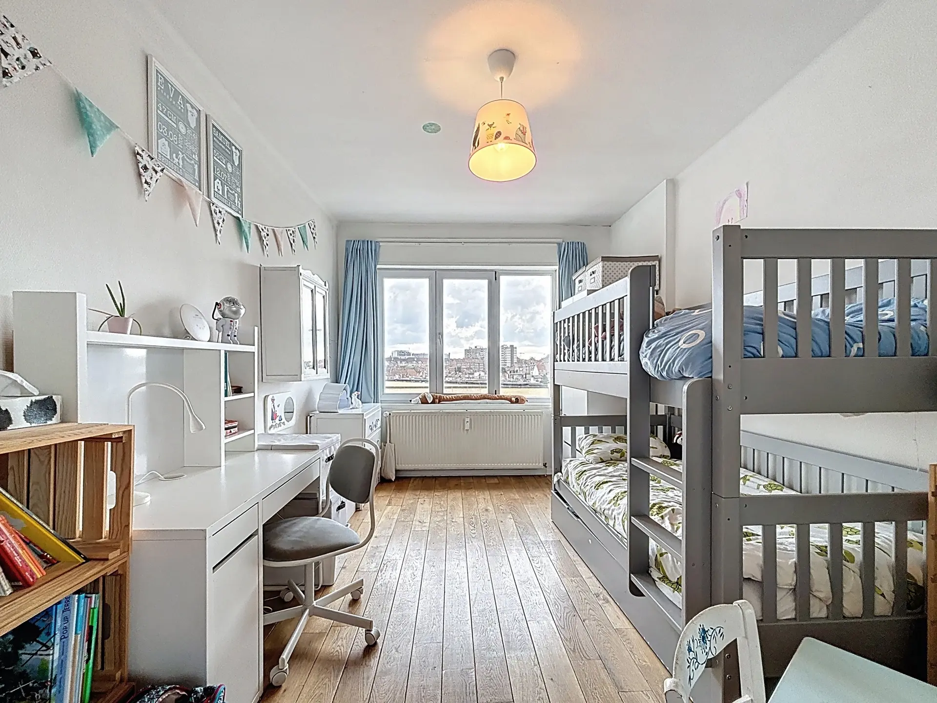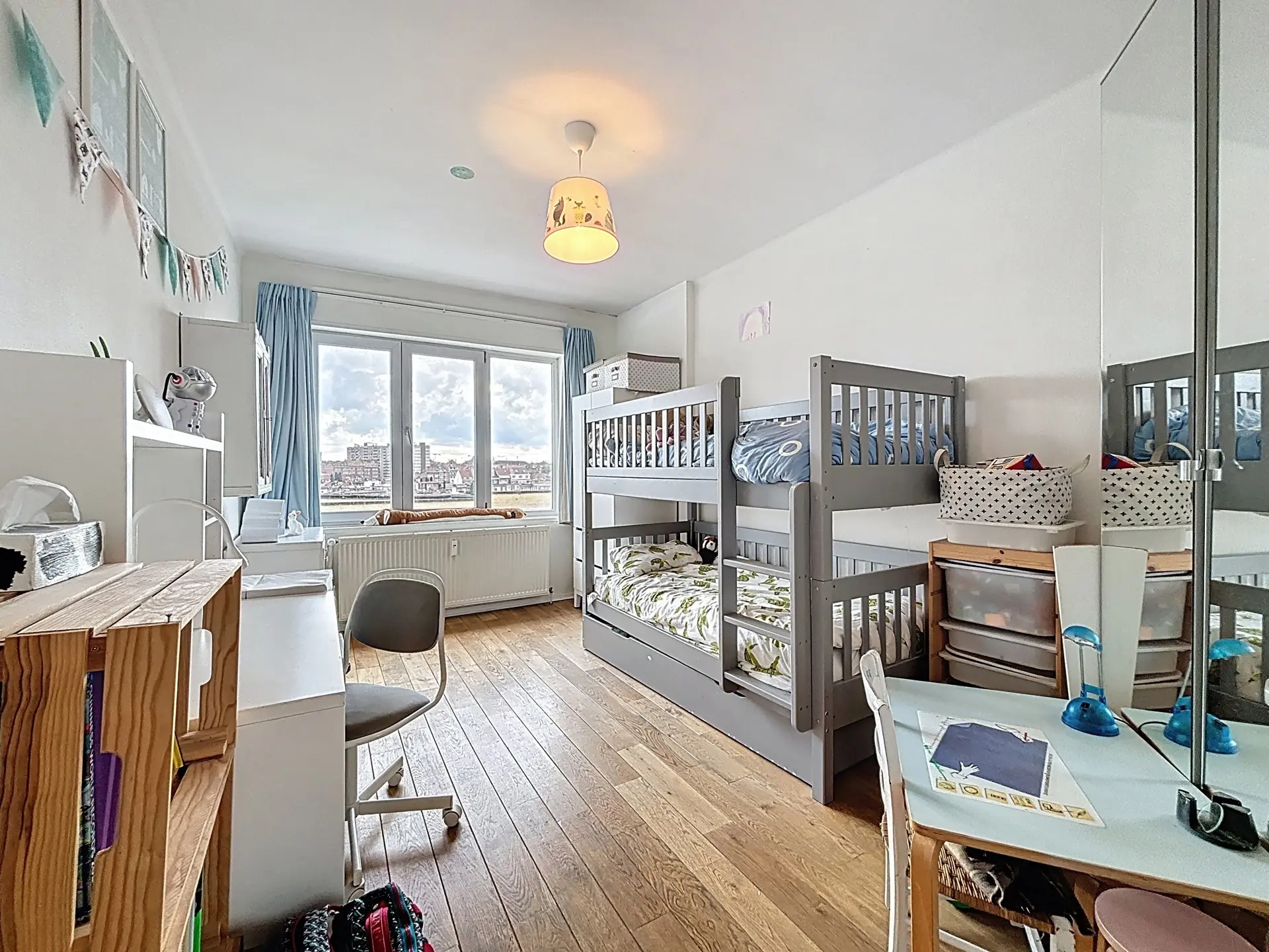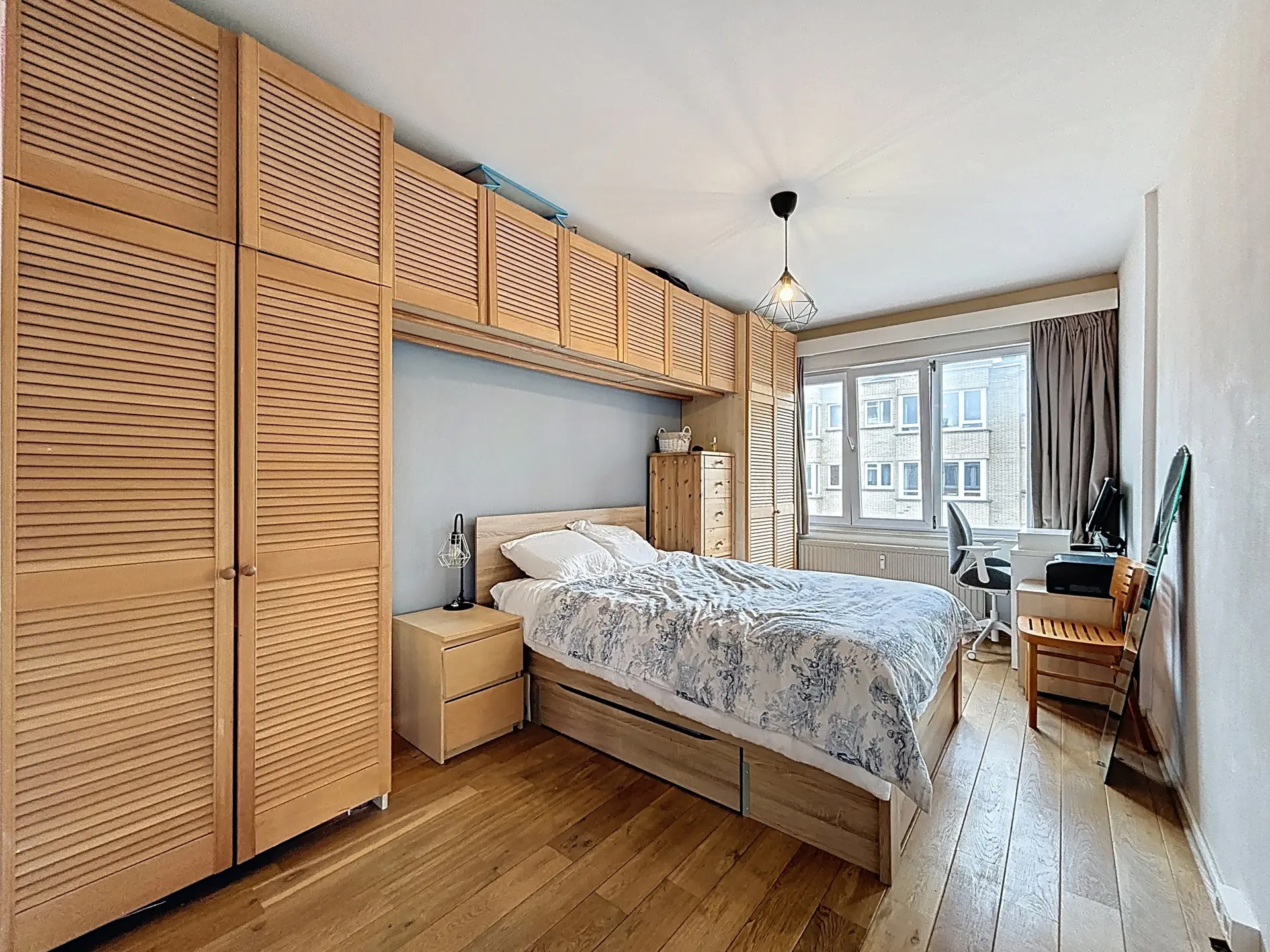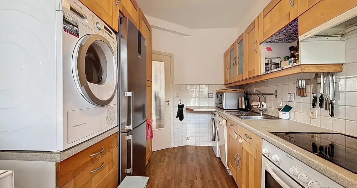 Le hall d’entrée, doté de rangements, mène à une spacieuse pièce de vie de ±45 m² baignée de lumière, offrant une vue dégagée sur la place. La cuisine équipée s’ouvre sur un balcon agréable. Côté nuit, deux grandes chambres de 15 m² et 14 m² et une salle de bain avec toilette complètent l’ensemble.