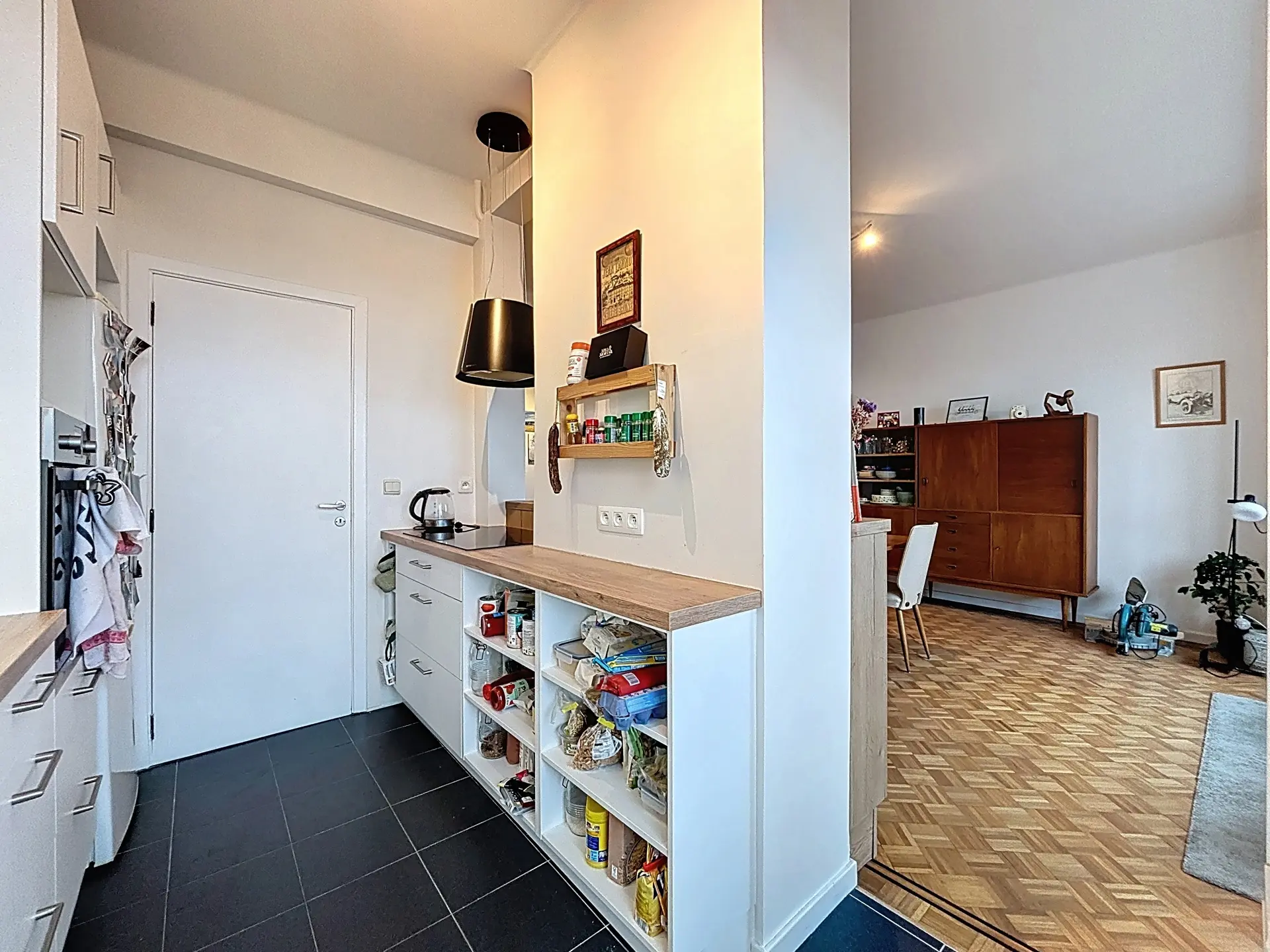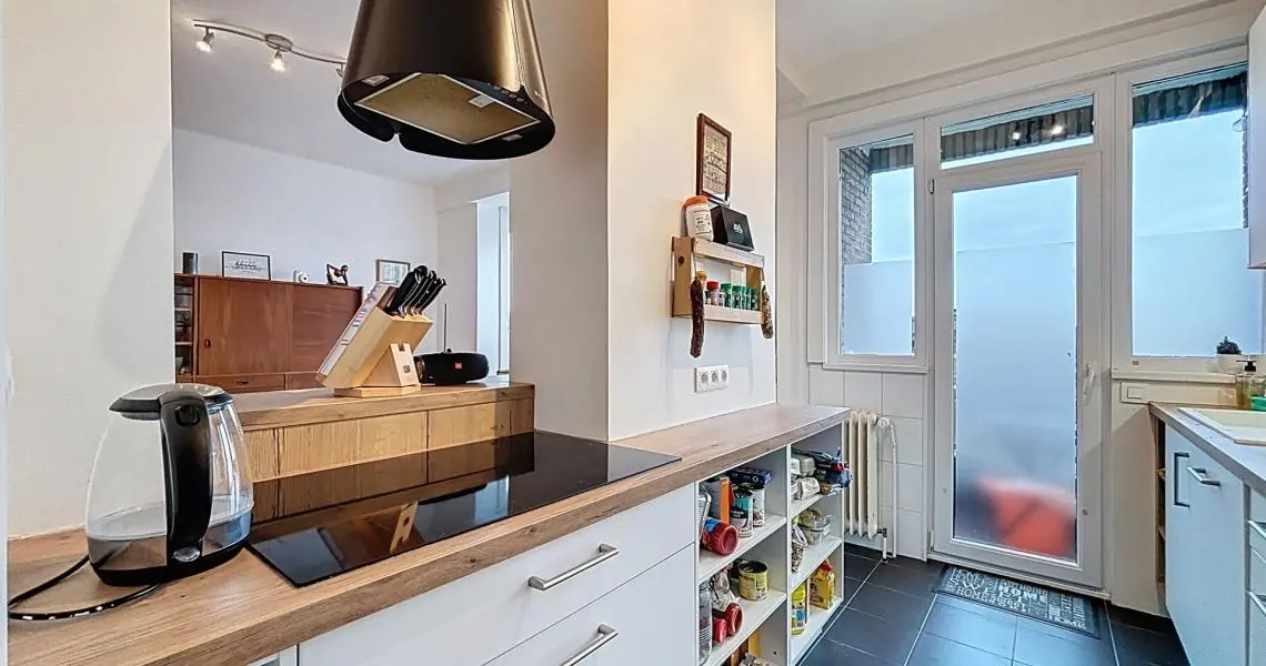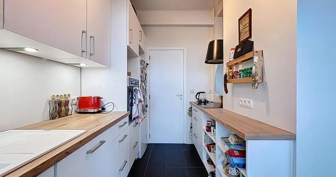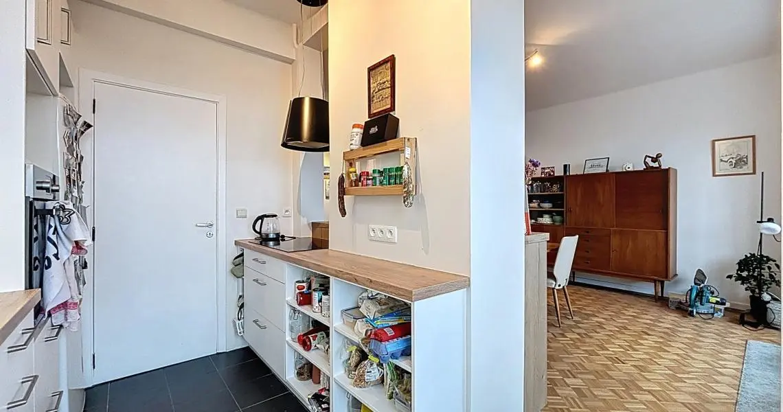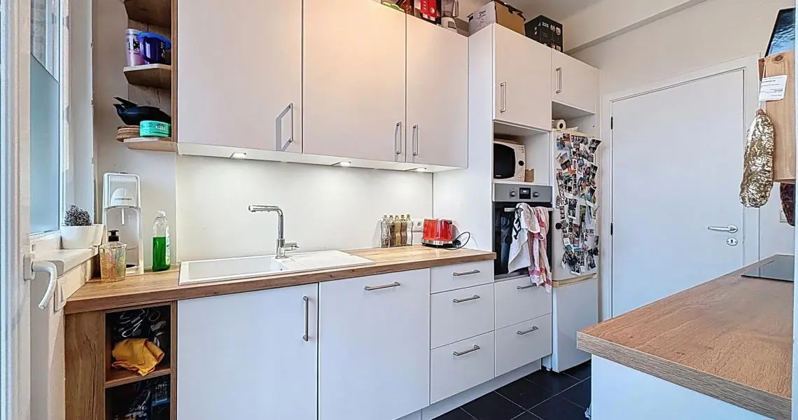 D'un hall, équipé de rangements intégrés, donnant sur une spacieuse pièce de vie de ±35 m² baignée de lumière accueillant une agréable cuisine ouverte super-équipée (IXINA – 2022) avec un agréable balcon.