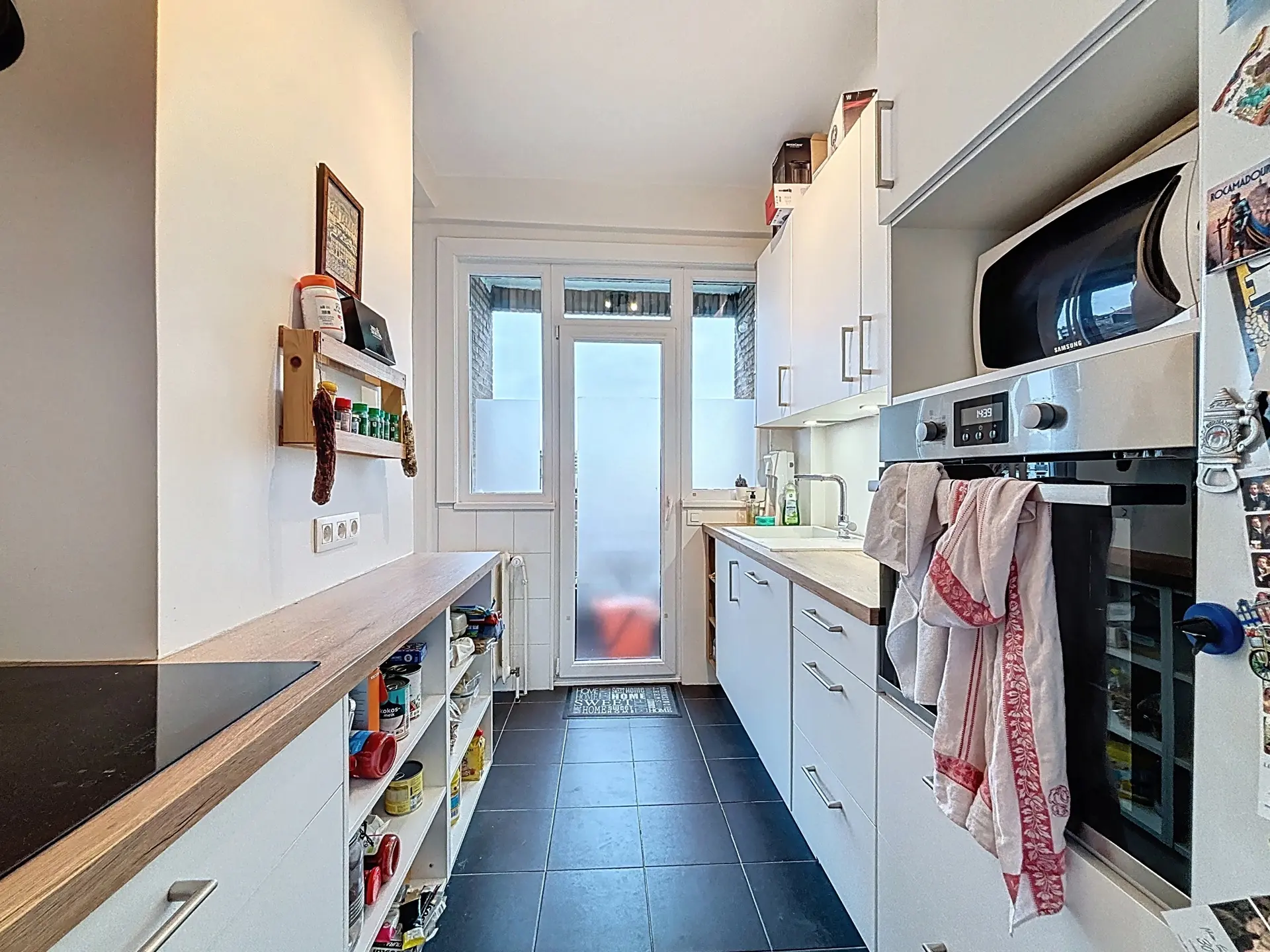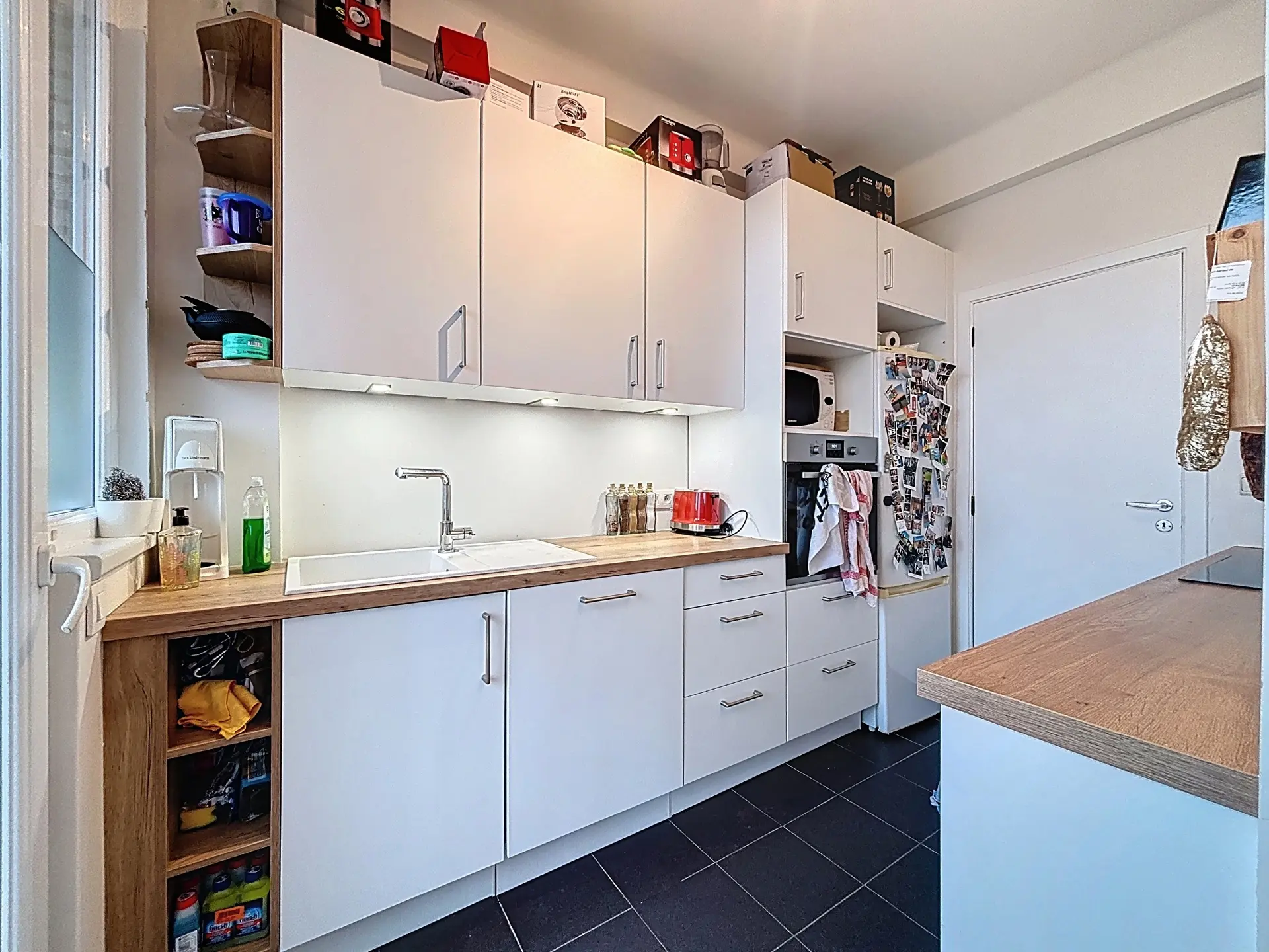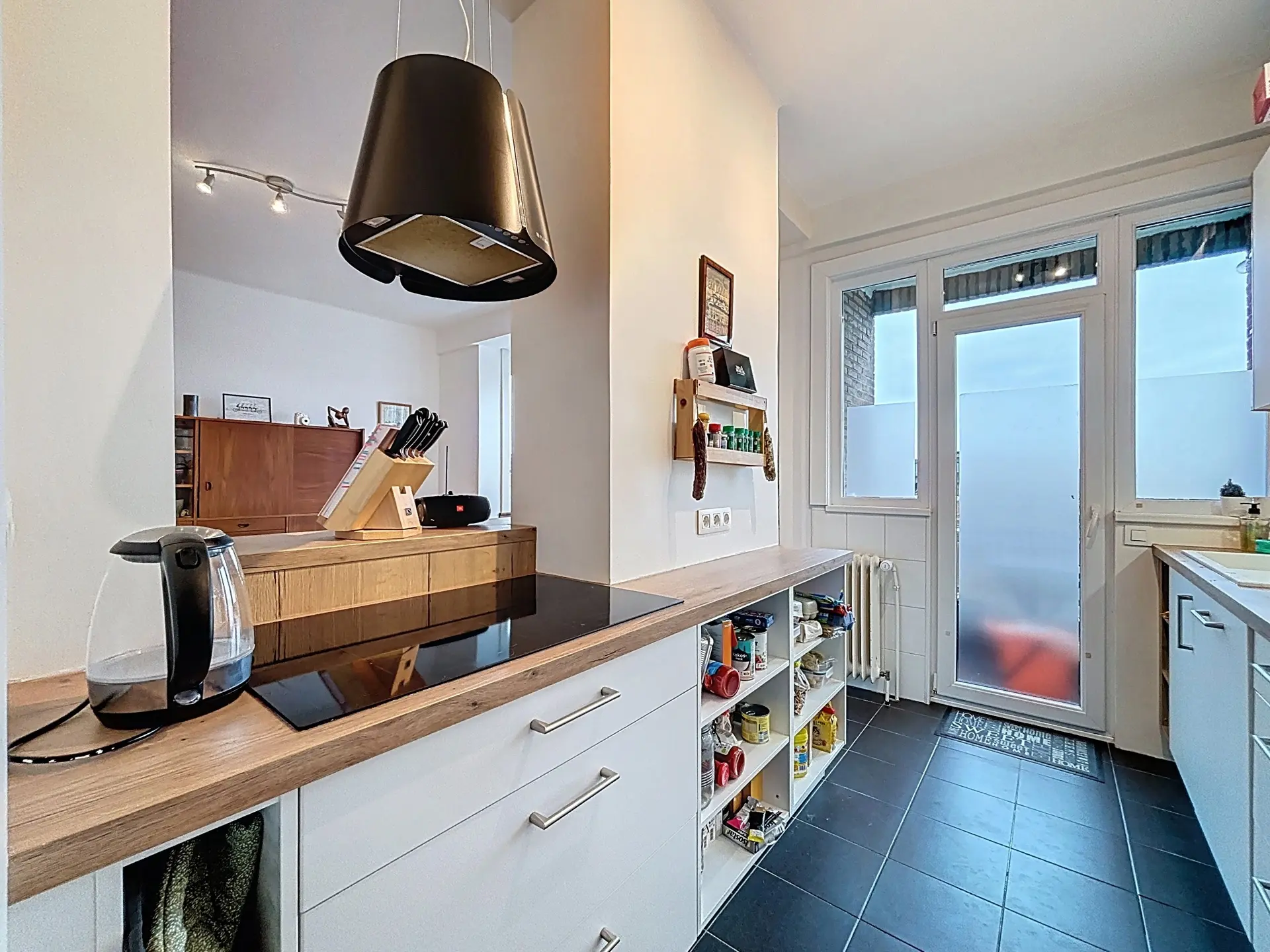 D'un hall, équipé de rangements intégrés, donnant sur une spacieuse pièce de vie de ±35 m² baignée de lumière accueillant une agréable cuisine ouverte super-équipée (IXINA – 2022) avec un agréable balcon.