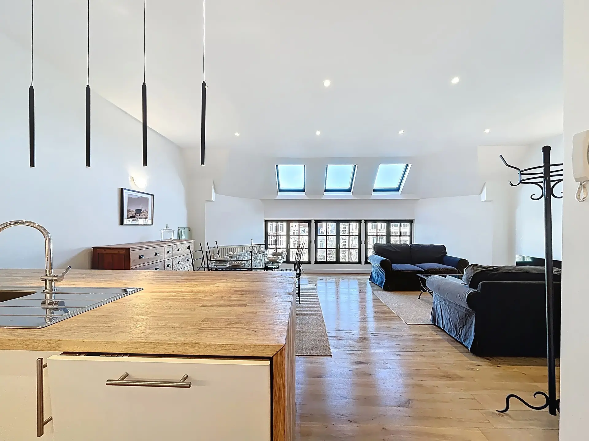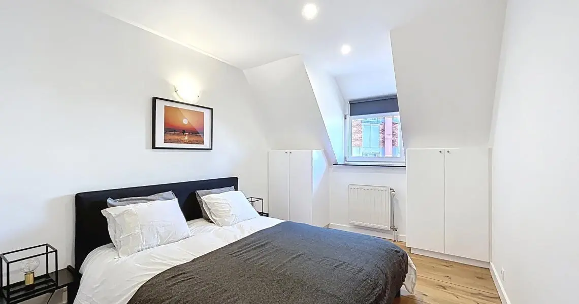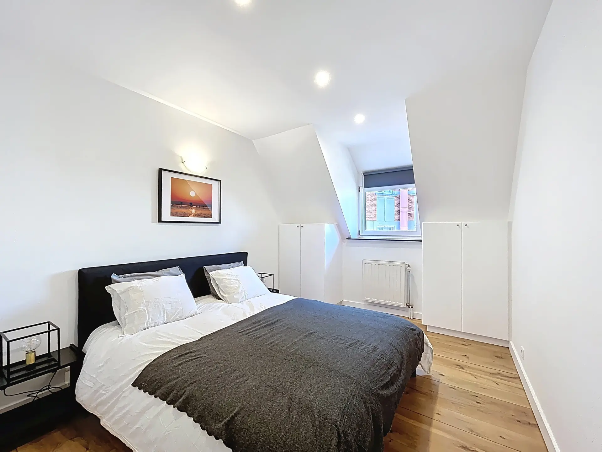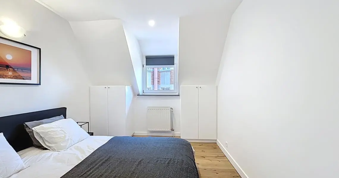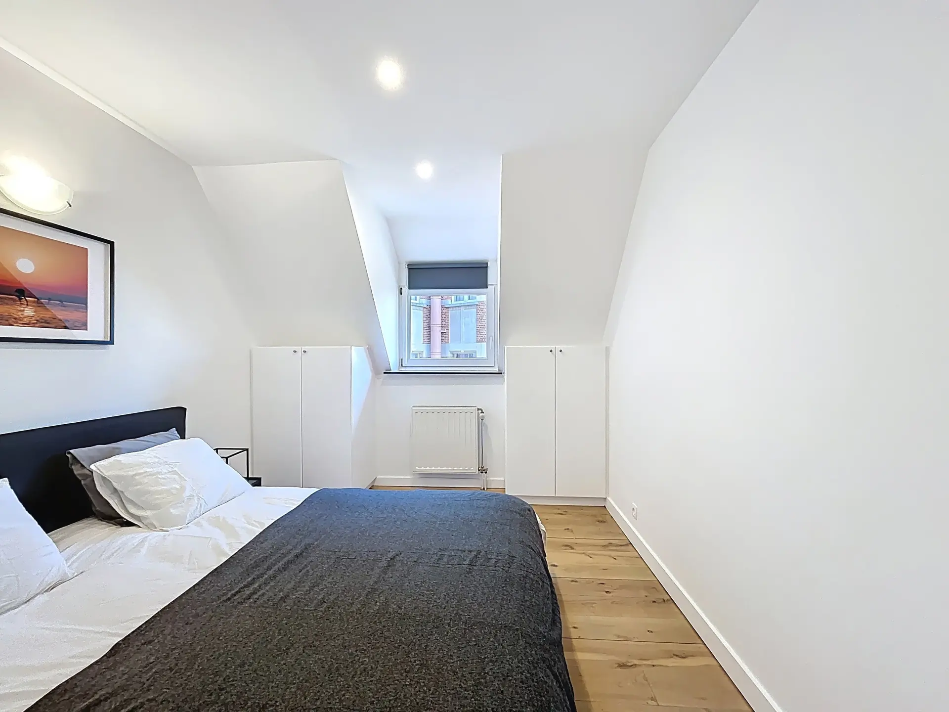 L’appartement comprend un spacieux séjour lumineux d’environ 32 m² avec cuisine ouverte entièrement équipée, avec machine à laver encastrée, ainsi qu’un hall de nuit avec WC séparé. Les deux chambres (± 17 m² et ± 10 m²) disposent toutes deux de placards encastrés. L’appartement dispose également d’une salle de douche avec douche à l’italienne et meuble lavabo. Chaudière individuelle au gaz – Châssis double vitrage – PEB “D”. Possibilité de louer un emplacement de parking pour 150 €/mois. Les charges s’élèvent à 140 €/mois pour l’ensemble des charges communes.