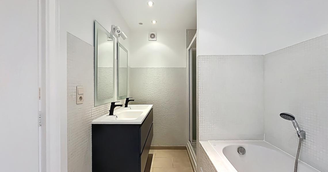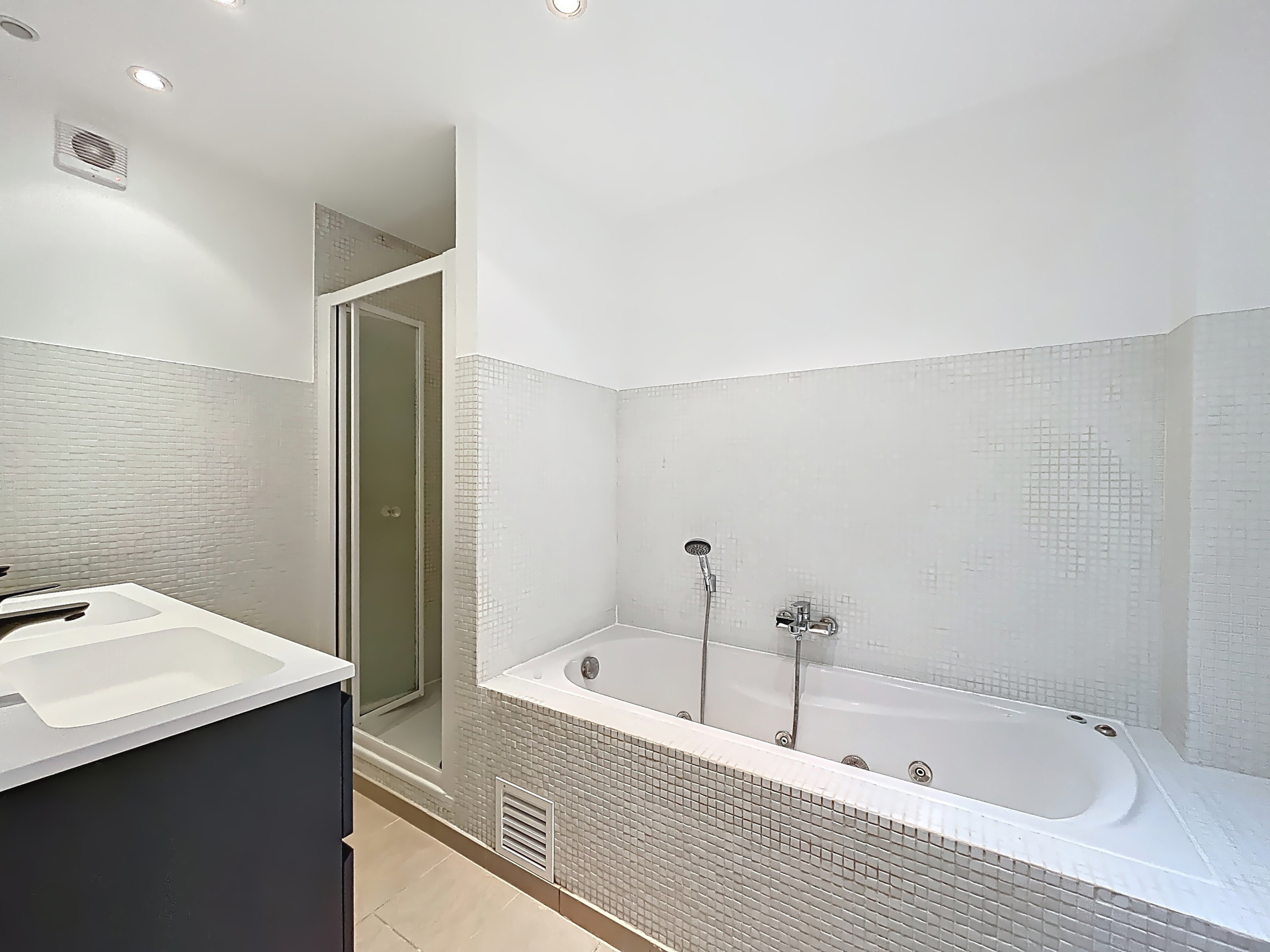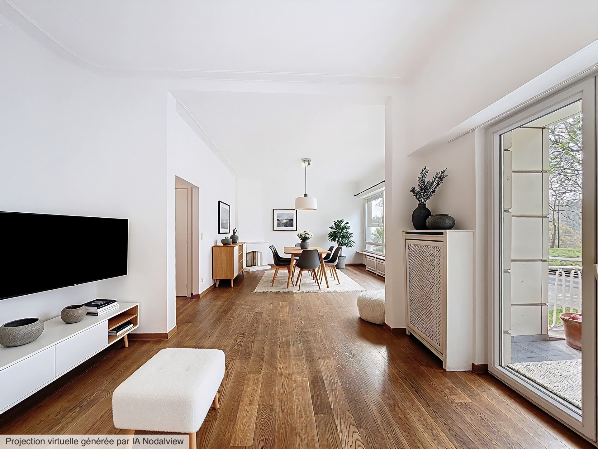 Il se compose d’un hall d’entrée, d’un spacieux et lumineux séjour d’environ 42 m² donnant accès à une terrasse d’environ 8 m² orientée plein sud, d’une cuisine entièrement équipée avec balcon, ainsi que d’un hall de nuit avec rangements desservant deux chambres (± 15 m² et ± 12 m²), une salle de bains équipée d’une baignoire, d’une douche et d’un meuble double vasque, et un WC séparé. L’appartement dispose également d’une cave en sous-sol et d’un emplacement de parking intérieur en option (130 €).