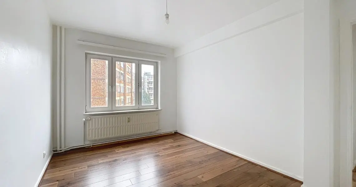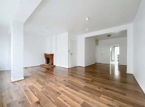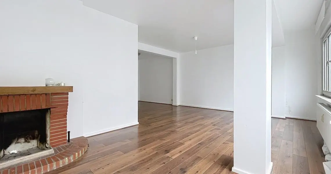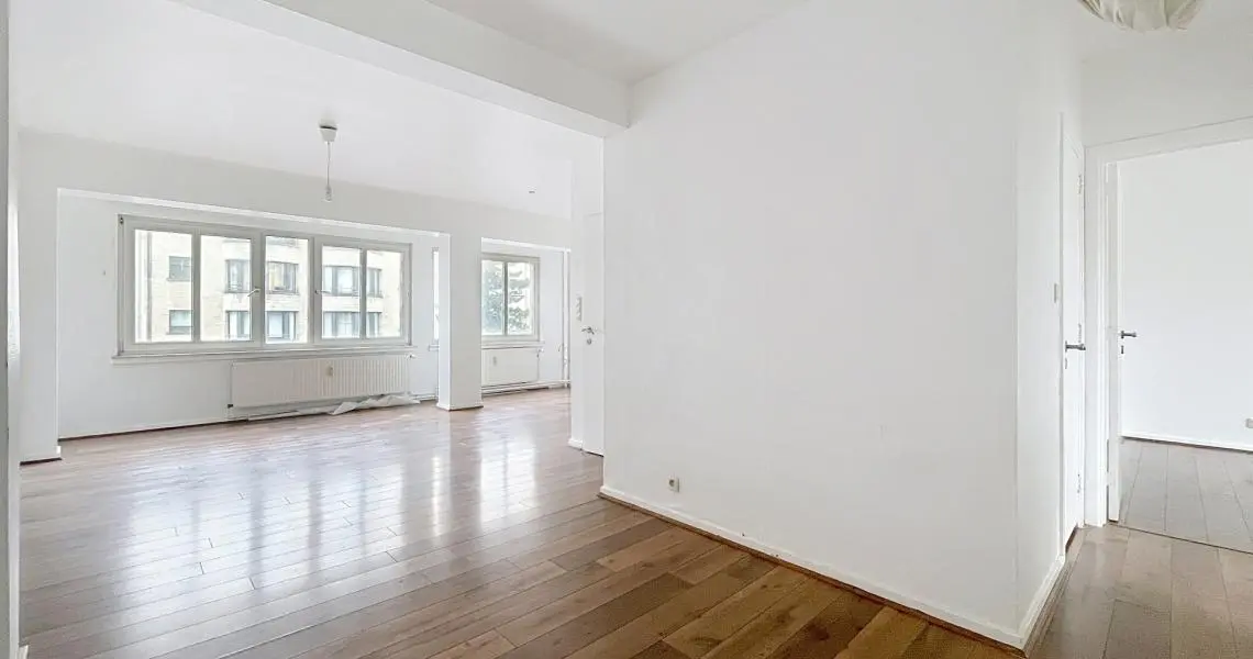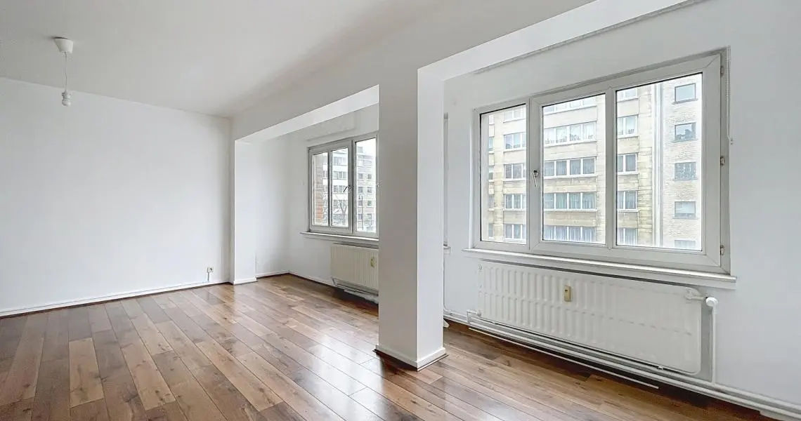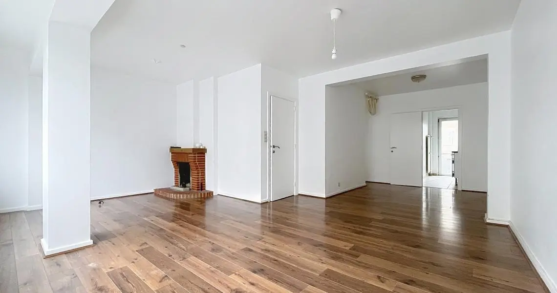 L’appartement séduit immédiatement par sa luminosité et son agencement. Celui-ci est composé d'un spacieux living avec cheminée ouverte sur une salle à manger d'un total de 33 m² d’une cuisine semi équipée de +/- 8 m² donnant accès à un petit balcon exposé Nord-Est, de deux chambres de +/- 14 m² et +/- 9 m², d'une salle de bain récemment rénovée, d'un WC séparé.