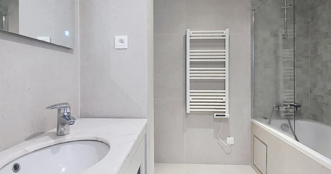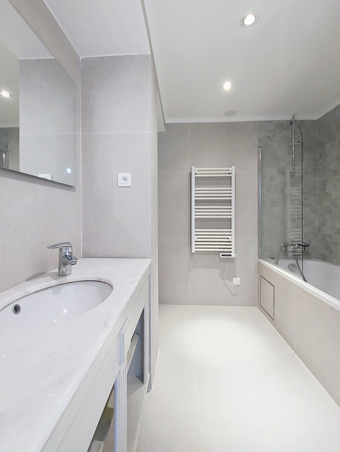 Une salle de bain équipée d’une baignoire/douche et WC, ainsi qu’un WC séparé, complètent le confort de l’appartement.