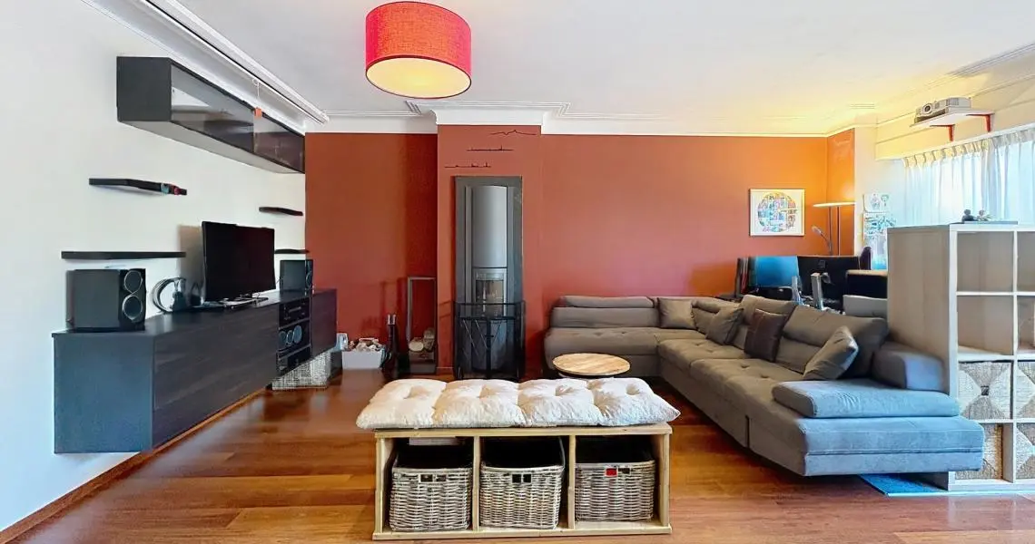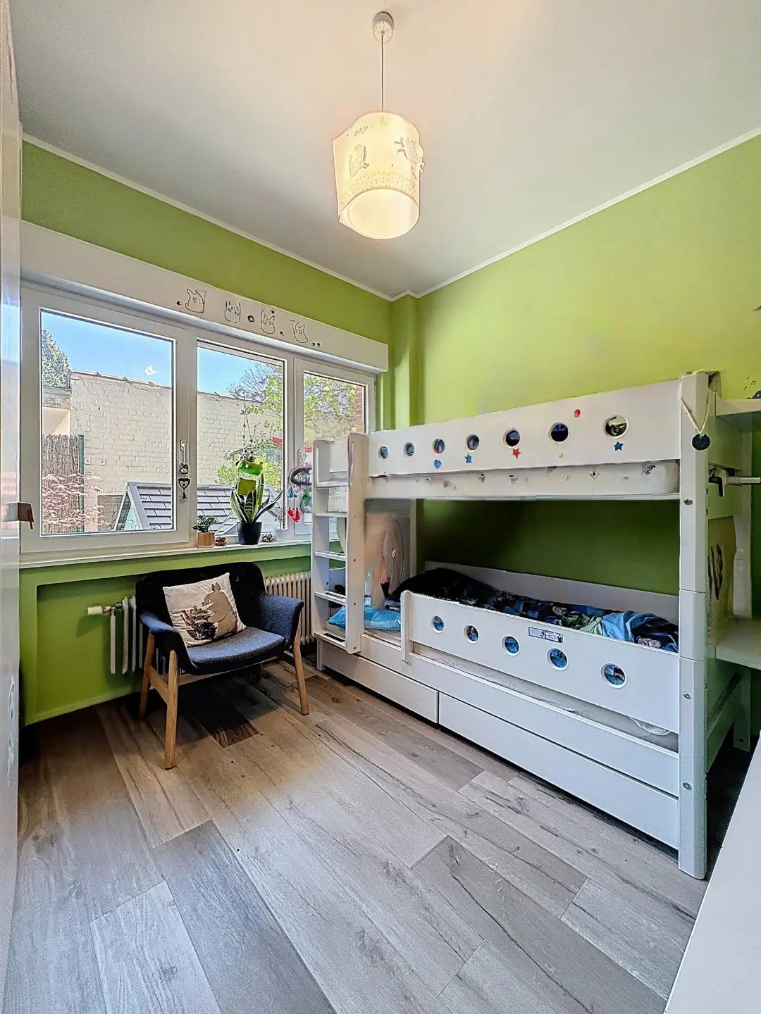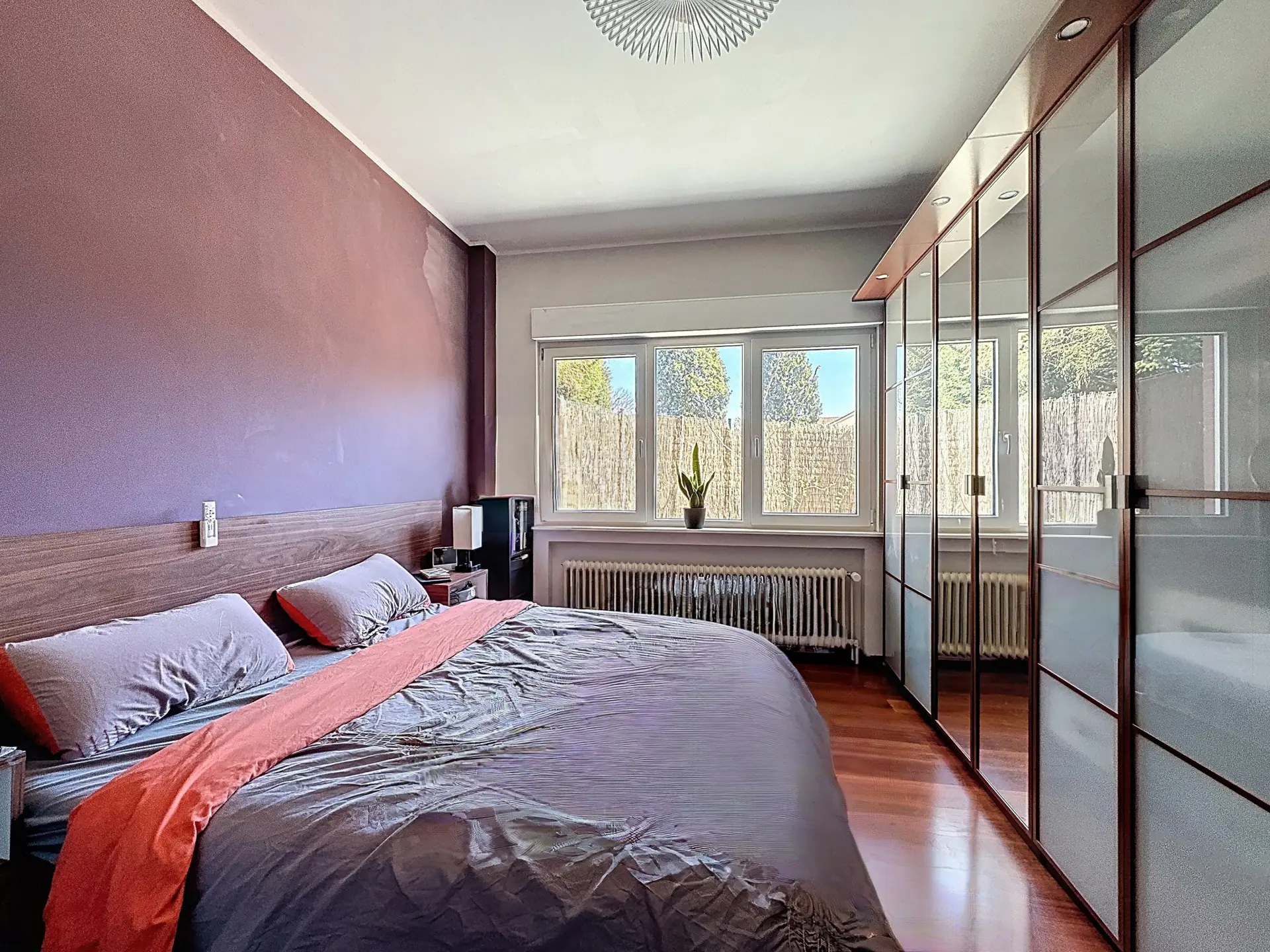 Il se compose : d'un grand hall d'entrée de +/- 10,5 m² donnant accès à un vestiaire et un WC séparé, d'un agréable séjour de +/- 40 m² avec feu ouvert, d'une grande cuisine super-équipée de +/- 10 m² avec un espace buanderie, d'un magnifique jardin avec terrasse exposé Est de +/- 40 m², d'un hall de nuit desservant une salle de bains de +/- 4 m² ainsi que 2 chambres à l'arrière de 13,5 m² et 10 m² + 1 grande cave de +/- 11 m². Un garage box fermé en supplément à 40 000€. Local vélo, local poubelle.