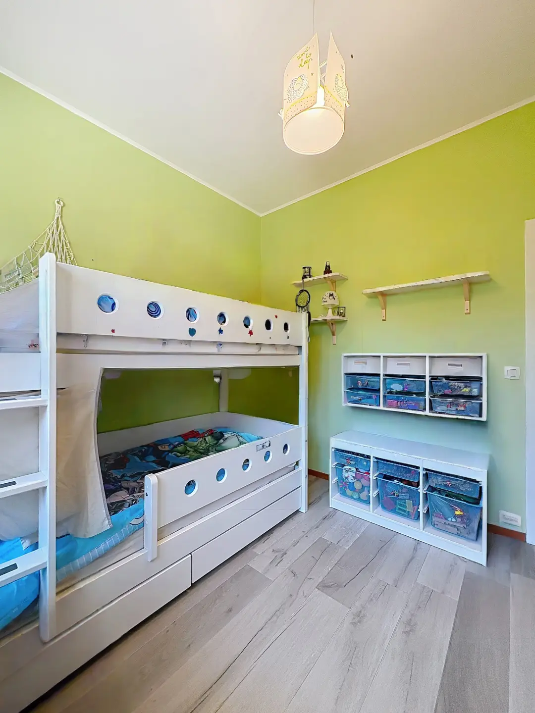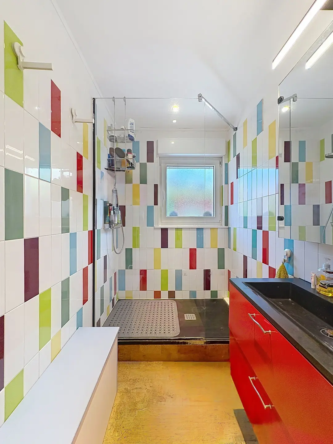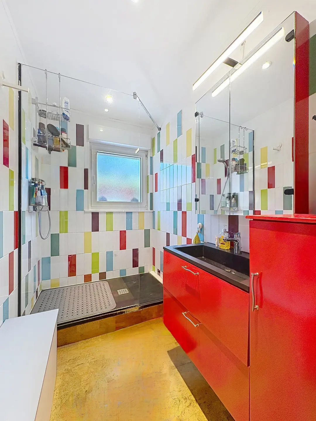 Il se compose : d'un grand hall d'entrée de +/- 10,5 m² donnant accès à un vestiaire et un WC séparé, d'un agréable séjour de +/- 40 m² avec feu ouvert, d'une grande cuisine super-équipée de +/- 10 m² avec un espace buanderie, d'un magnifique jardin avec terrasse exposé Est de +/- 40 m², d'un hall de nuit desservant une salle de bains de +/- 4 m² ainsi que 2 chambres à l'arrière de 13,5 m² et 10 m² + 1 grande cave de +/- 11 m². Un garage box fermé en supplément à 40 000€. Local vélo, local poubelle.