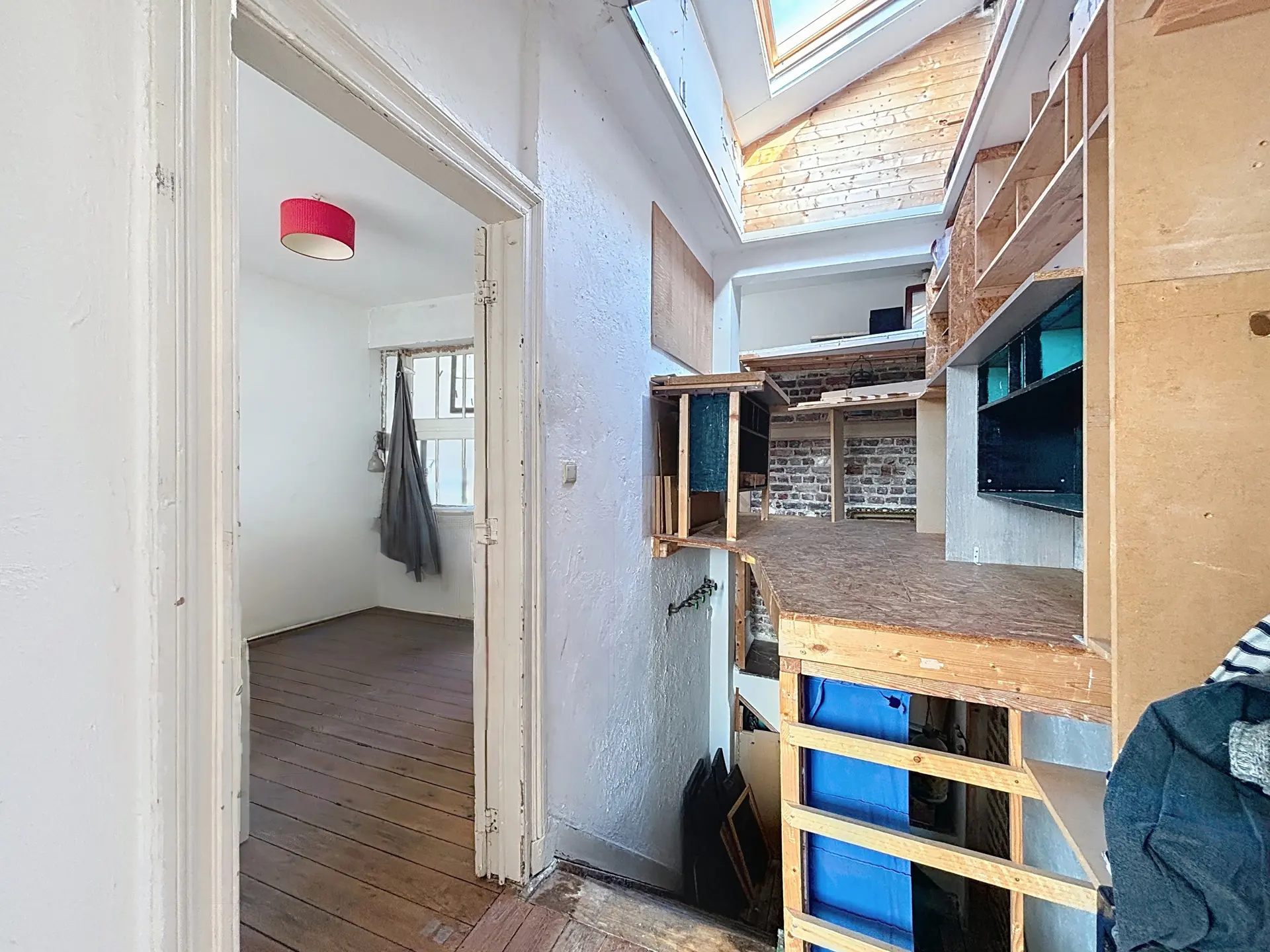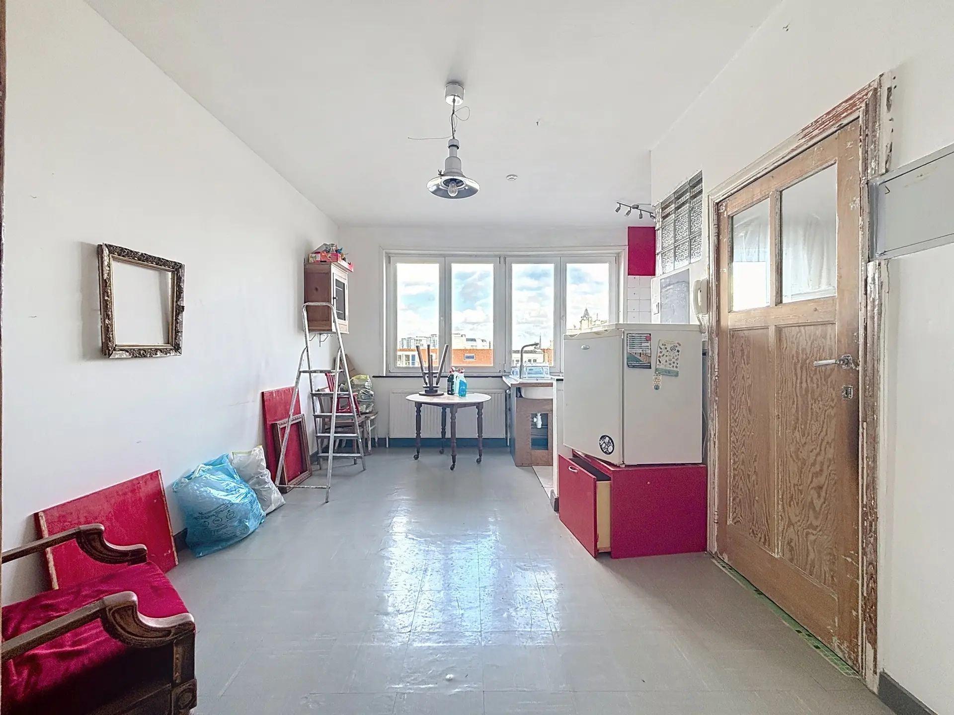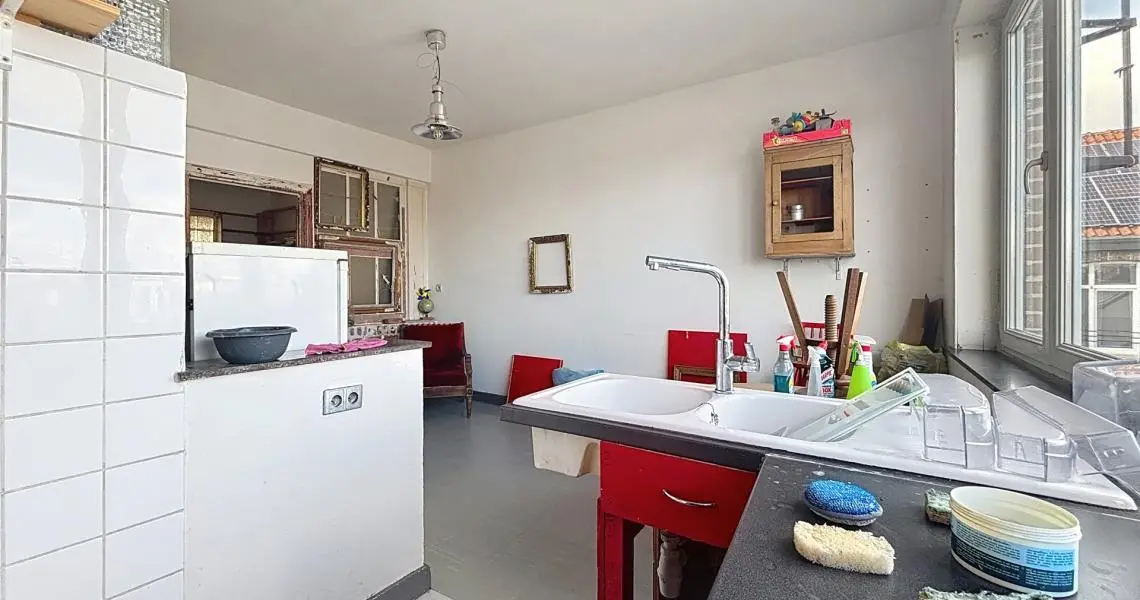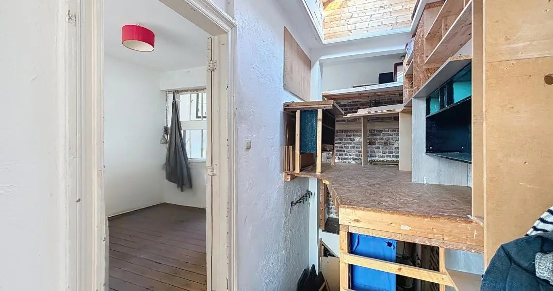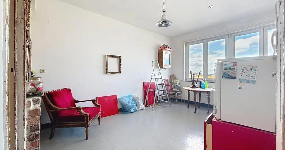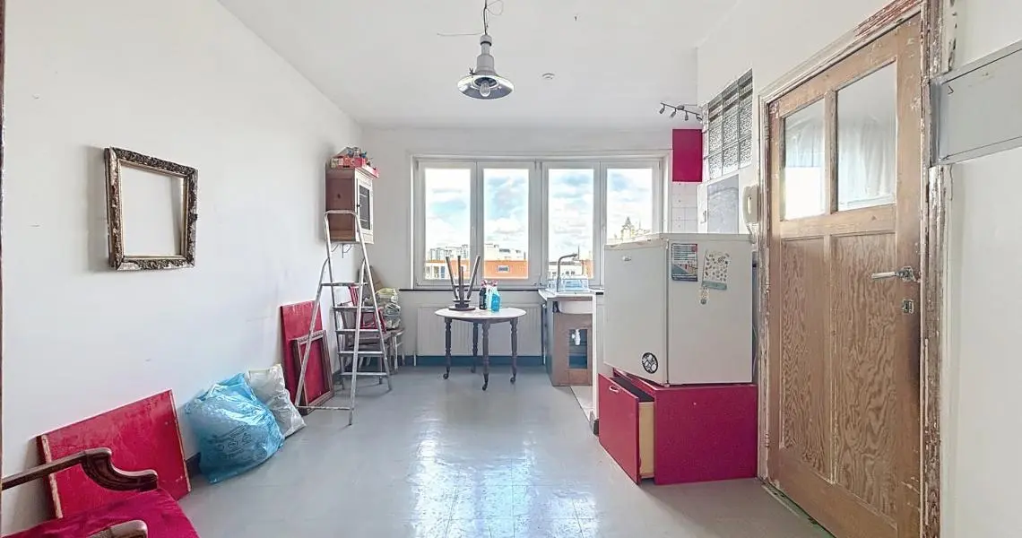 L'appartement se compose comme suit : Dès l'entrée, un hall dessert un premier espace de vie modulable, idéal pour un coin bureau ou une zone d'accueil, qui mène vers une seconde pièce de vie lumineuse. Cet espace ouvert intègre une cuisine à aménager ainsi qu'une salle de bain à moderniser. De l'autre côté se trouve une belle chambre baignée de lumière de +/- 14m², offrant un volume confortable.