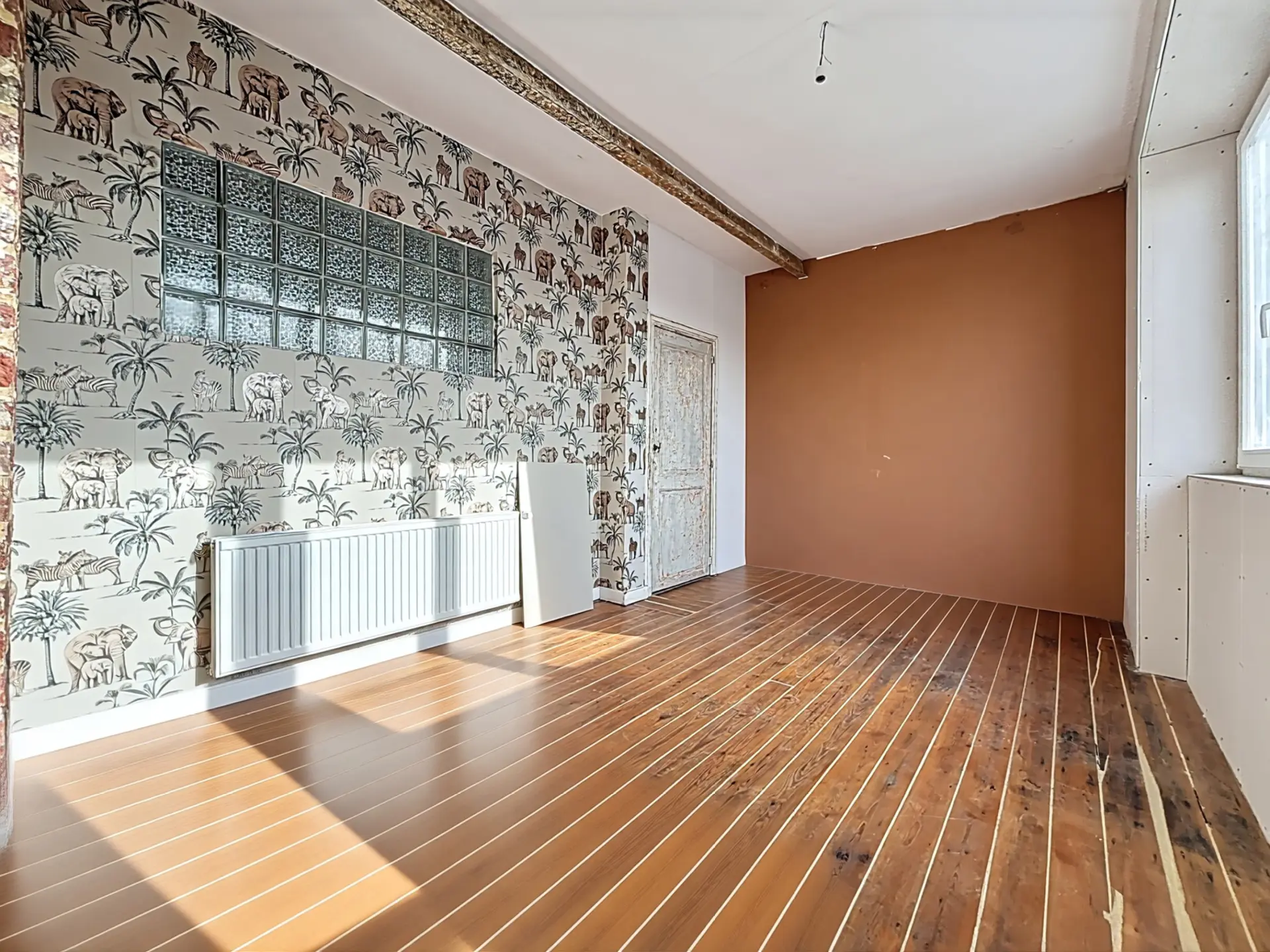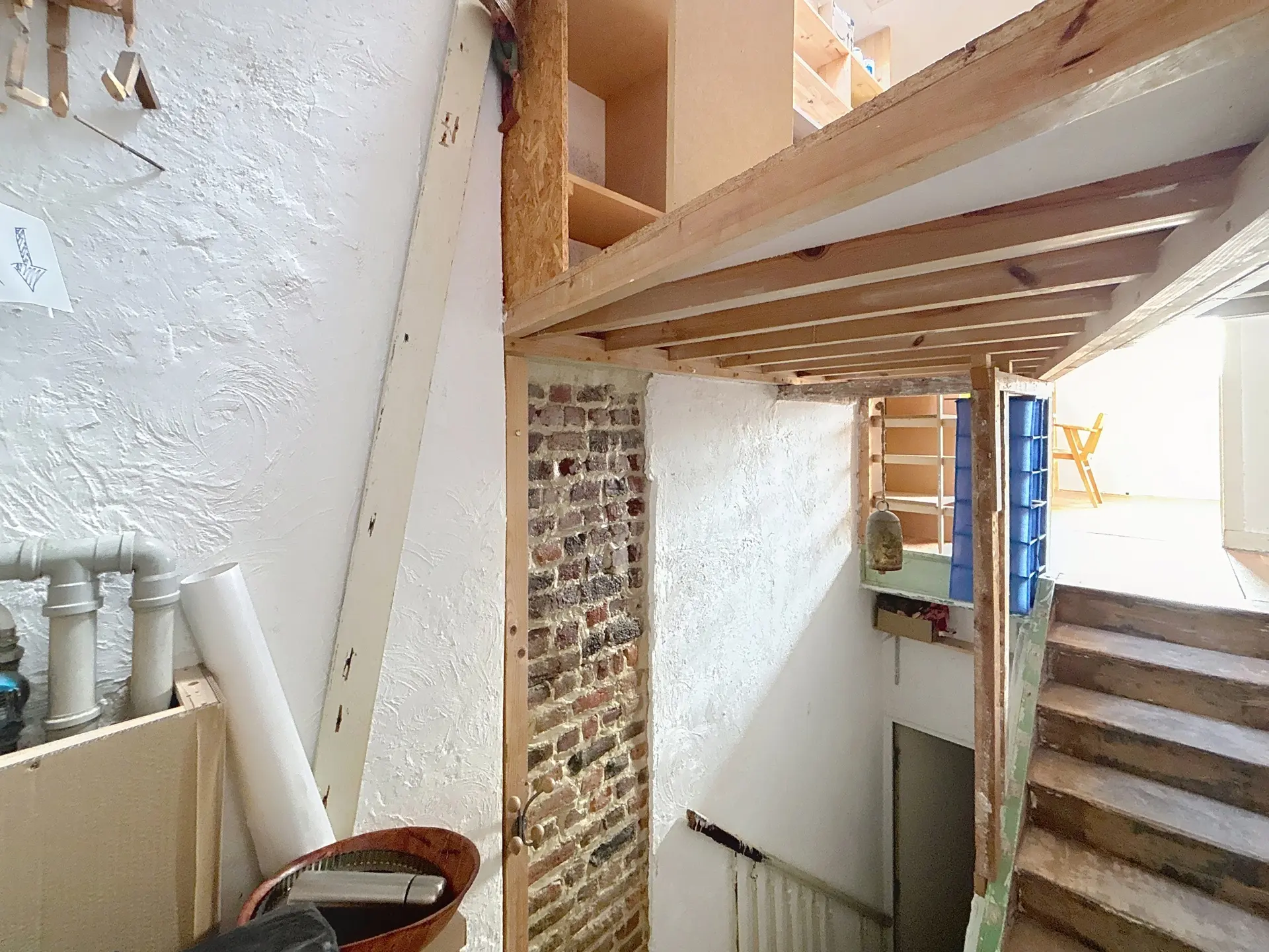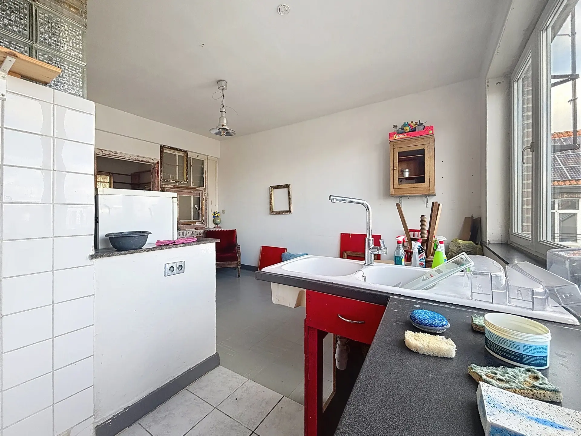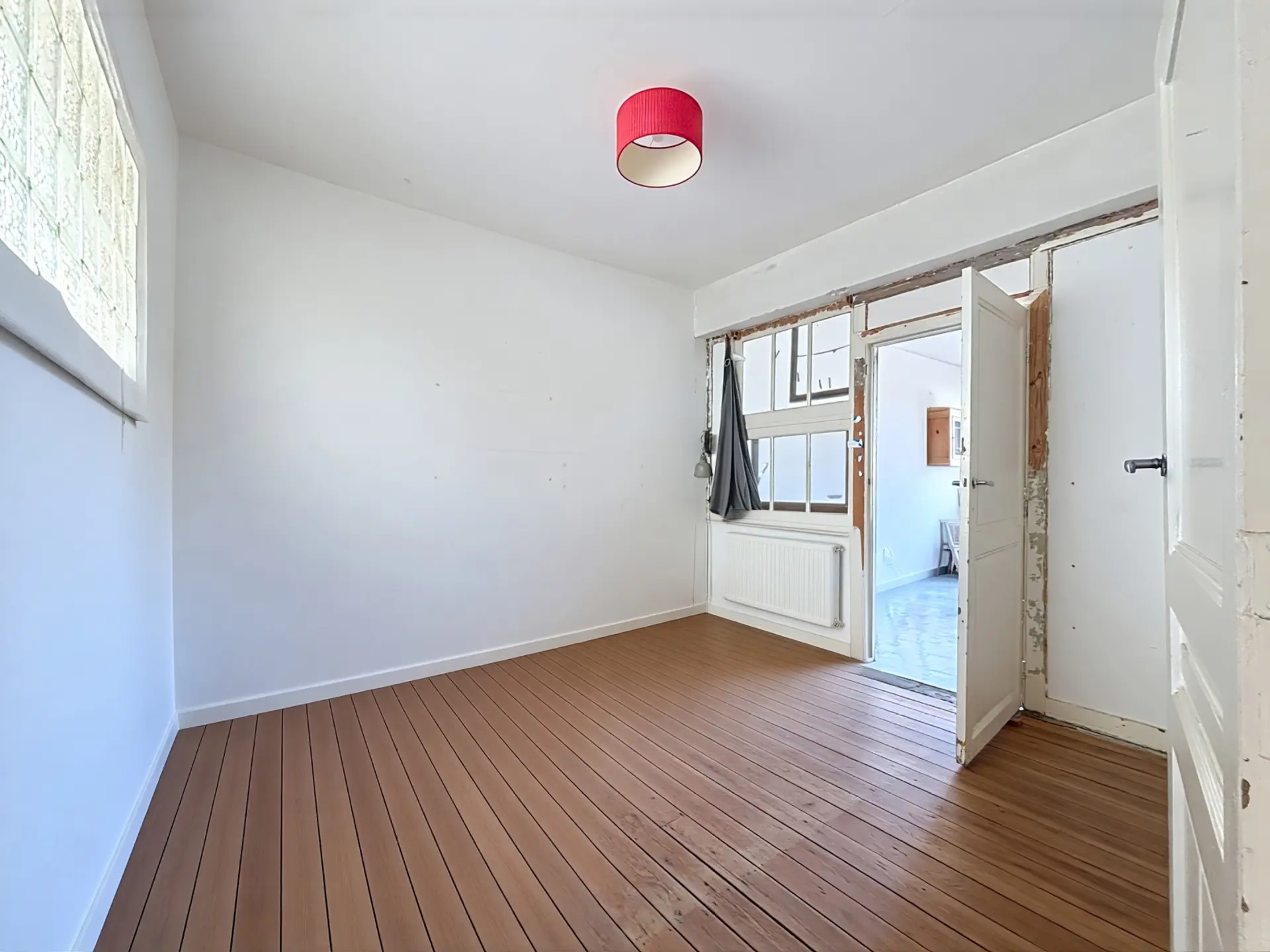 L'appartement se compose comme suit : Dès l'entrée, un hall dessert un premier espace de vie modulable, idéal pour un coin bureau ou une zone d'accueil, qui mène vers une seconde pièce de vie lumineuse. Cet espace ouvert intègre une cuisine à aménager ainsi qu'une salle de bain à moderniser. De l'autre côté se trouve une belle chambre baignée de lumière de +/- 14m², offrant un volume confortable.