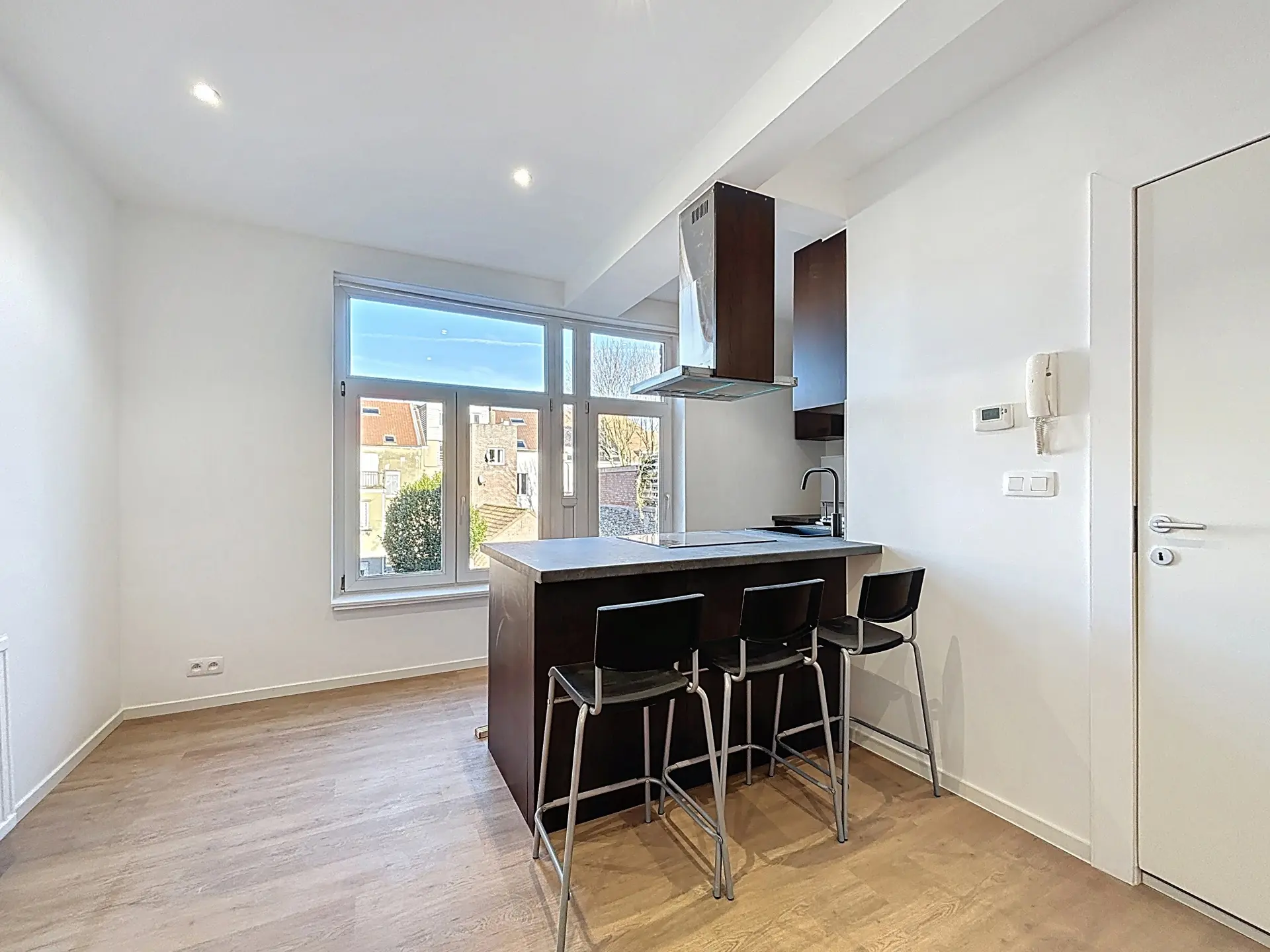 L'appartement se compose comme suit : Dès l'entrée, un spacieux espace de vie de +/-35m2 vous accueillera avec sa nouvelle cuisine américaine super-équipée, un espace technique pouvant servir de buanderie, une lumineuse chambre de +/-17m2 avec sa salle de douche attenante + WC.