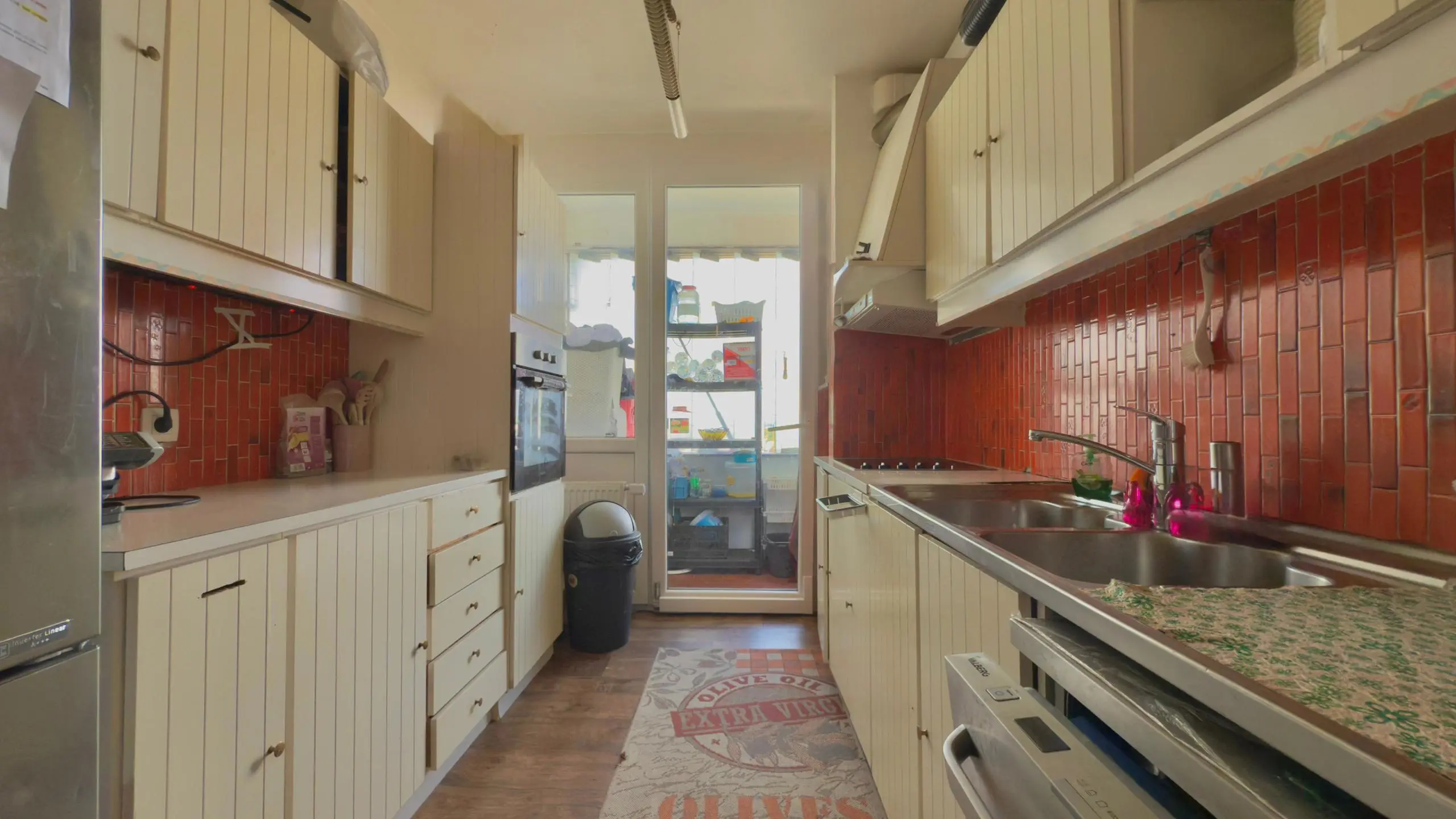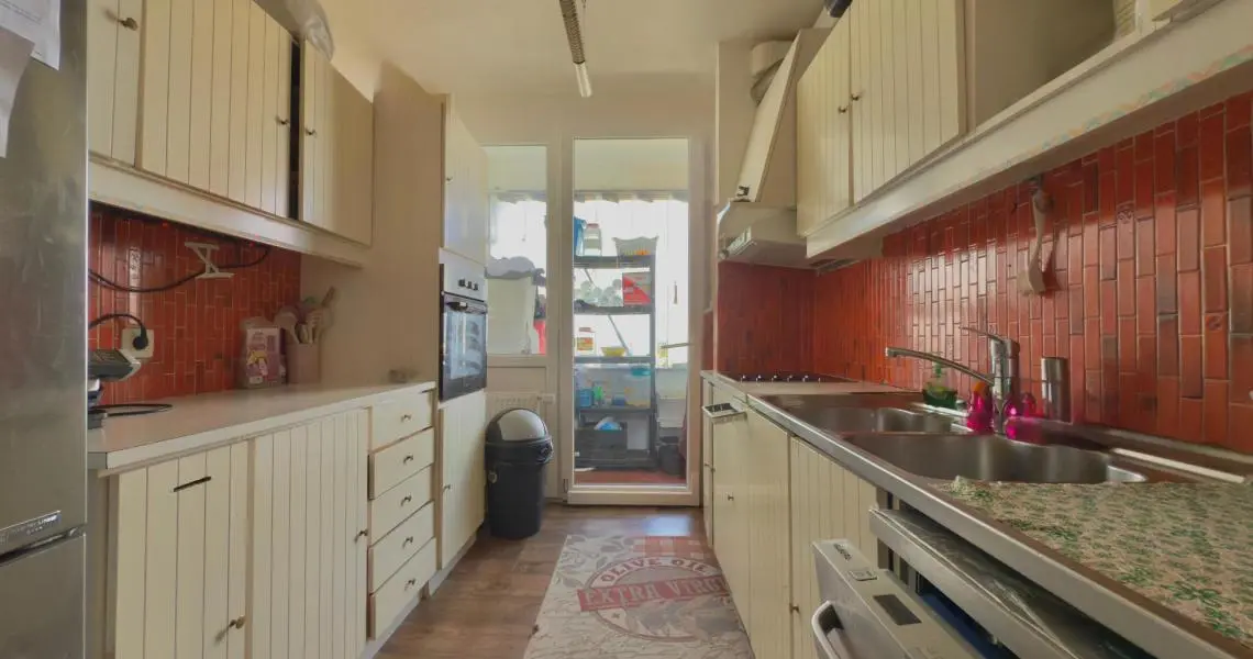 Une cuisine équipée avec accès à un balcon fermé de ±5 m²,