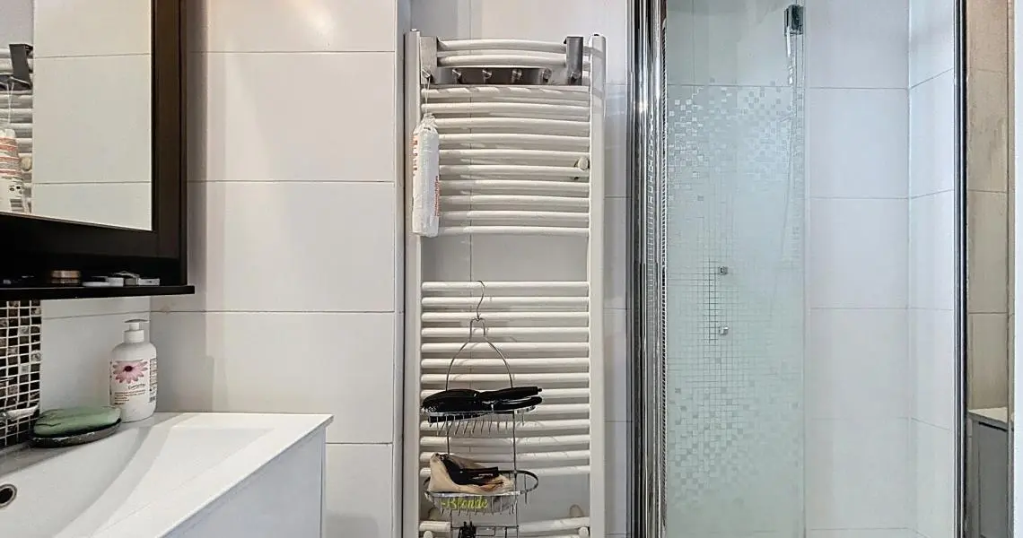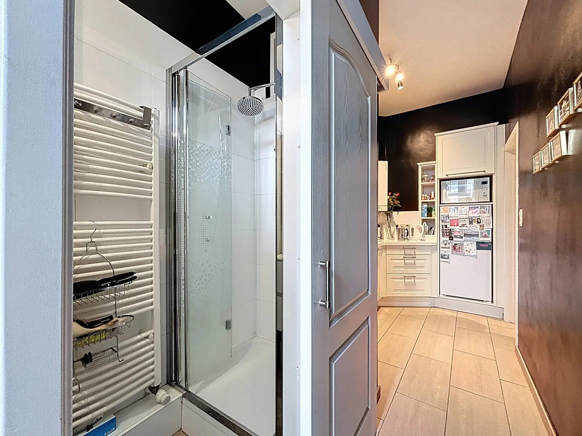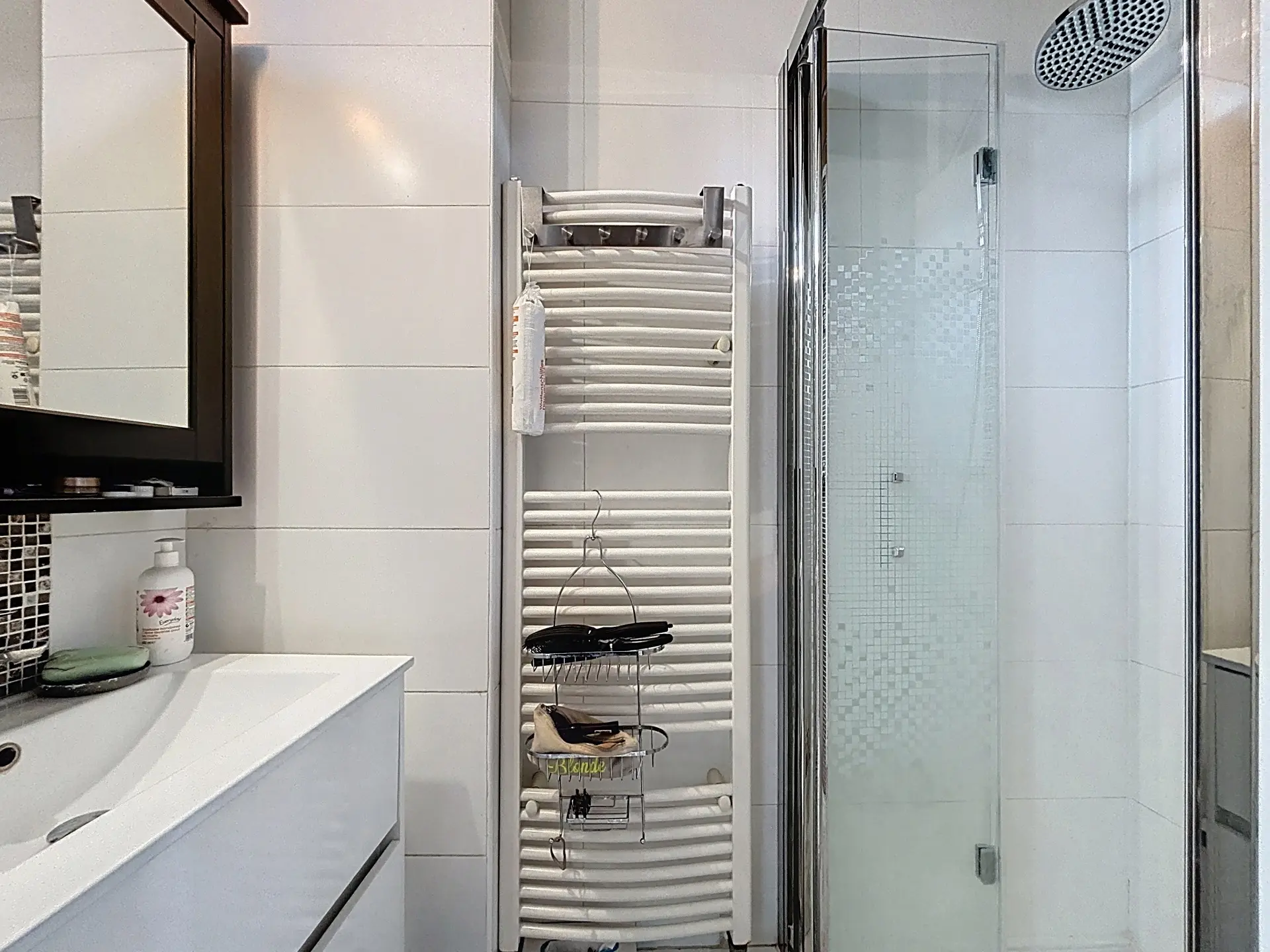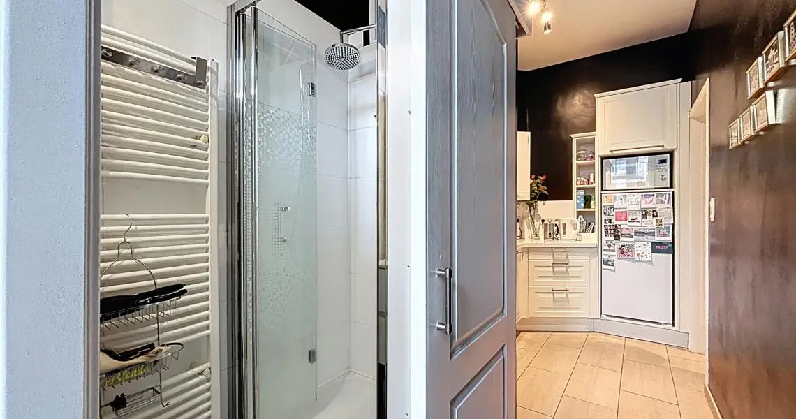 L’appartement dispose également d’une salle de douche avec meuble lavabo, ainsi qu’un WC séparé.