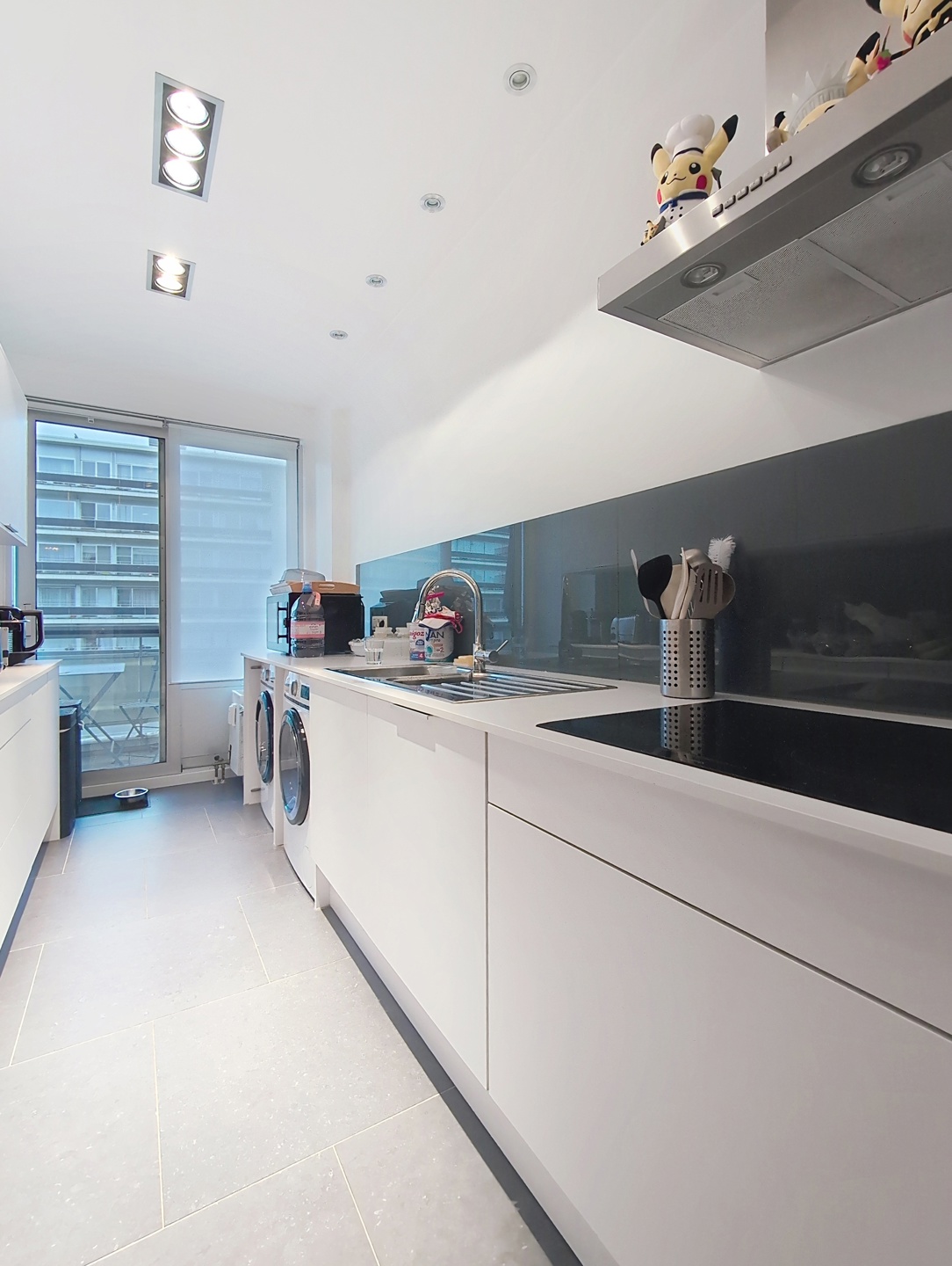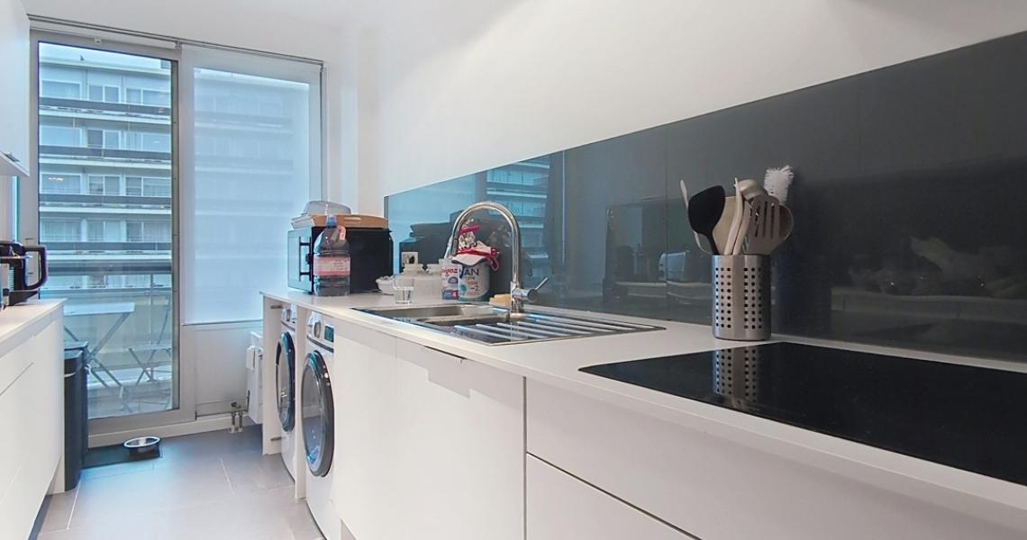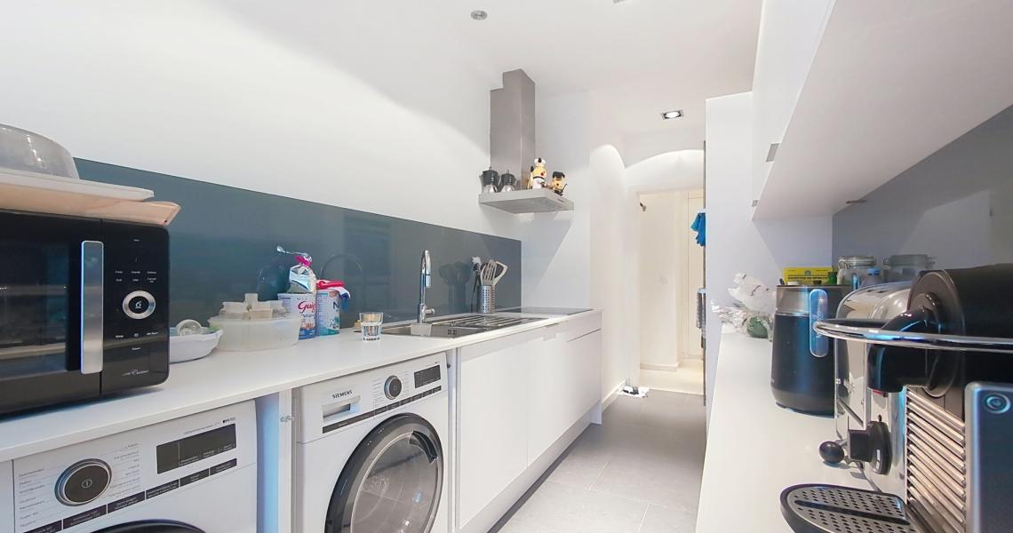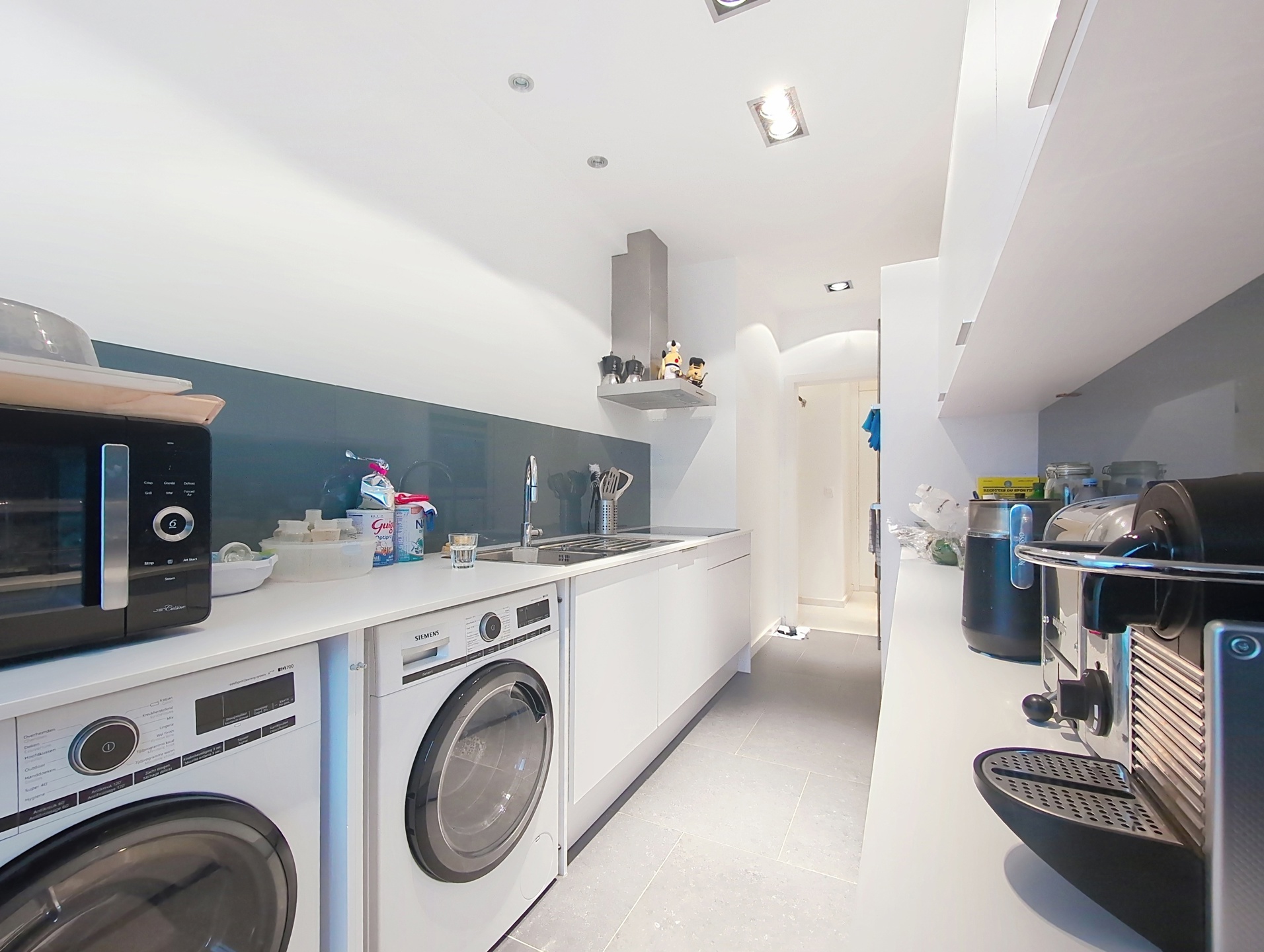 Il se compose d’un hall d’entrée avec placards, d’un séjour spacieux et lumineux comprenant salon et salle à manger de ± 30 m², ainsi que d’une cuisine entièrement équipée.