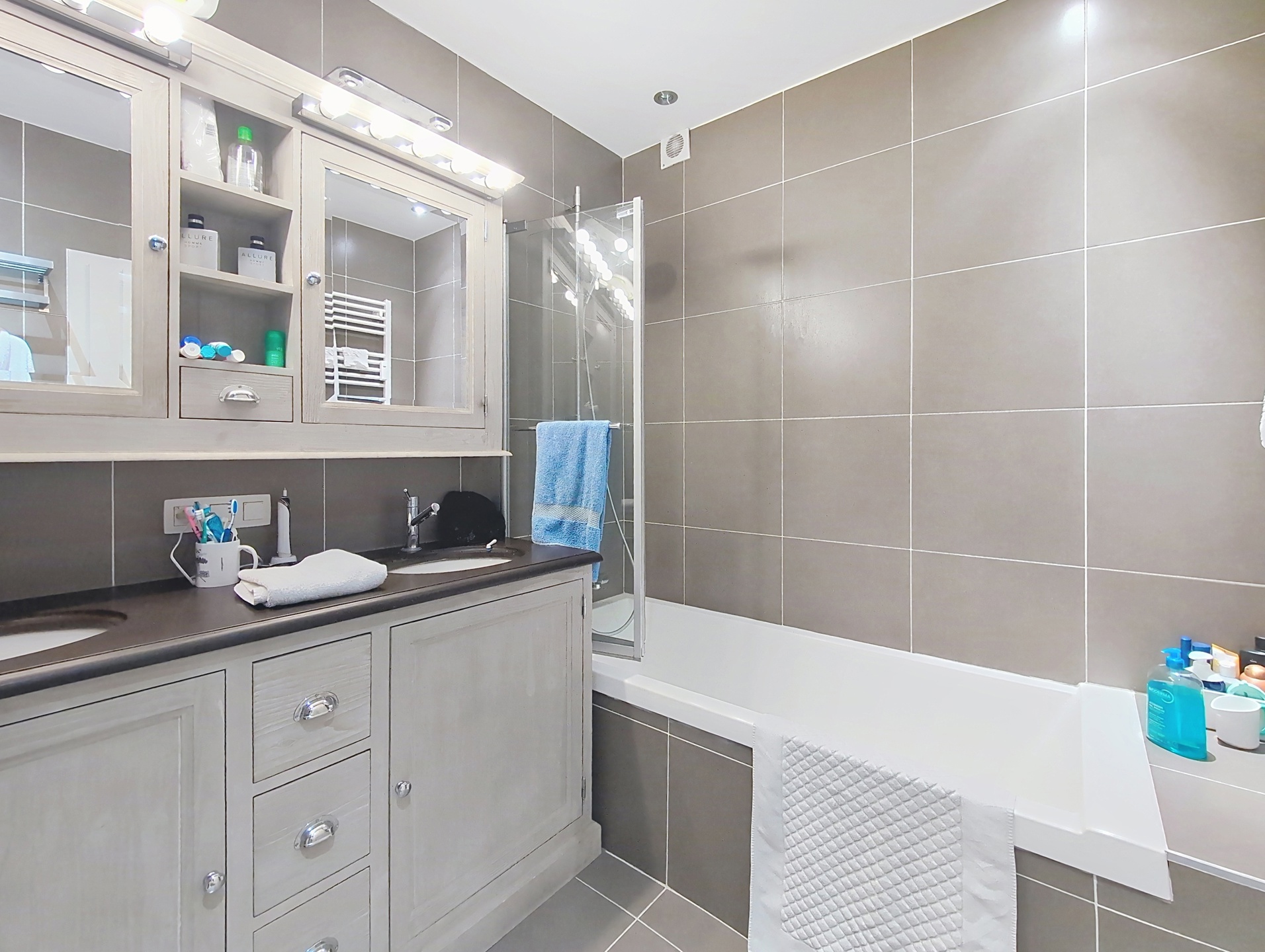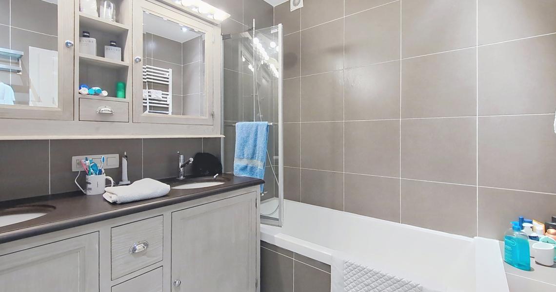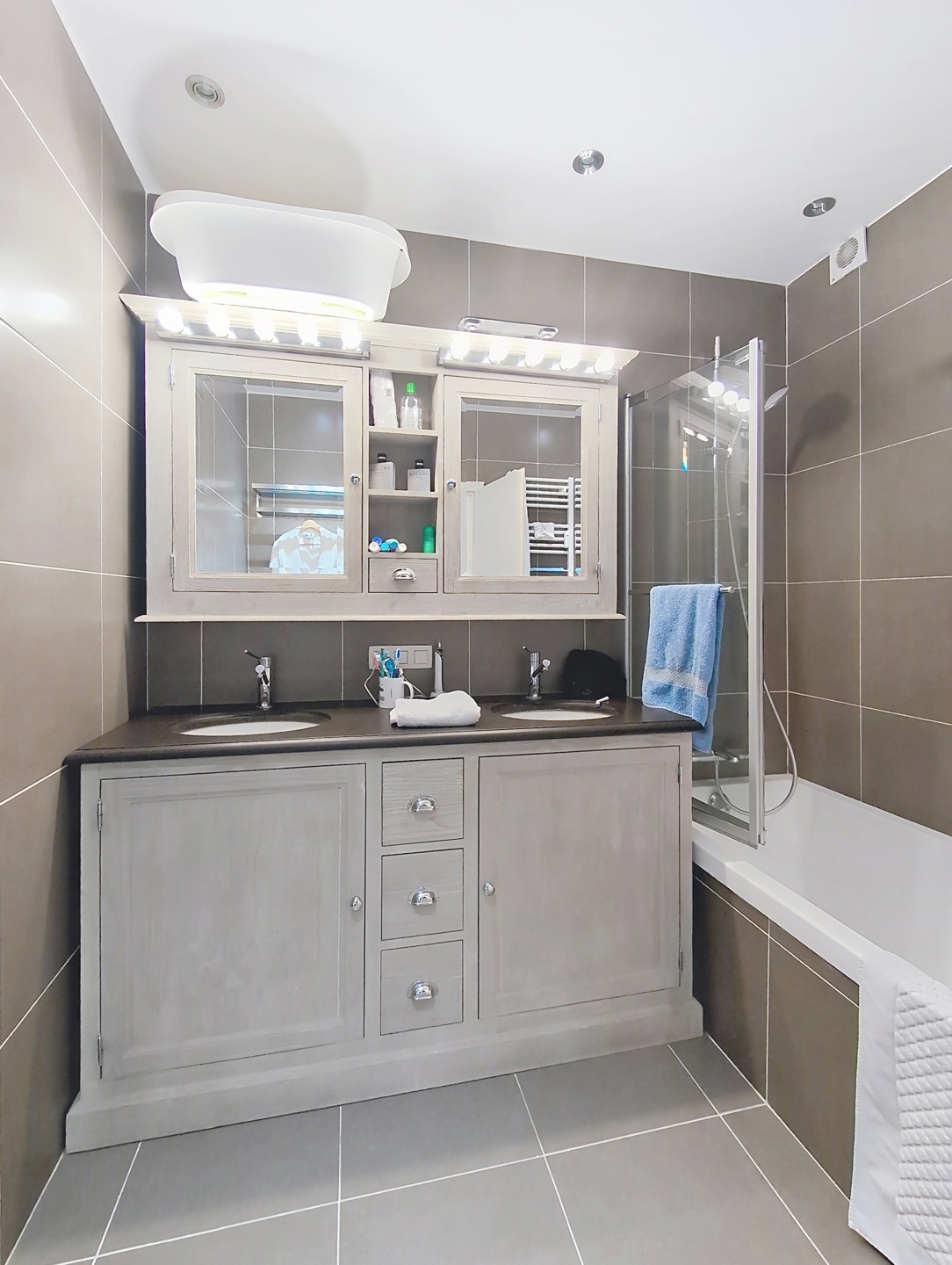 La salle de bain est équipée d’une baignoire/douche et d’une double vasque.