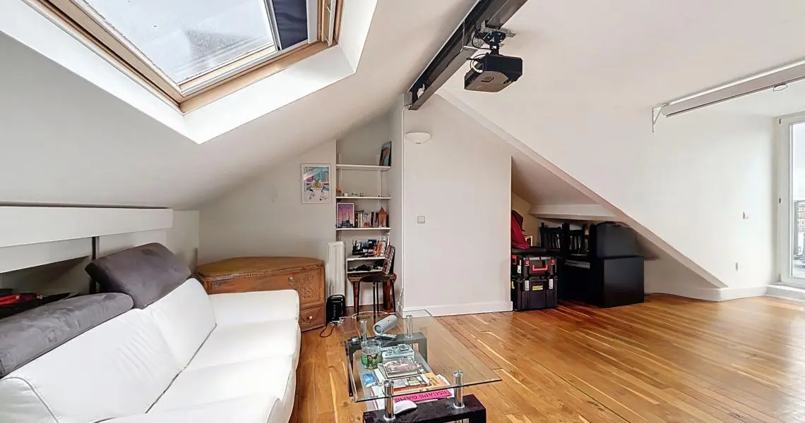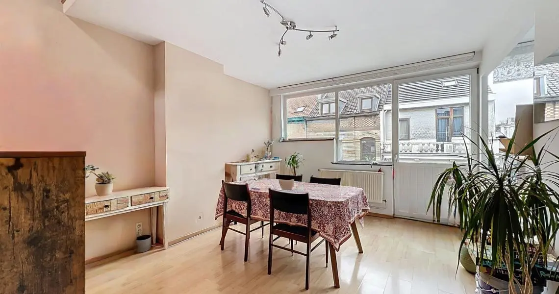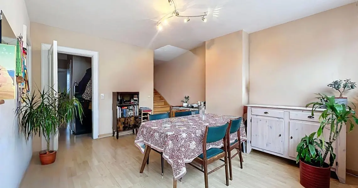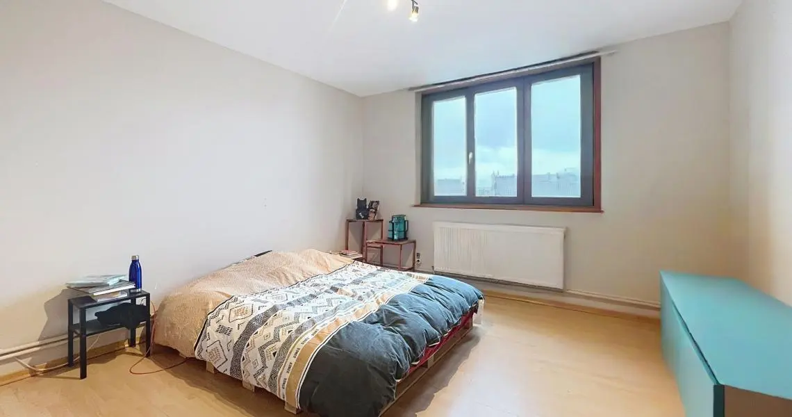 Ce duplex, situé au 3e et dernier étage de l'immeuble et développant une superficie de +/- 96 m² se compose d'un hall d'entrée, d'une salle à manger de +/- 15 m² ouverte sur une cuisine super équipée (taque au gaz, hotte, four, réfrigérateur, lave-vaisselle), d'une buanderie, d'une belle grande chambre de +/- 16 m², d'une deuxième chambre +/- 9 m², d'une salle de bains et d'un WC séparé. À l'étage, une grande mezzanine de +/- 20 m² offre un agréable espace de séjour donnant accès à une spacieuse terrasse exposée ouest. Une cave complète l'ensemble.
