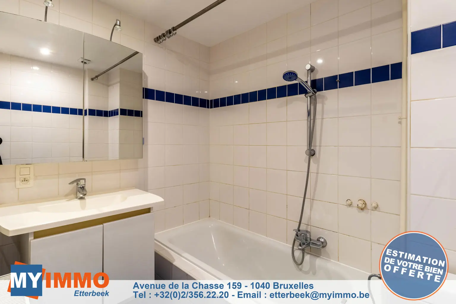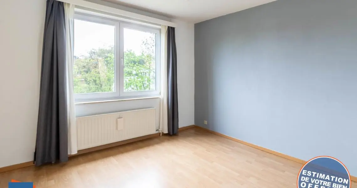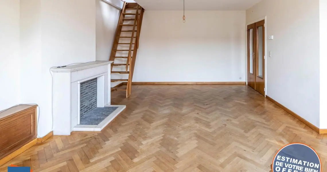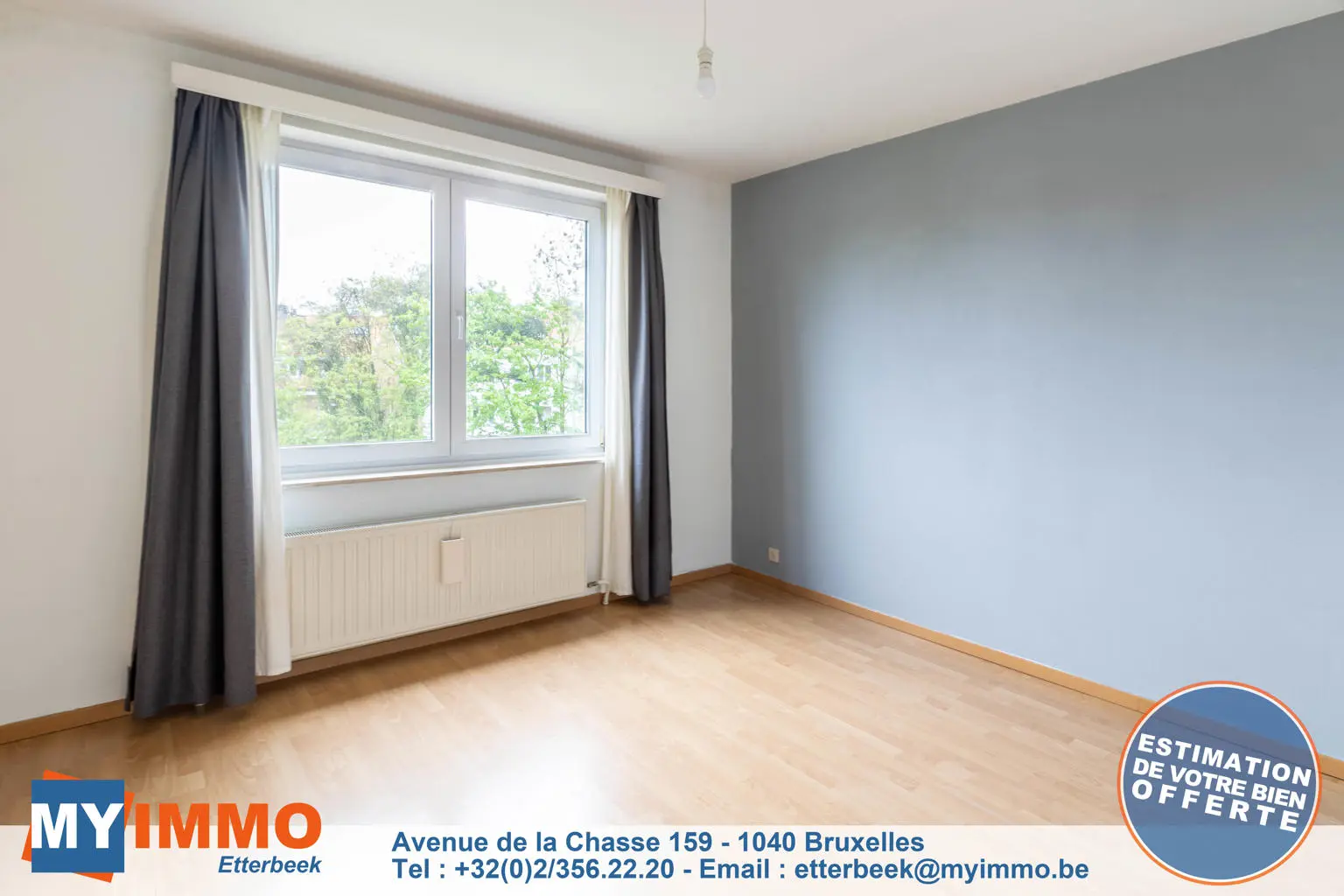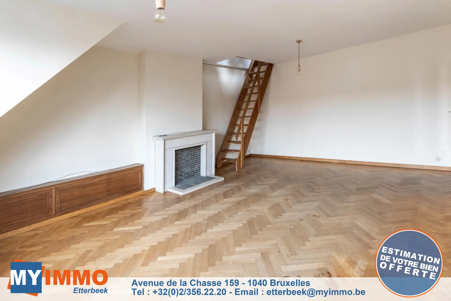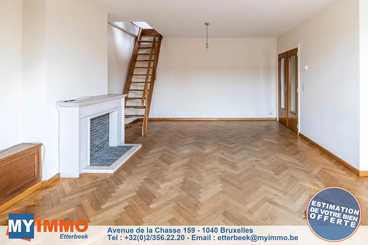 Watermael-Boitsfort - Bel appartement de +/- 90 m² dans un immeuble de charme de 1968 idéalement situé dans le quartier calme et boisé des Trois Tilleuls comprenant un hall d'entrée donnant accès à une cuisine semi-équipée et à une grande pièce à vivre de +/- 21 m² avec sa chambre lumineuse de +/- 27 m² au sol en duplex. Un hall de nuit donnant accès à deux chambres de +/- 13 m² et +/- 8 m² et une salle de bains. L'appartement comprend également une cave avec les raccordements pour la machine à laver et le séchoir. Un garage est obligatoire (+ place de parking devant le garage) pour 100€ supplémentaire. À visiter sans tarder, plus de biens sur www.myimmo.be