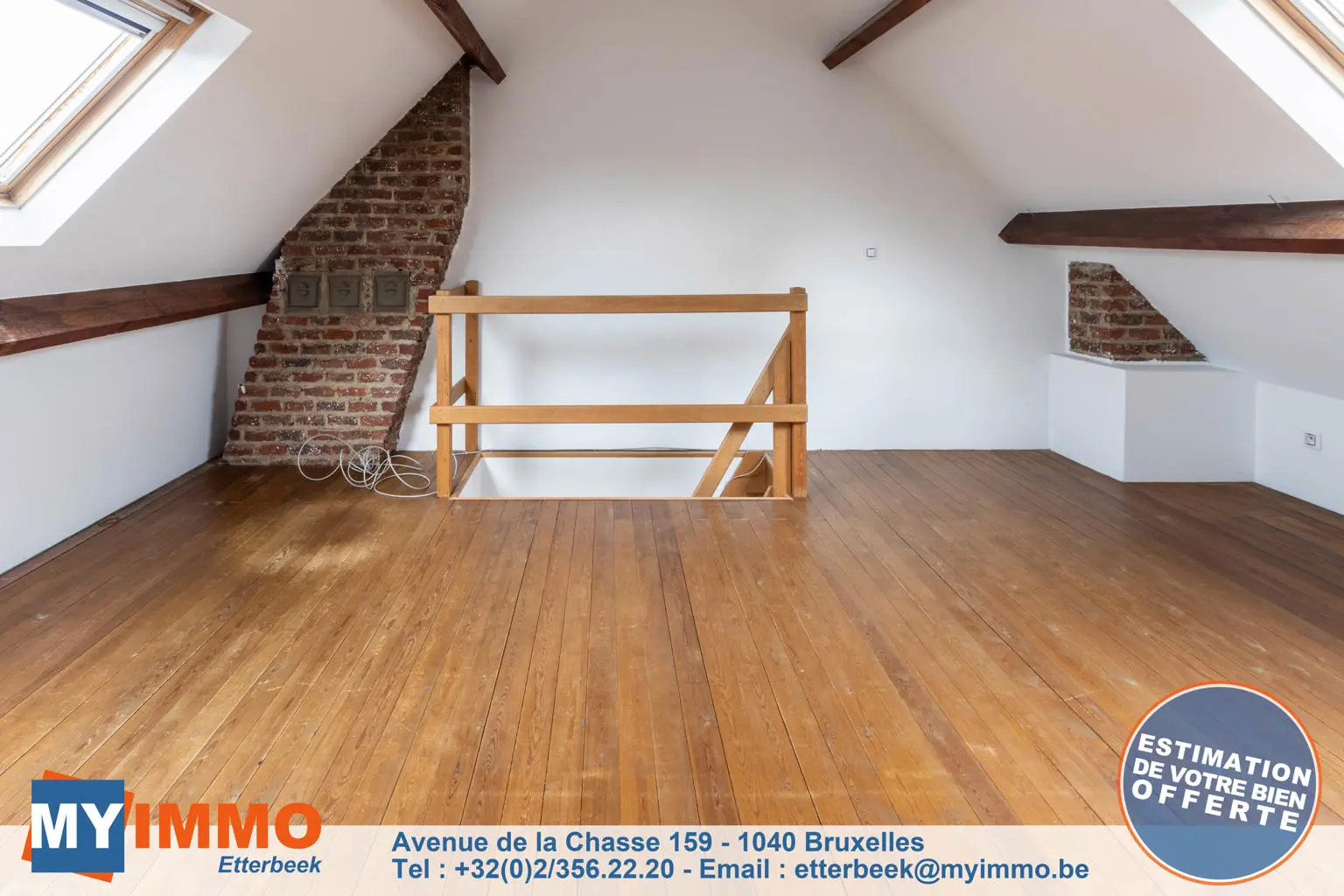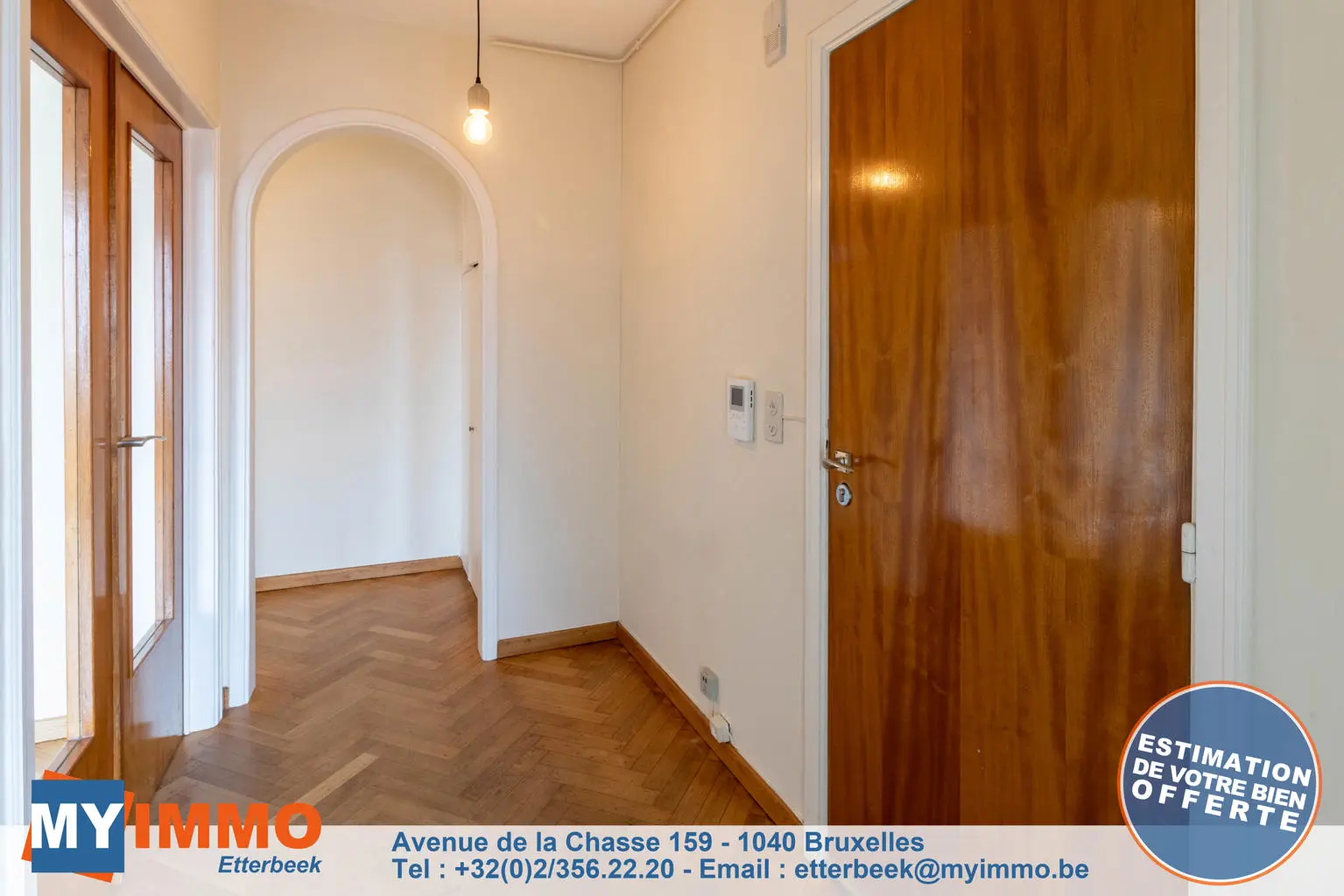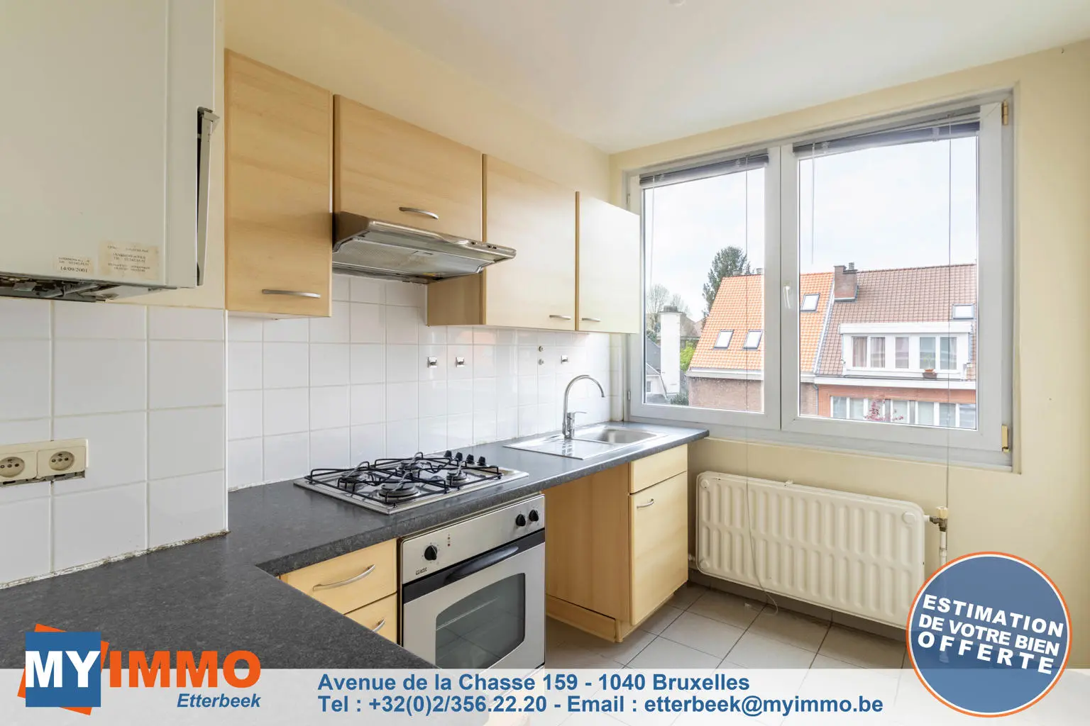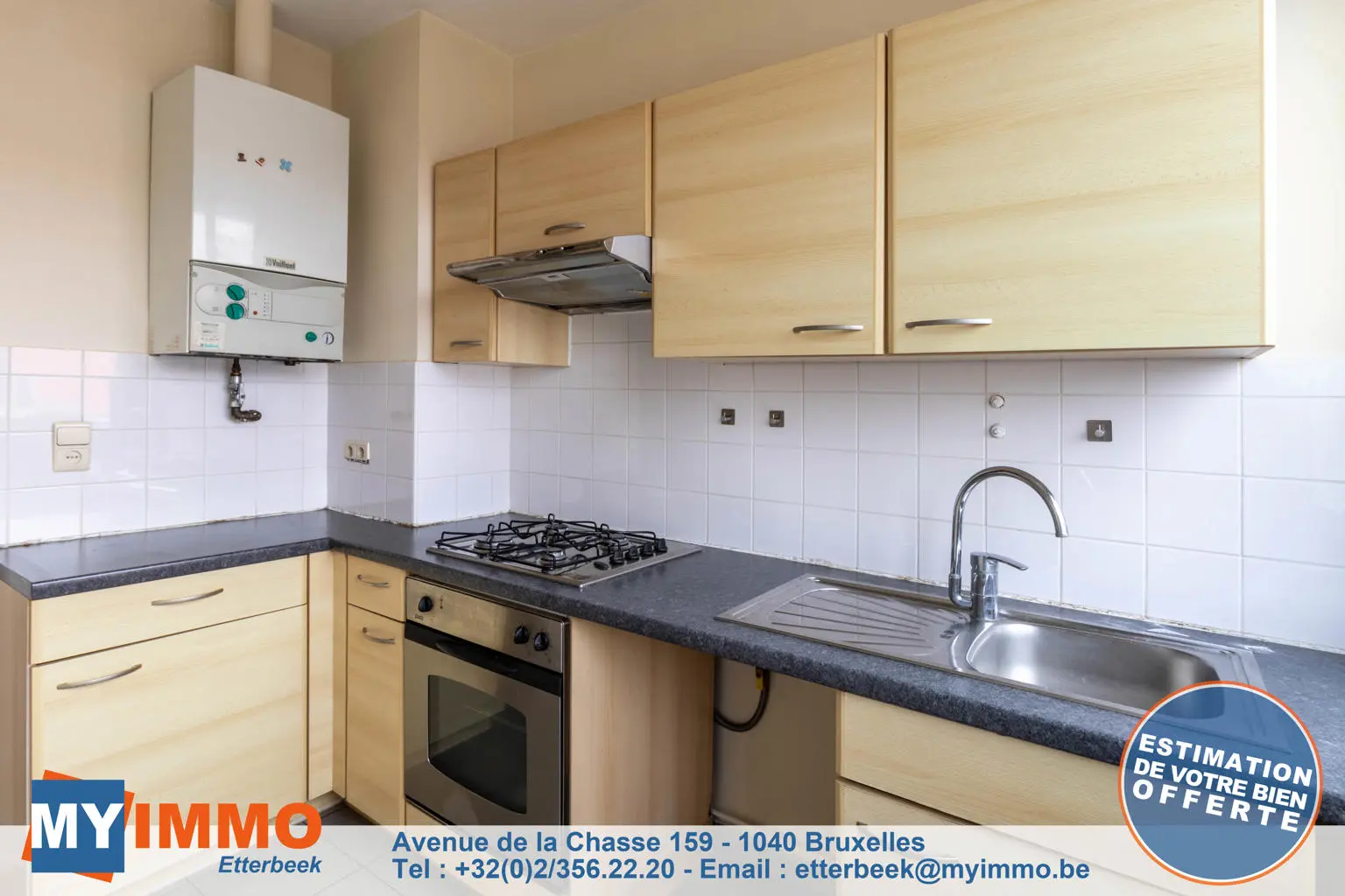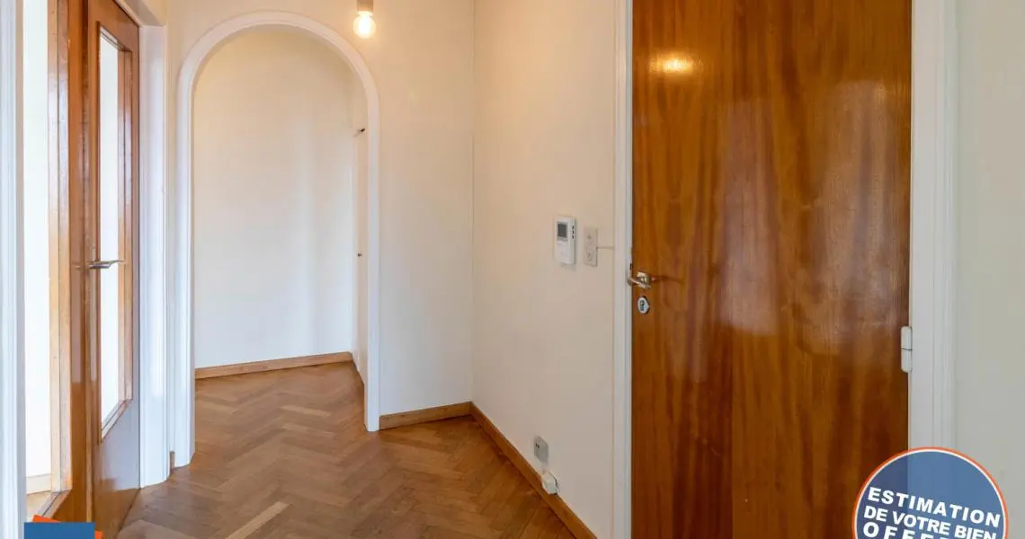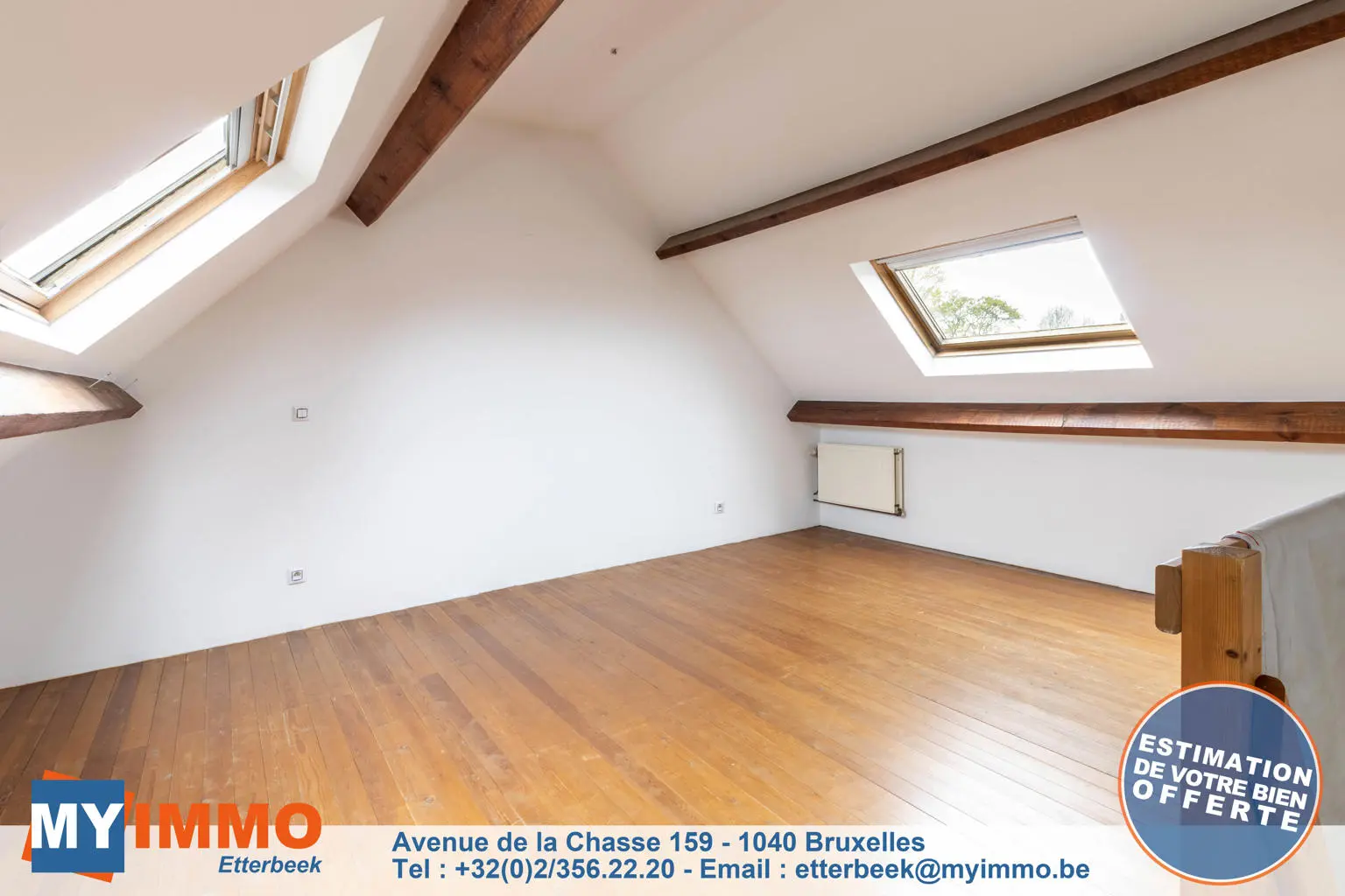 Watermael-Boitsfort - Bel appartement de +/- 90 m² dans un immeuble de charme de 1968 idéalement situé dans le quartier calme et boisé des Trois Tilleuls comprenant un hall d'entrée donnant accès à une cuisine semi-équipée et à une grande pièce à vivre de +/- 21 m² avec sa chambre lumineuse de +/- 27 m² au sol en duplex. Un hall de nuit donnant accès à deux chambres de +/- 13 m² et +/- 8 m² et une salle de bains. L'appartement comprend également une cave avec les raccordements pour la machine à laver et le séchoir. Un garage est obligatoire (+ place de parking devant le garage) pour 100€ supplémentaire. À visiter sans tarder, plus de biens sur www.myimmo.be