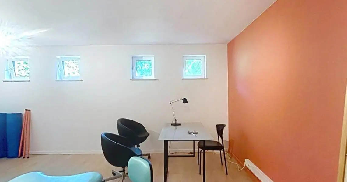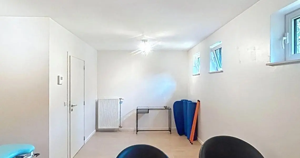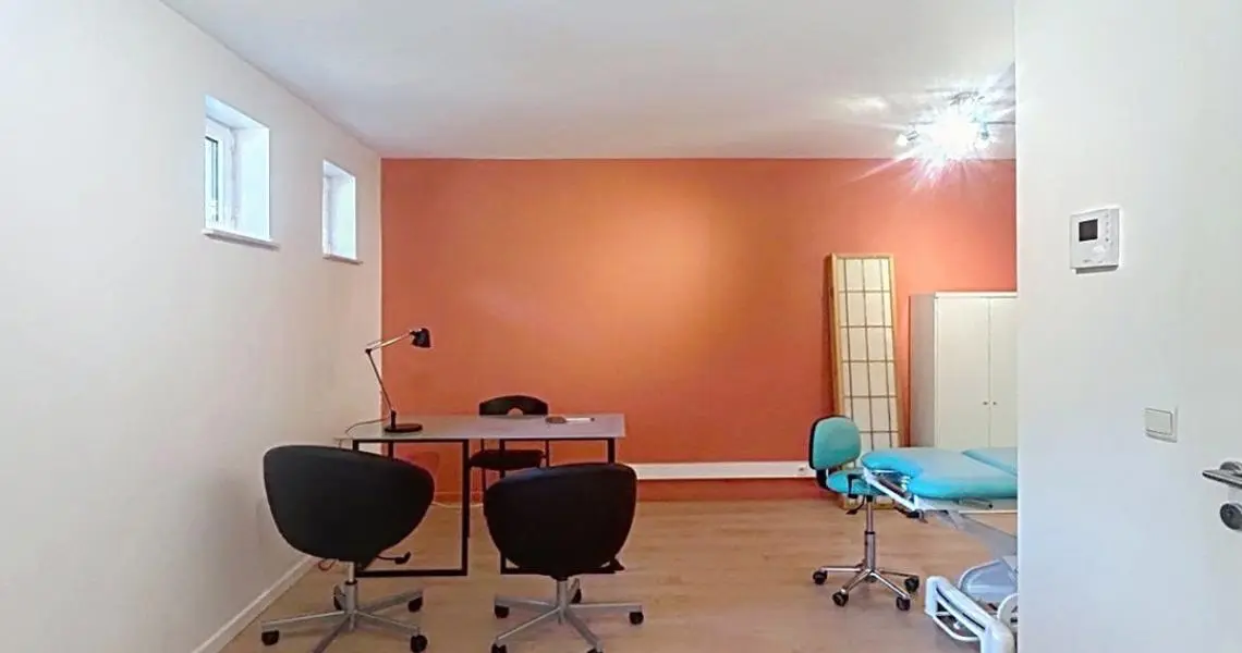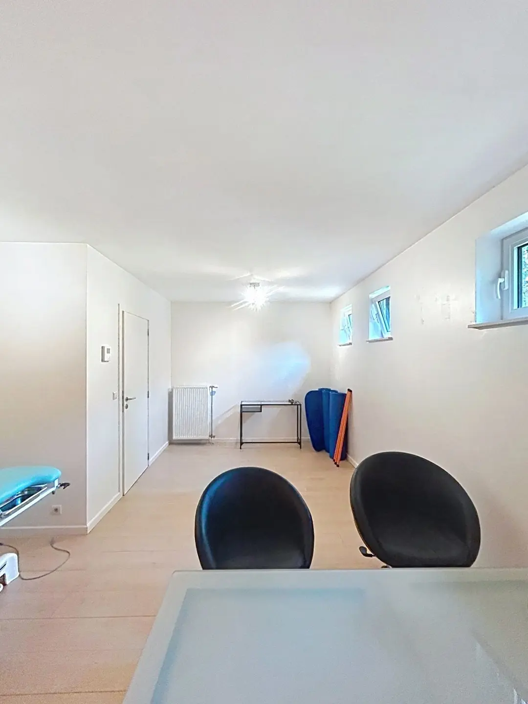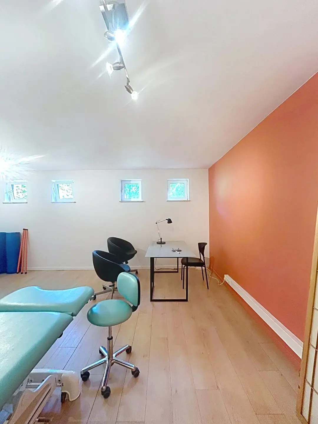 Entièrement meublé et prêt à l’emploi, ce bureau dispose notamment d’un bureau avec deux chaises de travail, deux chaises d’accueil, une table d’examen, une armoire de rangement, un paravent, des tapis de gym, des chaises pour la salle d’attente ainsi qu’un meuble vestiaire.