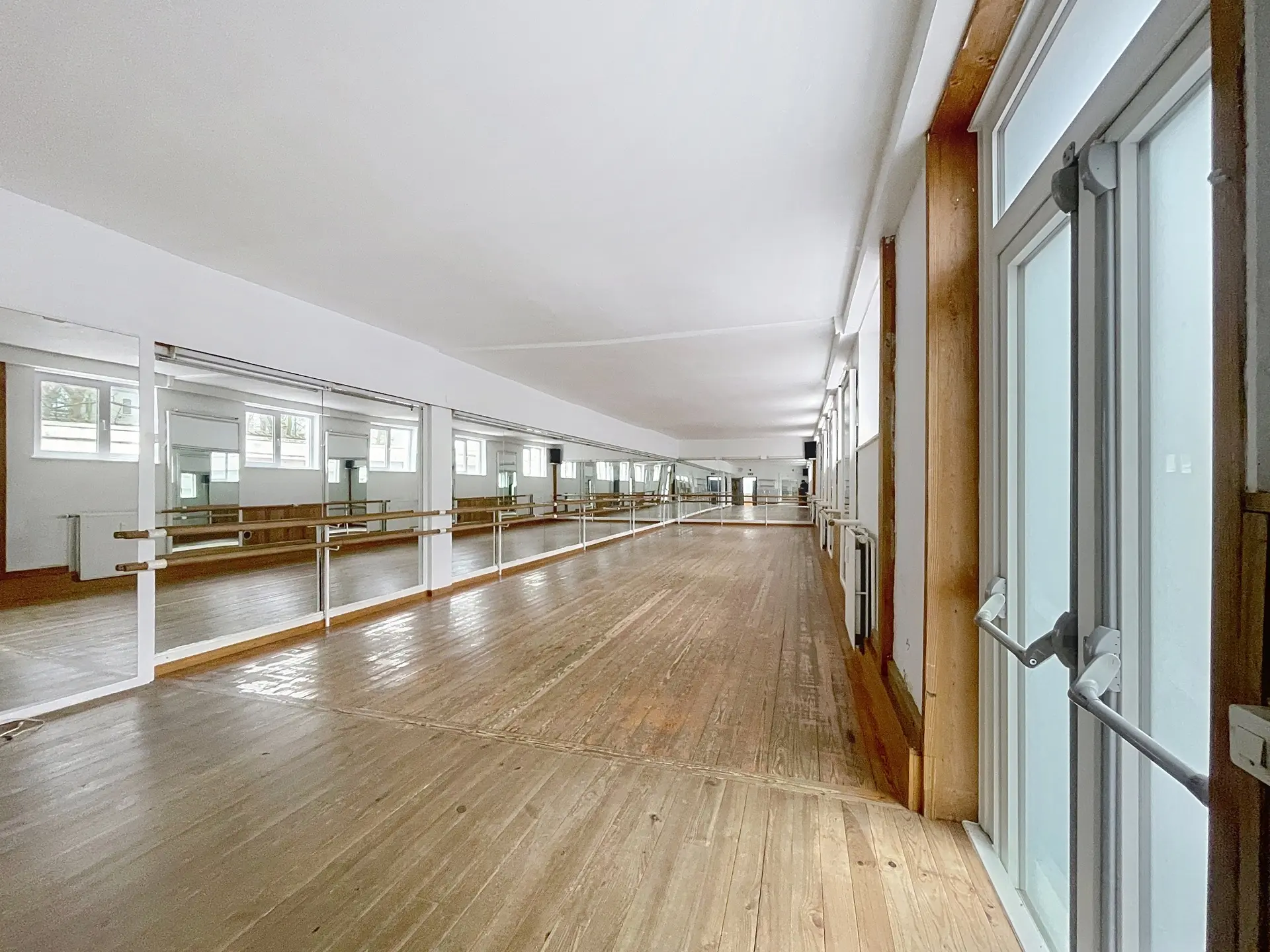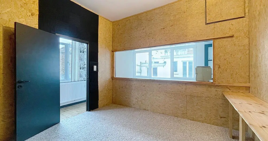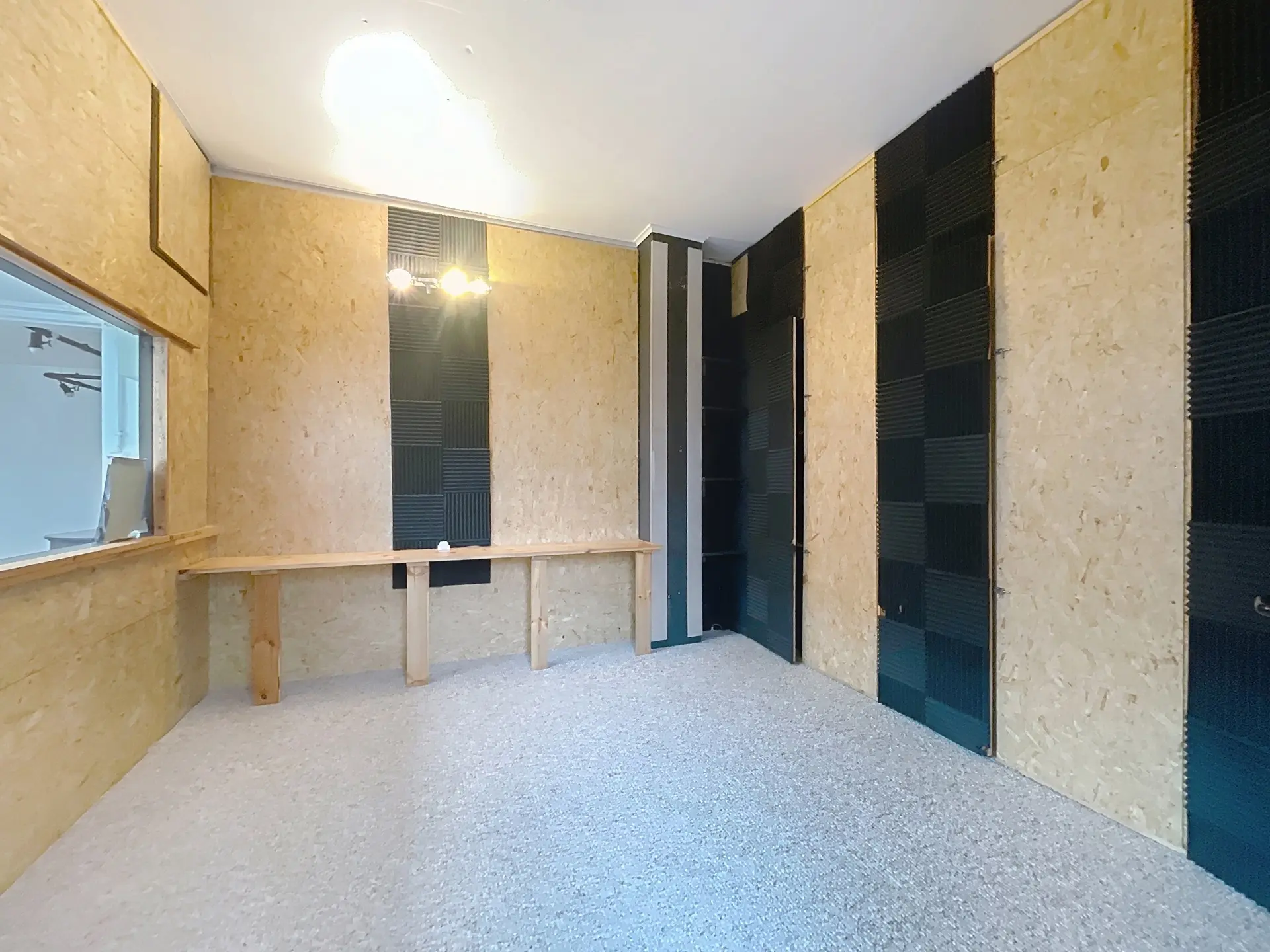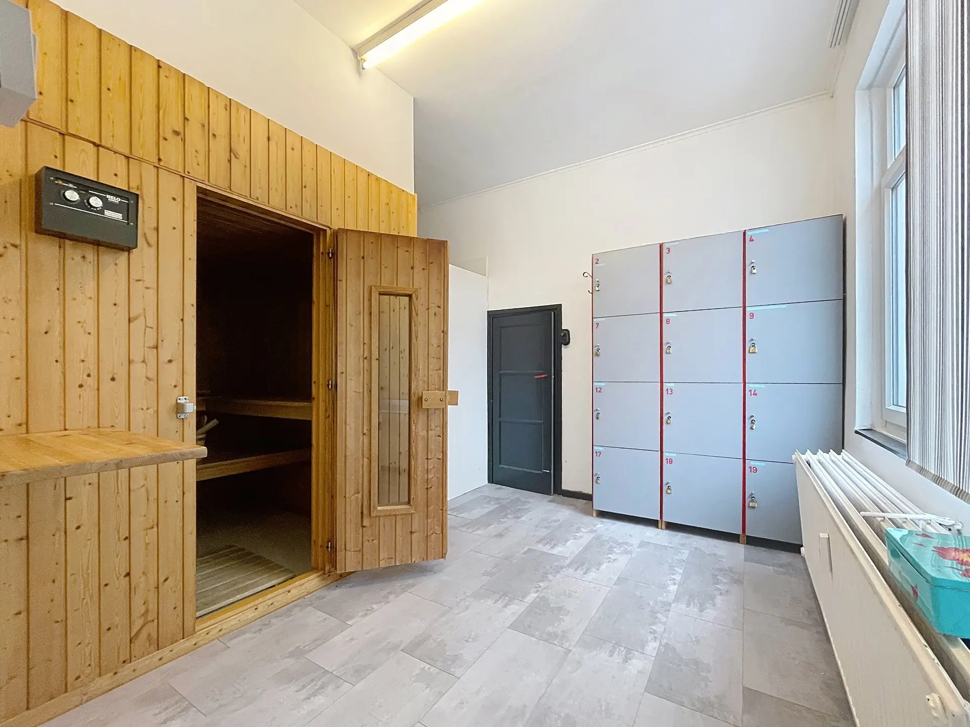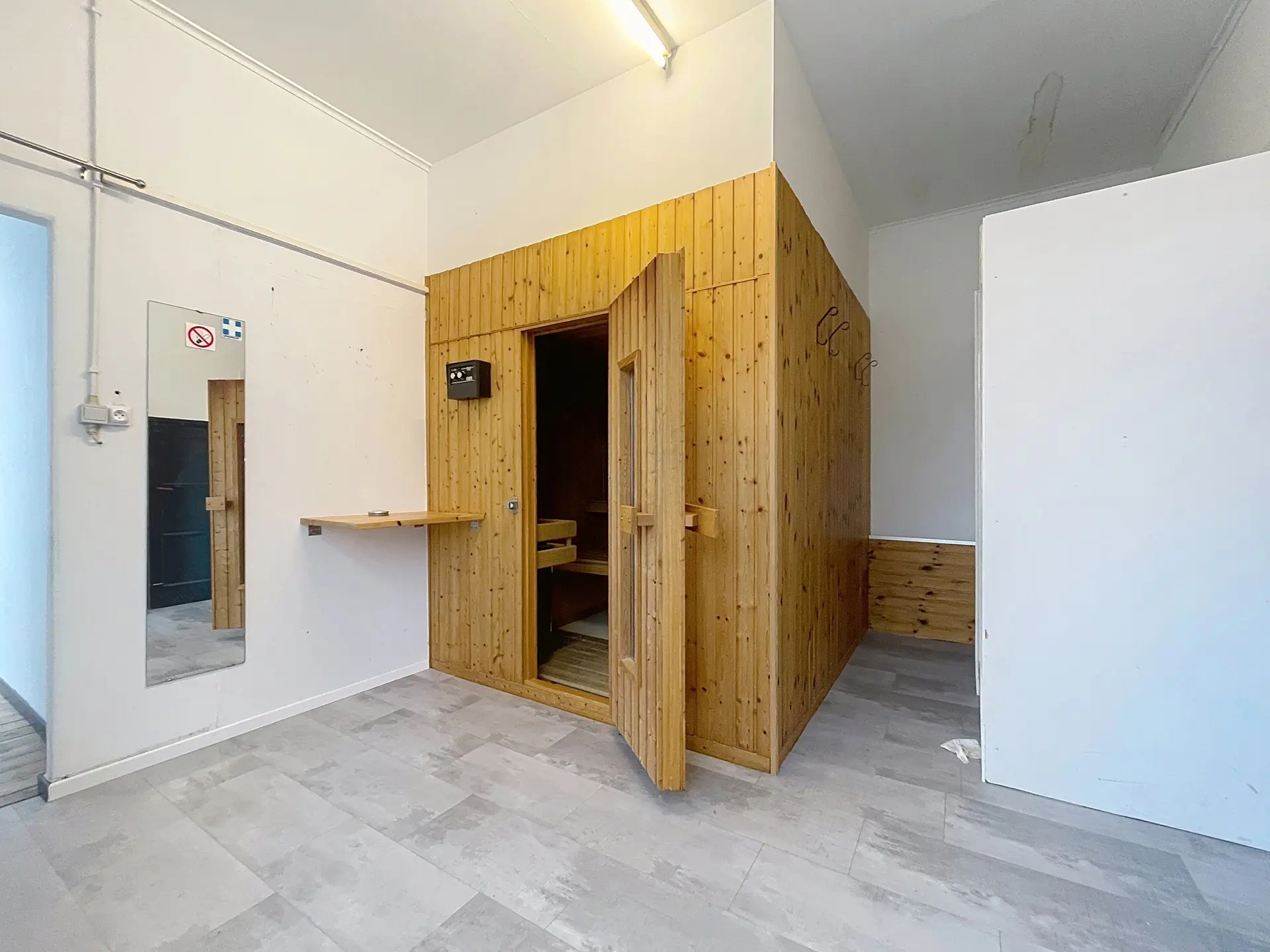 Au premier étage, en plus de la salle principale, se trouvent un espace d’accueil ou bar d’environ 20 m², une petite cuisine d’environ 3 m², ainsi que deux pièces supplémentaires pouvant être aménagées en bureaux ou en espaces polyvalents de ± 18 m² et ± 10 m². Ce niveau comprend également une salle de musique d’environ 12 m² avec rangements, ainsi qu’un vestiaire équipé de deux douches et d’un sauna.
