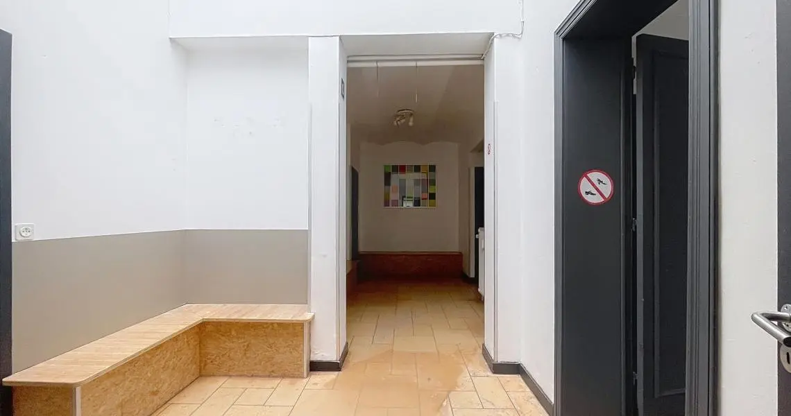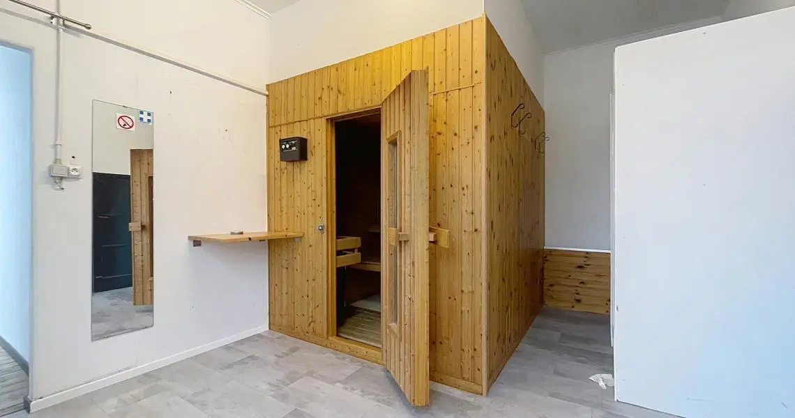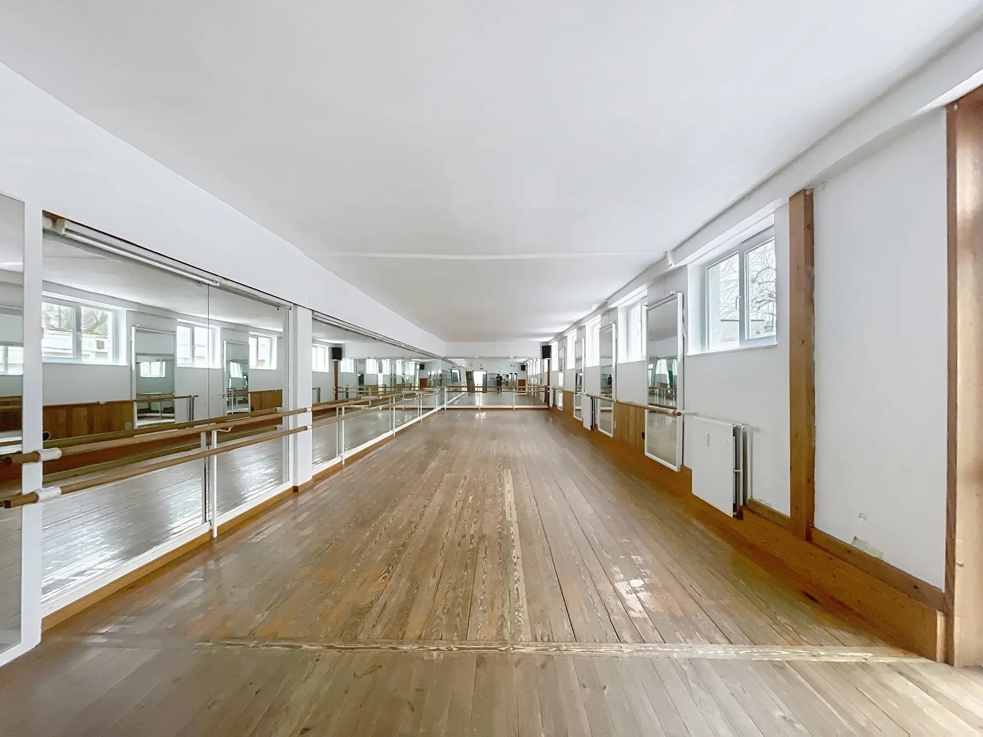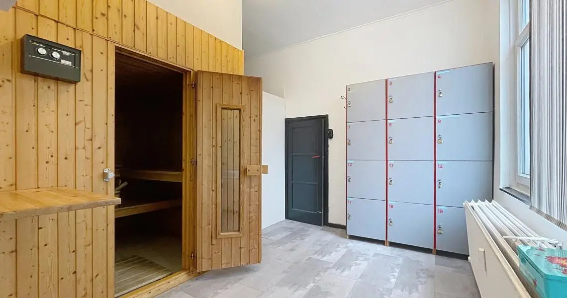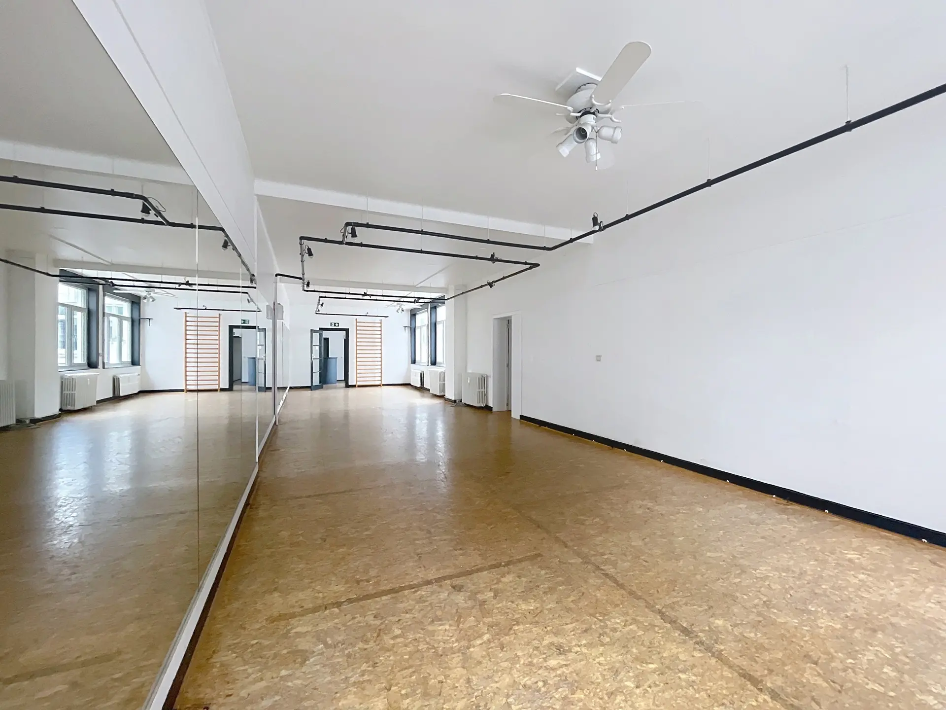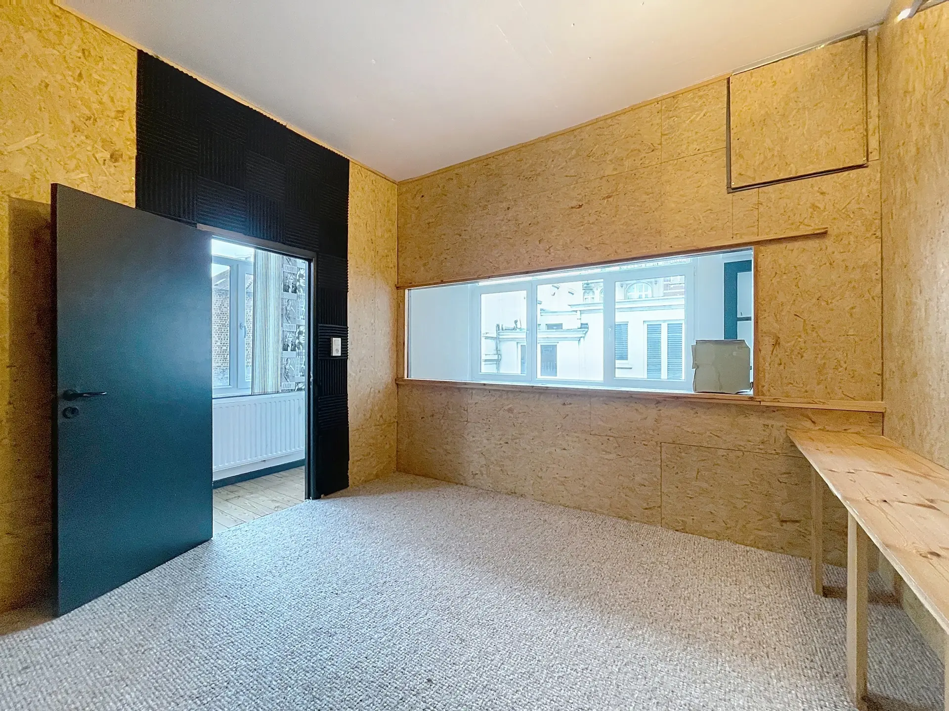 Au premier étage, en plus de la salle principale, se trouvent un espace d’accueil ou bar d’environ 20 m², une petite cuisine d’environ 3 m², ainsi que deux pièces supplémentaires pouvant être aménagées en bureaux ou en espaces polyvalents de ± 18 m² et ± 10 m². Ce niveau comprend également une salle de musique d’environ 12 m² avec rangements, ainsi qu’un vestiaire équipé de deux douches et d’un sauna.