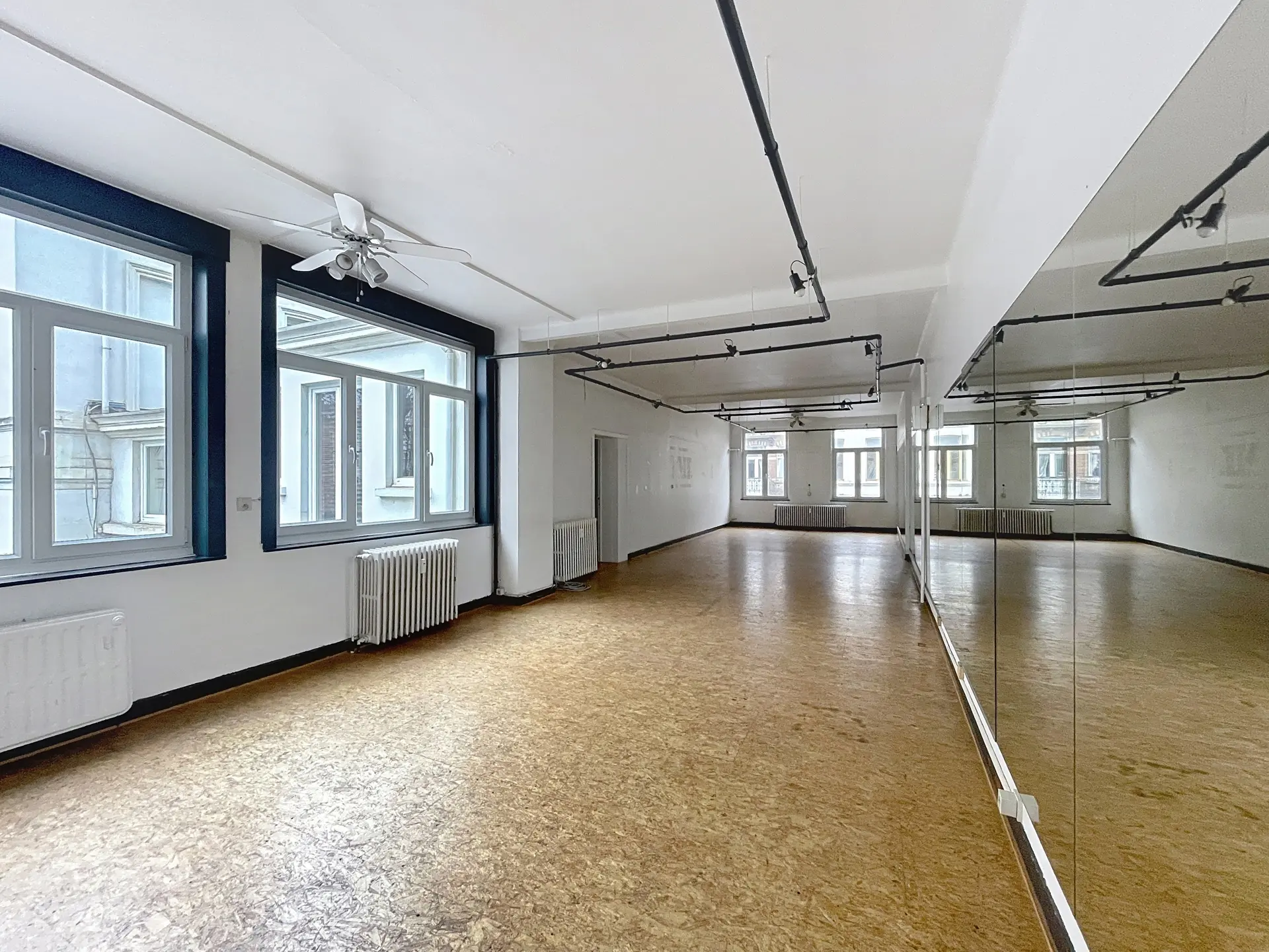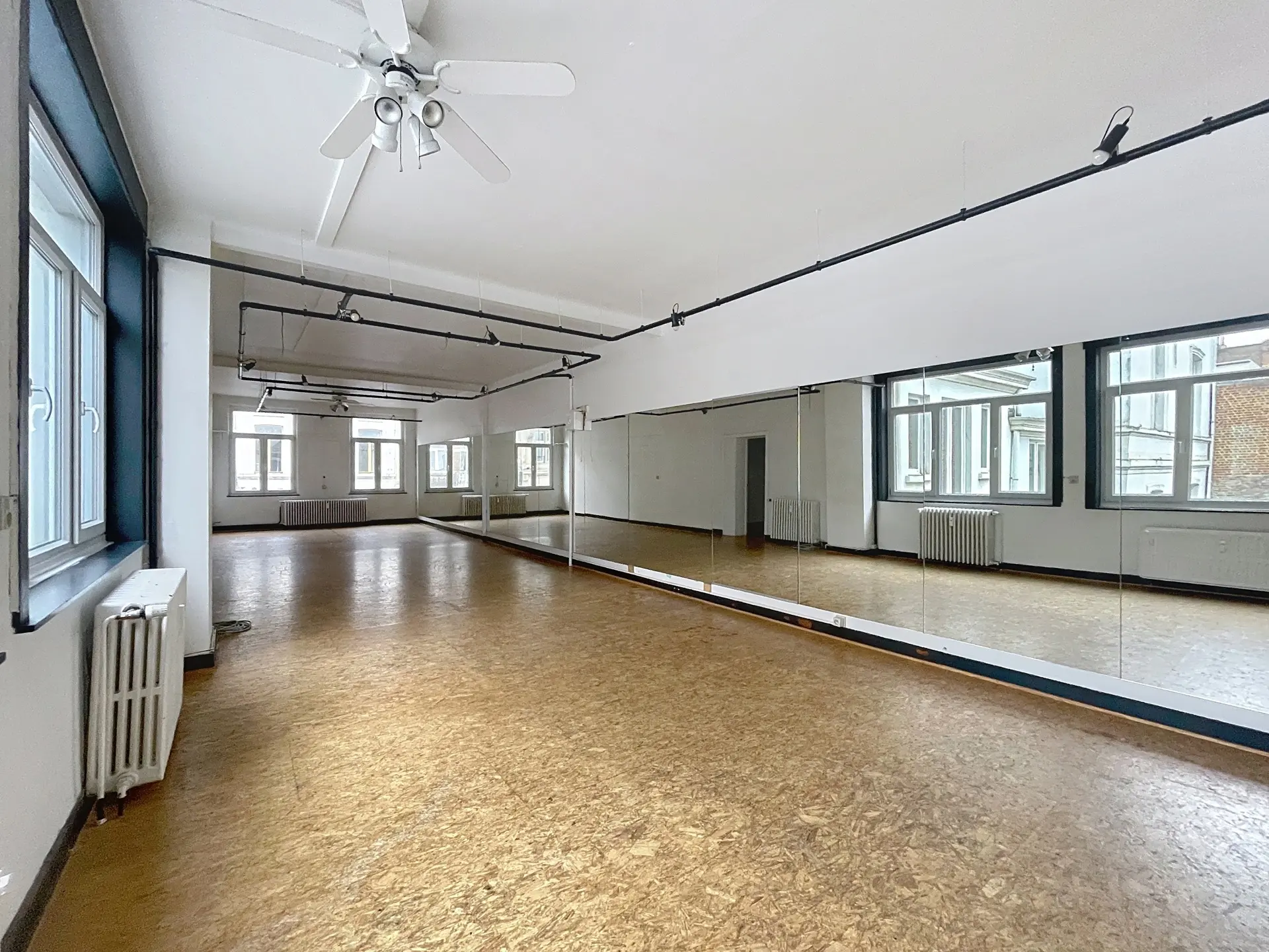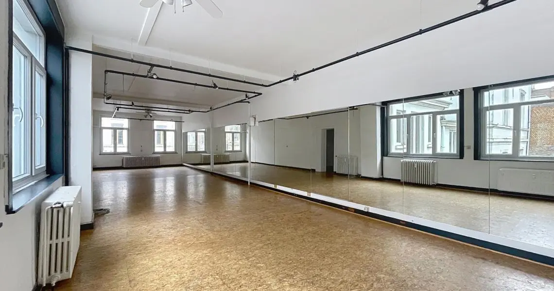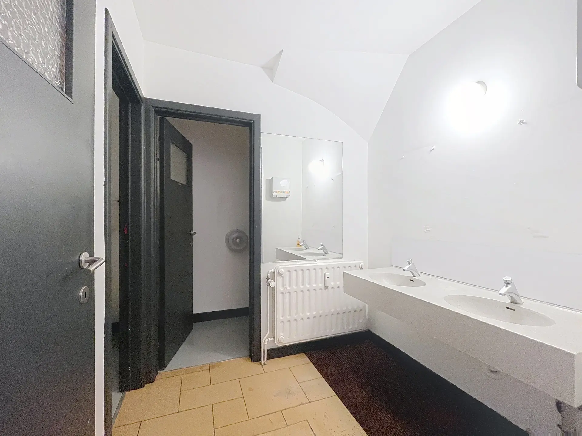 Le bien se compose de deux grandes salles principales, anciennement utilisées comme salles de danse, dont l’une se situe au rez-de-chaussée et développe une surface d’environ 79 m², tandis que la seconde, située au premier étage, offre une superficie d’environ 63 m². Ces espaces sont complétés par deux vestiaires de respectivement ± 4 m² et ± 10 m². Le rez-de-chaussée dispose également de deux toilettes séparées ainsi que d’une petite douche avec lavabo.