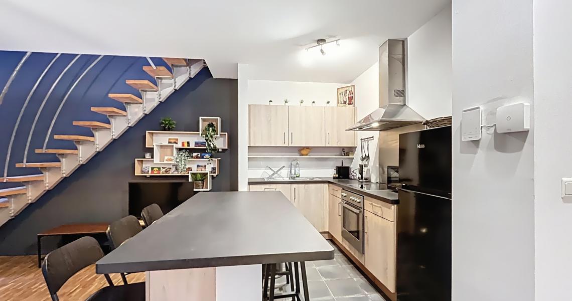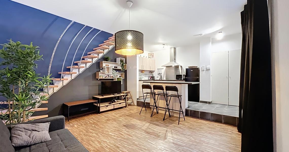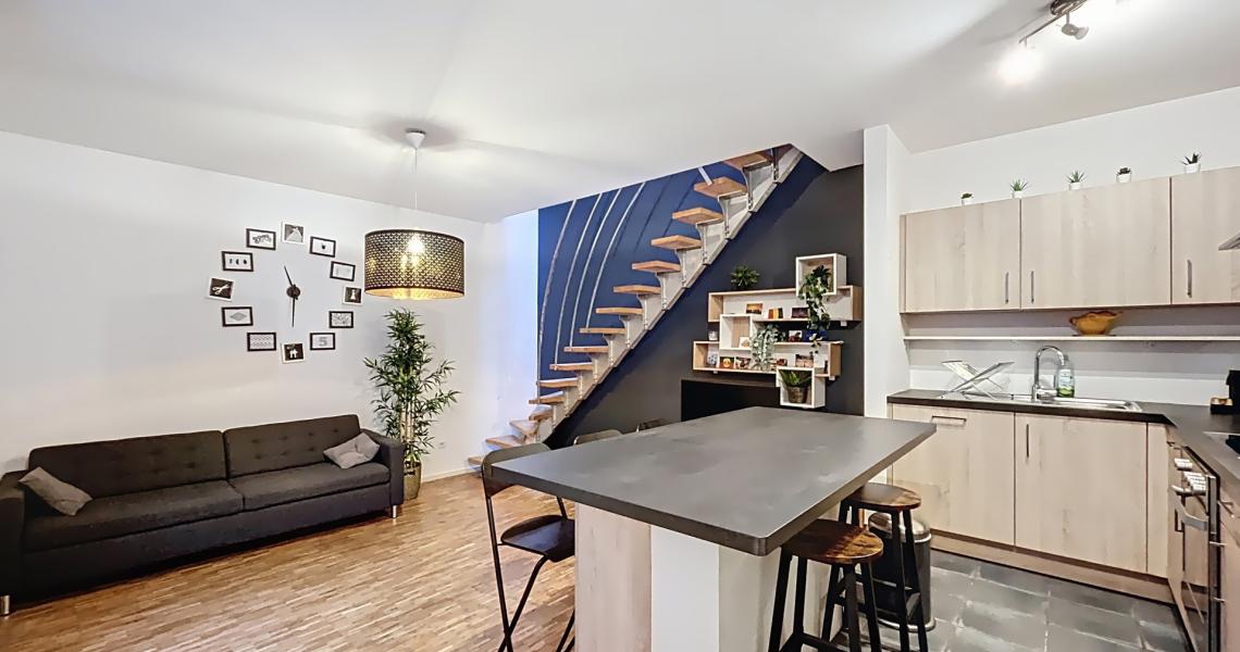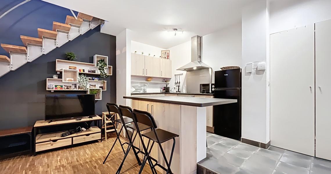 Au niveau inférieur, vous découvrez une belle cuisine américaine full équipée ouverte sur un séjour chaleureux et cosy, idéal pour se détendre ou recevoir.