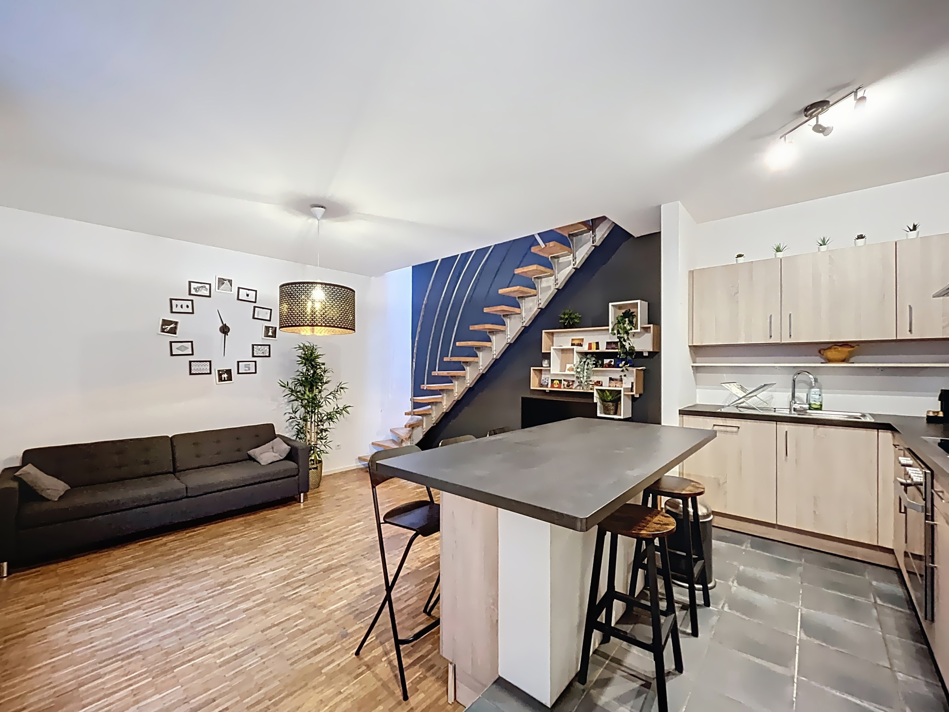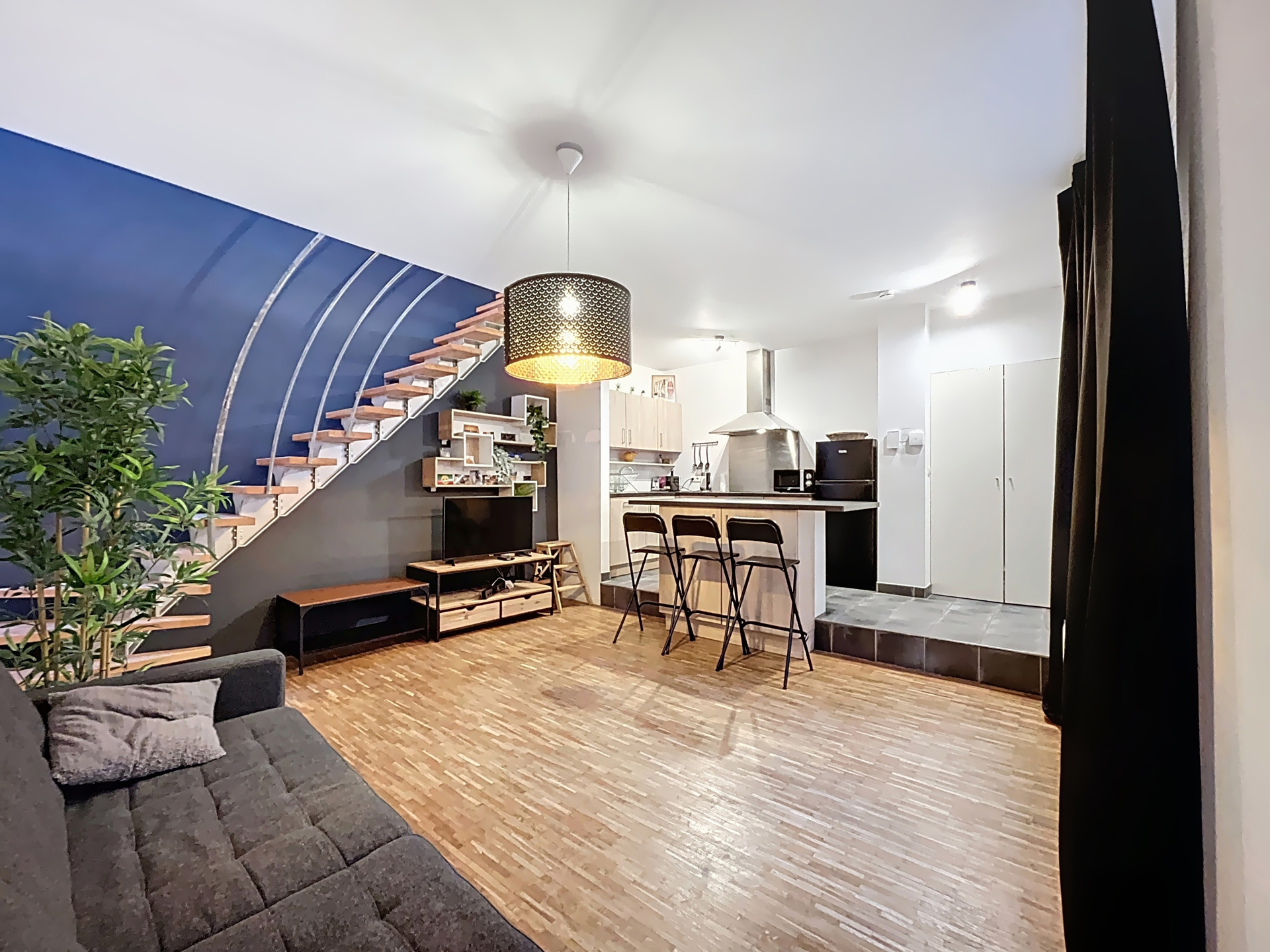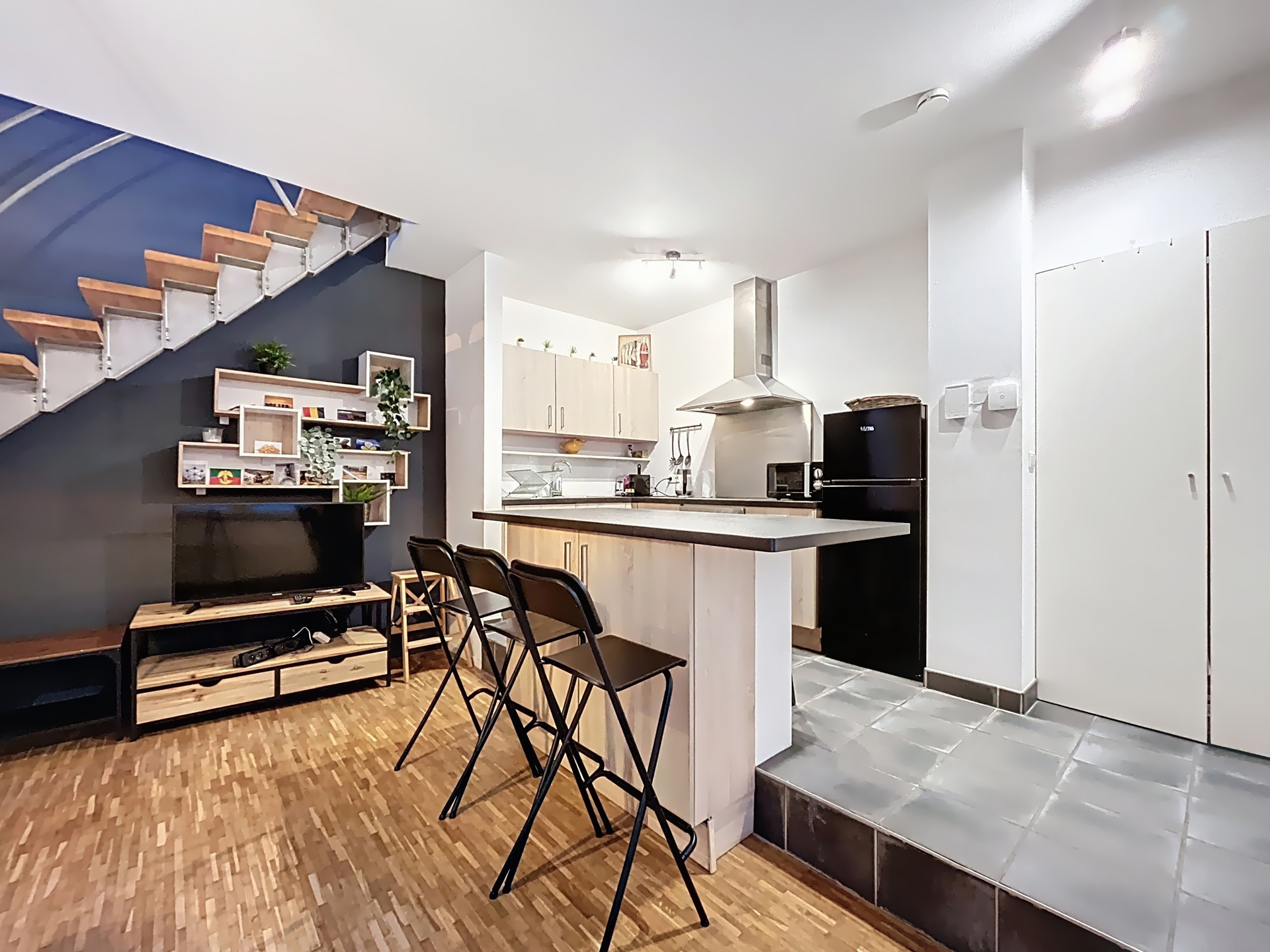 Au niveau inférieur, vous découvrez une belle cuisine américaine full équipée ouverte sur un séjour chaleureux et cosy, idéal pour se détendre ou recevoir.