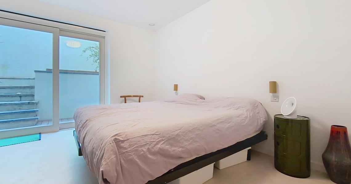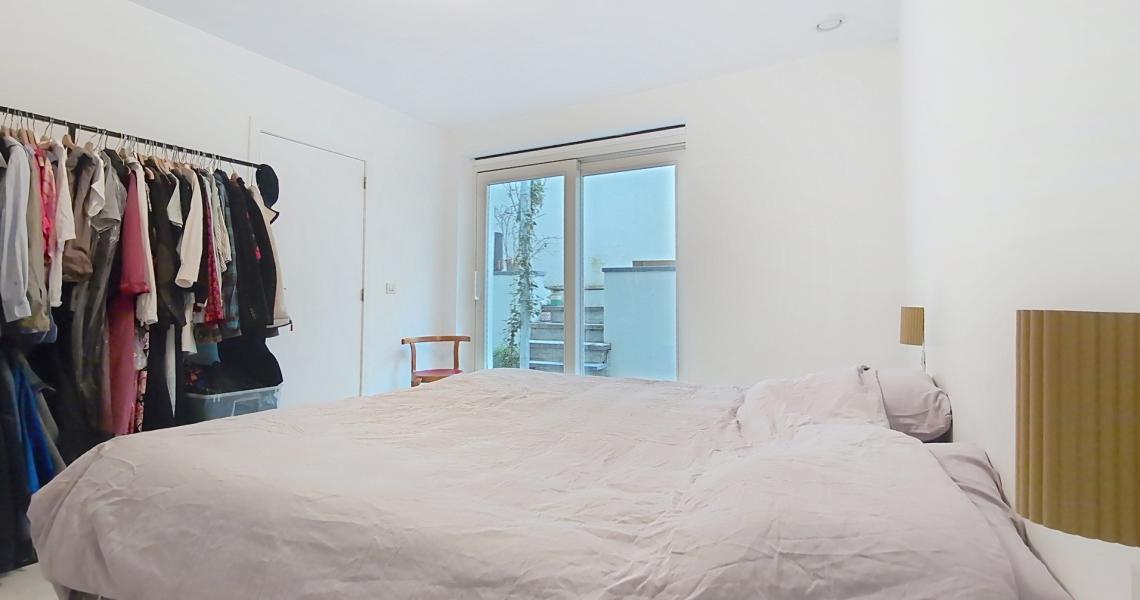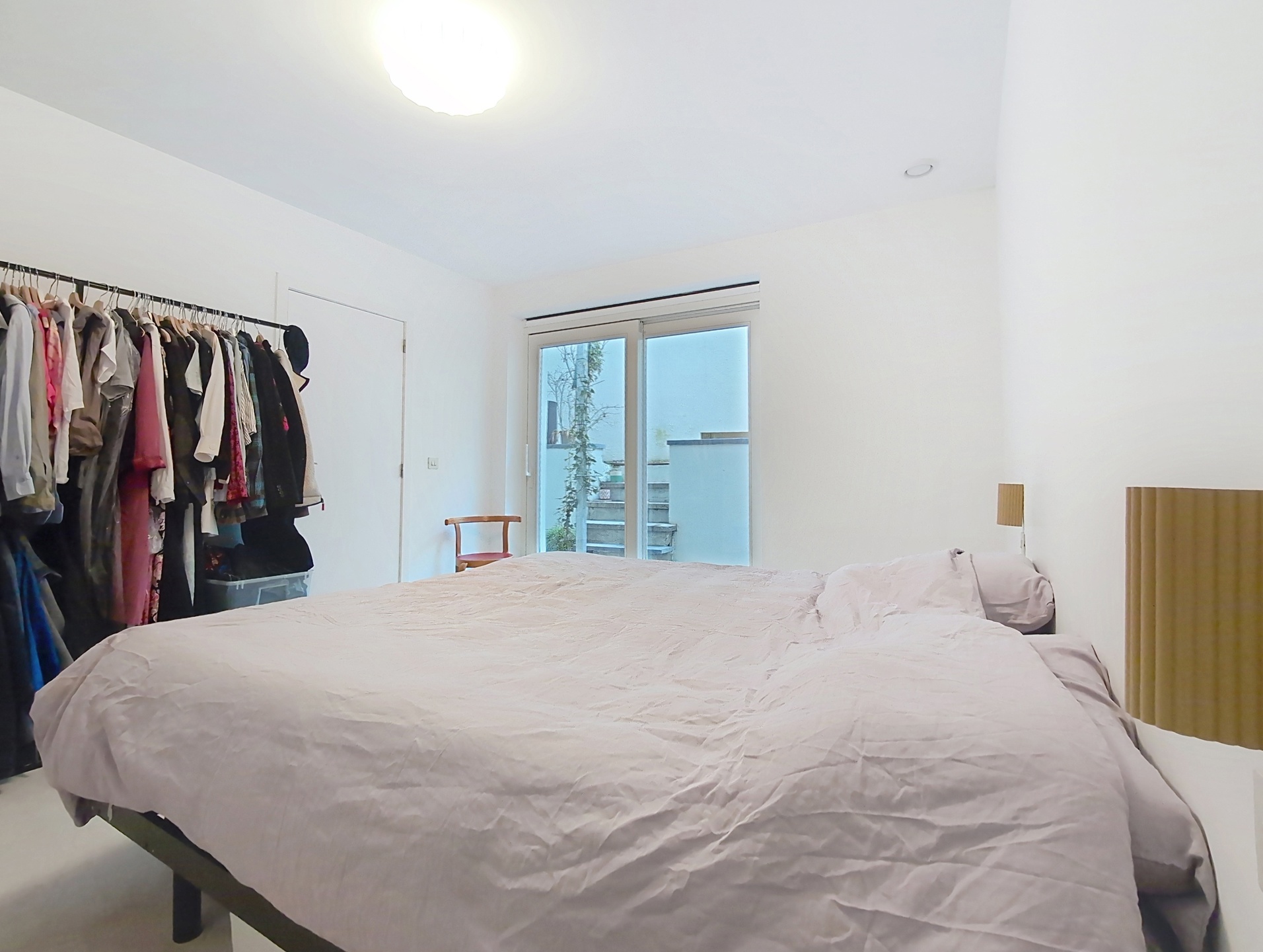 En souplex, l’espace nuit comprend un hall de nuit, une chambre spacieuse de ± 14 m² avec accès vers l’extérieur, une salle de bain complète avec baignoire et douche, un WC séparé, ainsi qu’une buanderie (avec emplacement pour machines et placards encastrés).