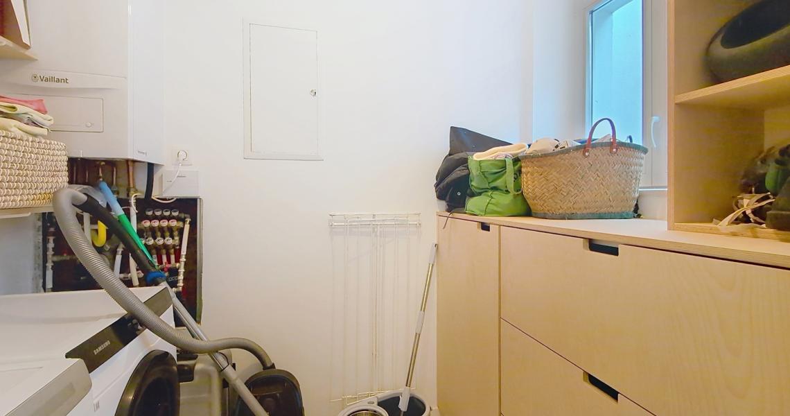 L’espace nuit en souplex comprend également un hall de nuit, une salle de bain complète avec baignoire et douche, un WC séparé, ainsi qu’une buanderie avec emplacement pour machines et placards encastrés.