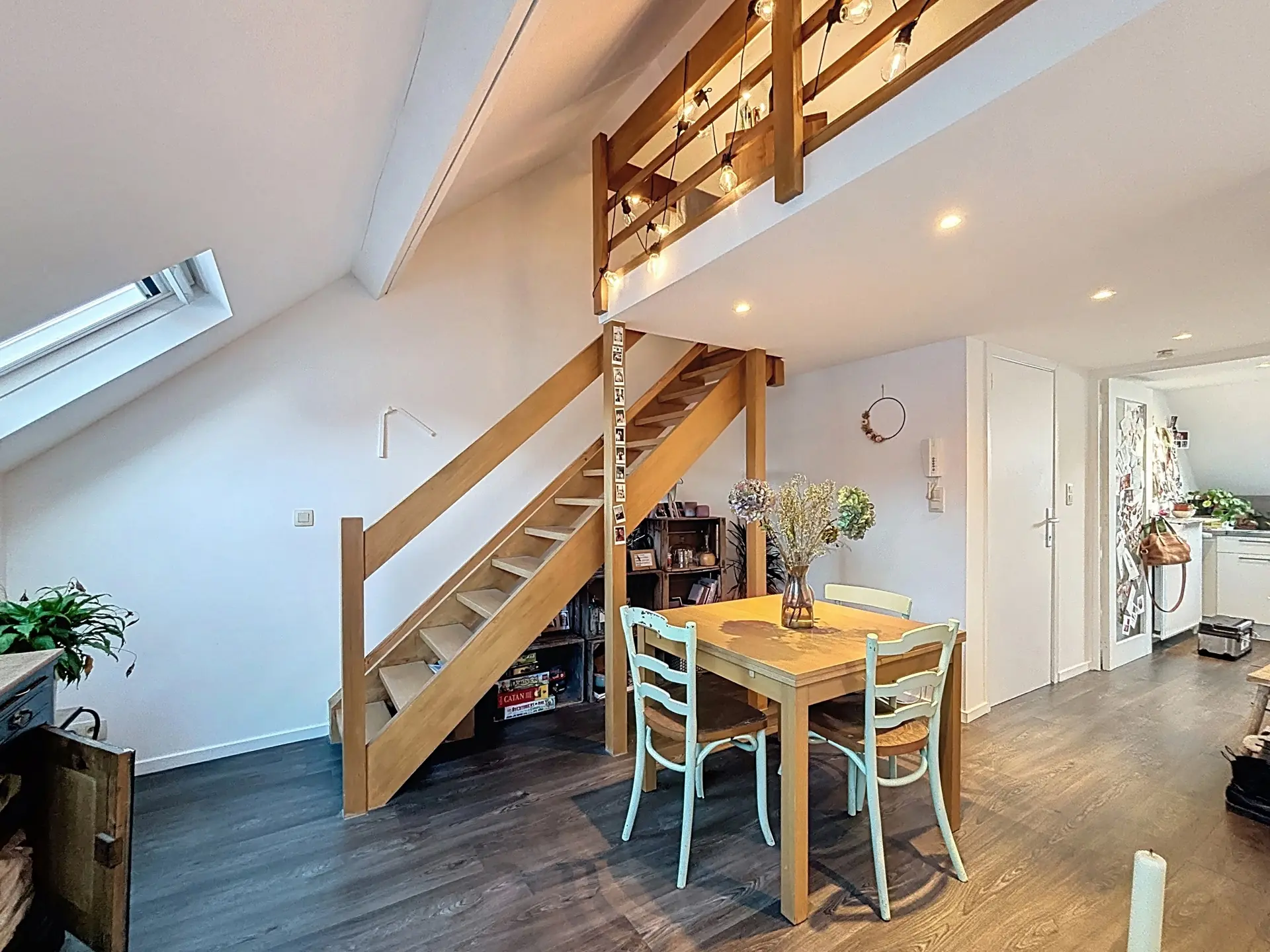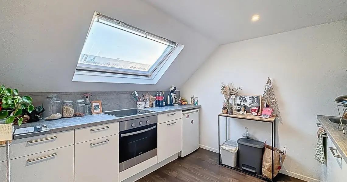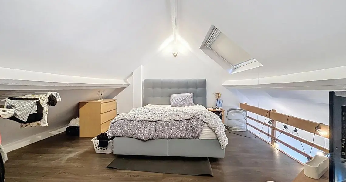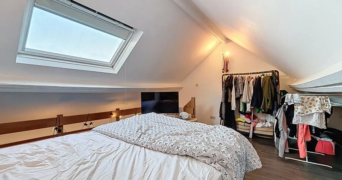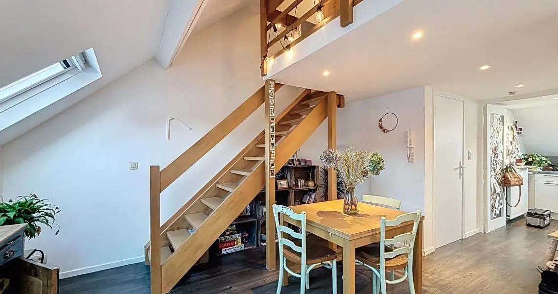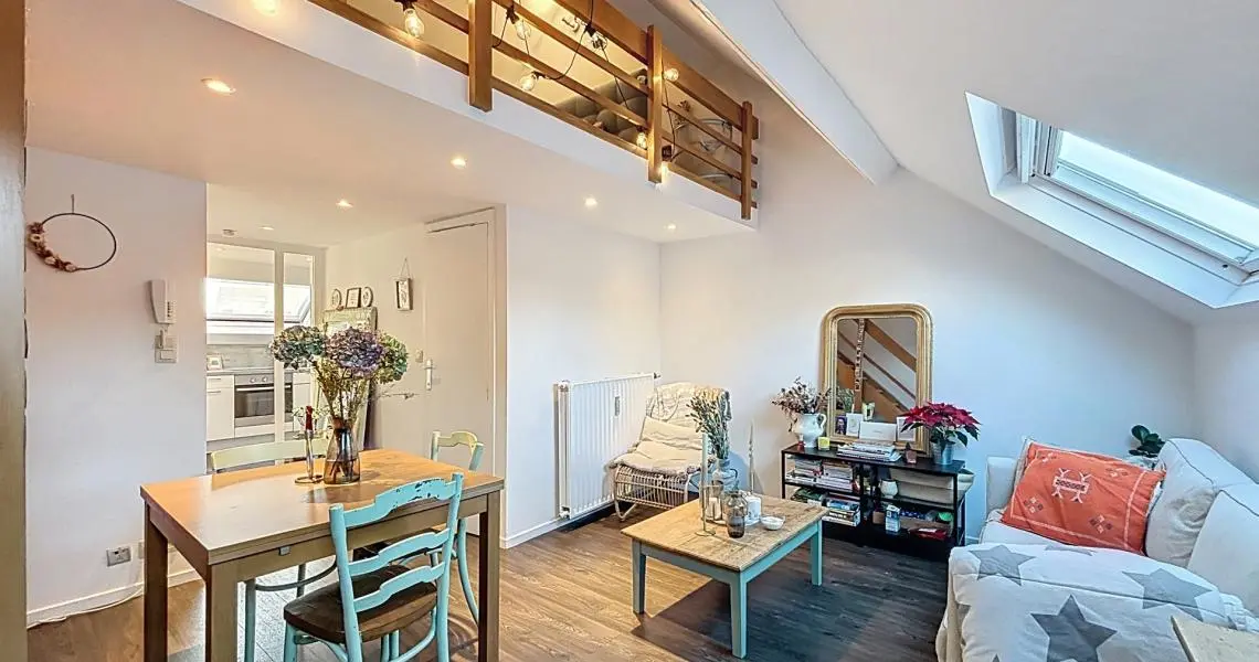 Le deuxième étage offre un hall d’entrée, une cuisine, une pièce de vie, une salle de bain avec WC et un espace mansardé accueillant la chambre principale.