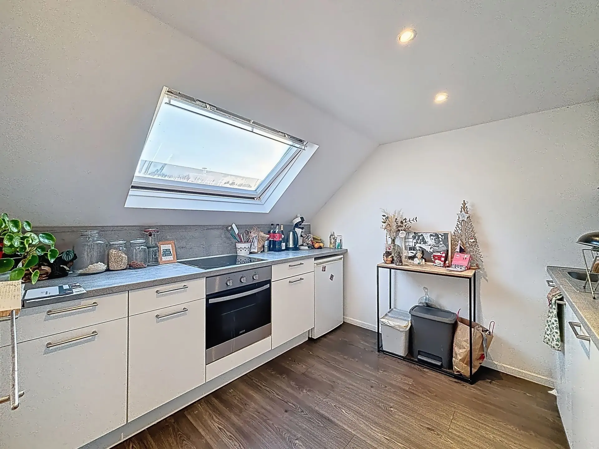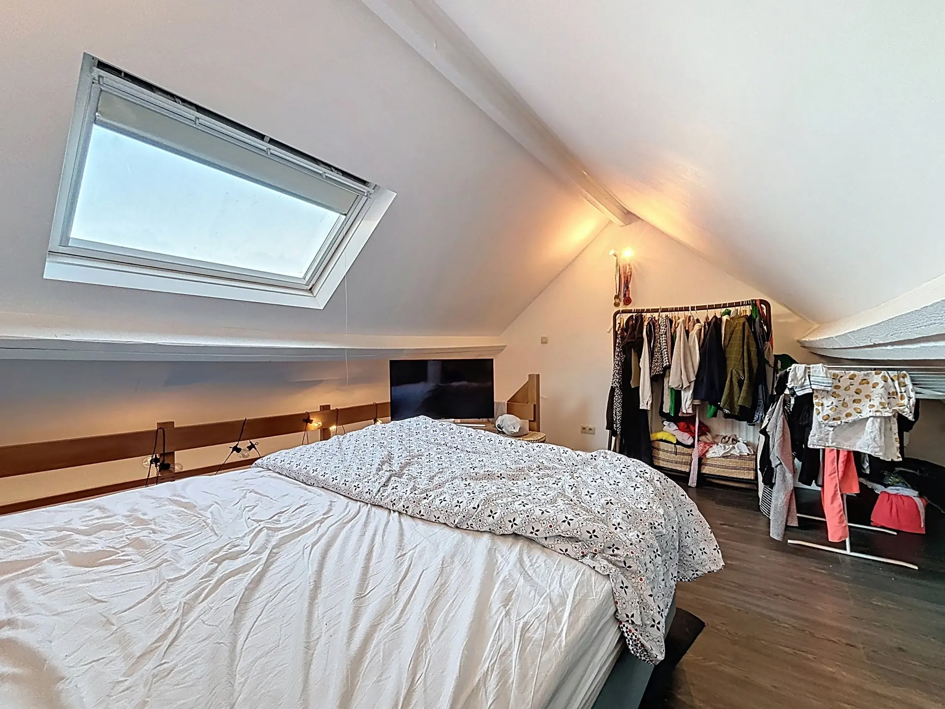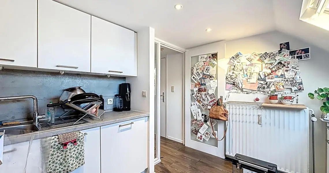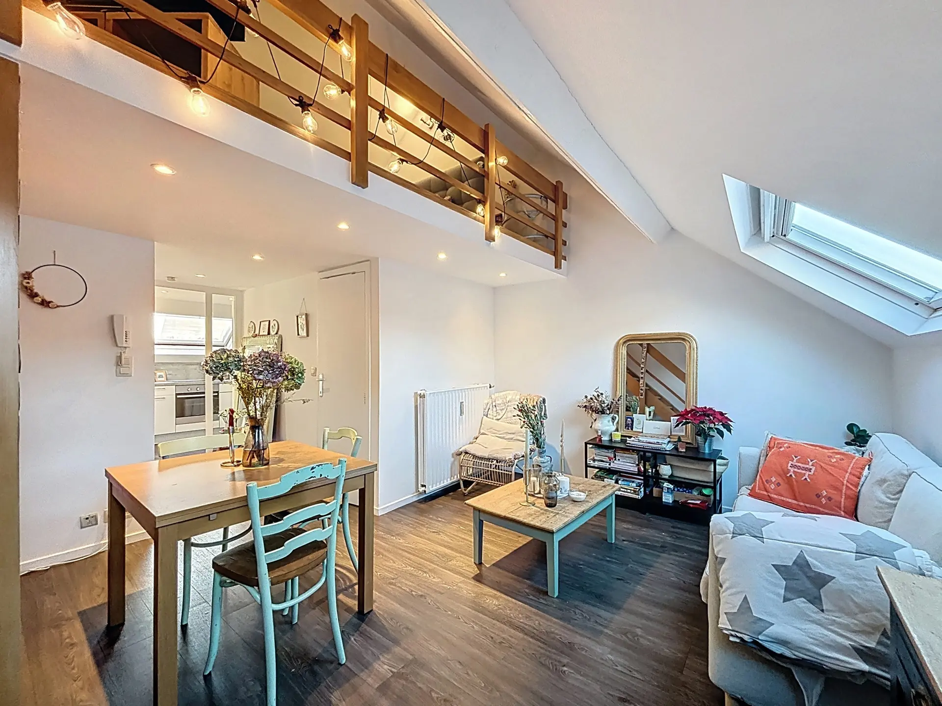 Le deuxième étage offre un hall d’entrée, une cuisine, une pièce de vie, une salle de bain avec WC et un espace mansardé accueillant la chambre principale.