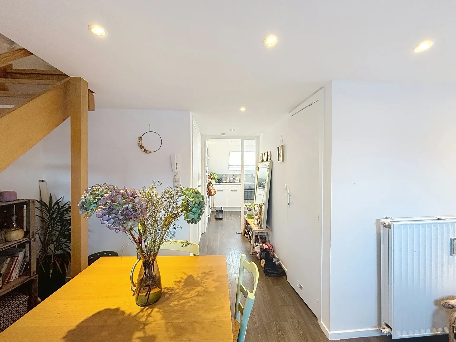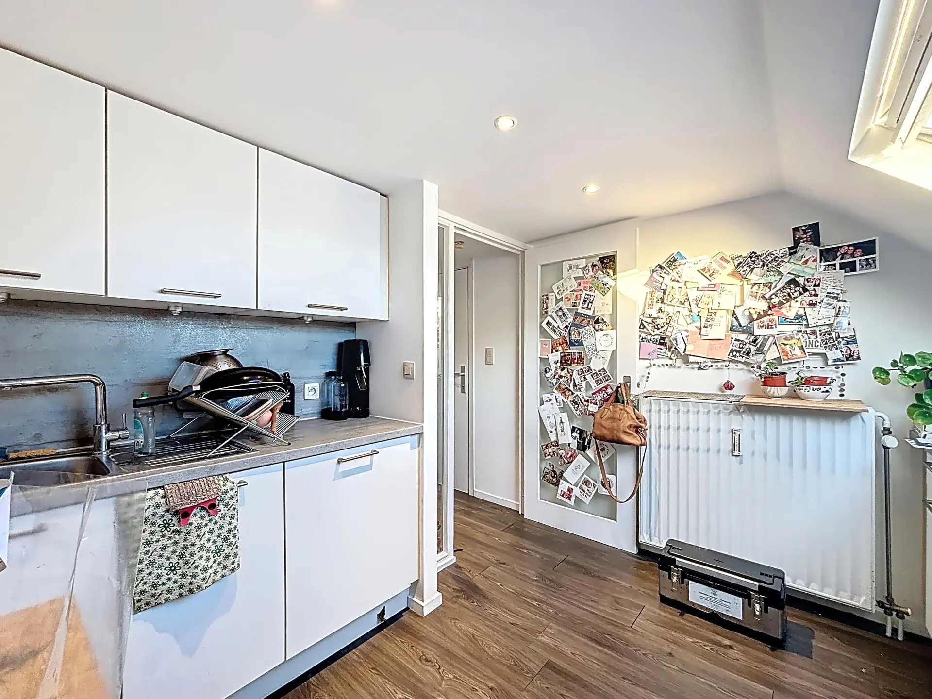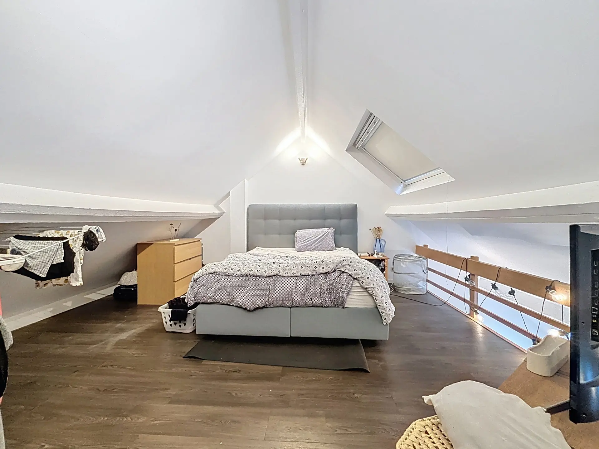 Le deuxième étage offre un hall d’entrée, une cuisine, une pièce de vie, une salle de bain avec WC et un espace mansardé accueillant la chambre principale.