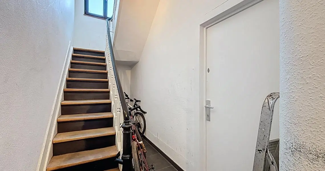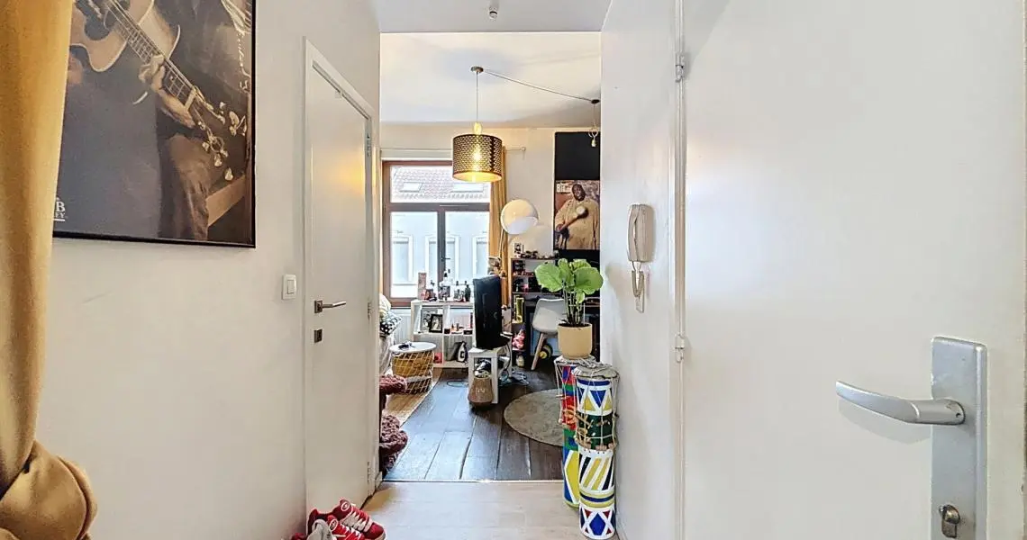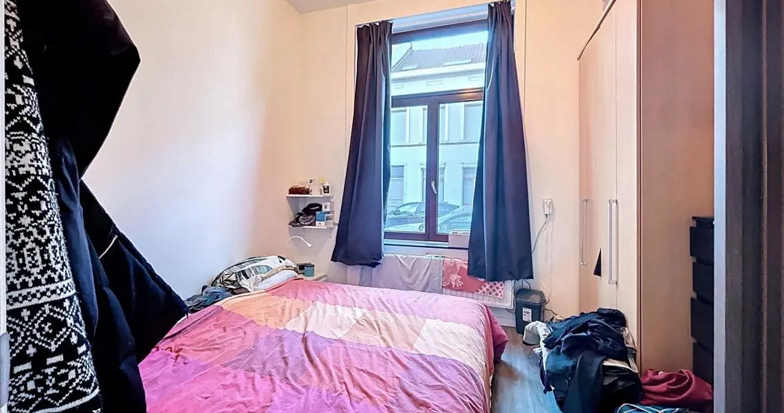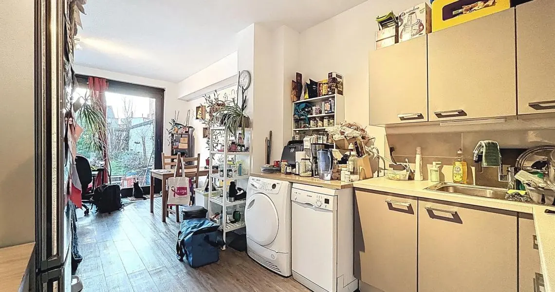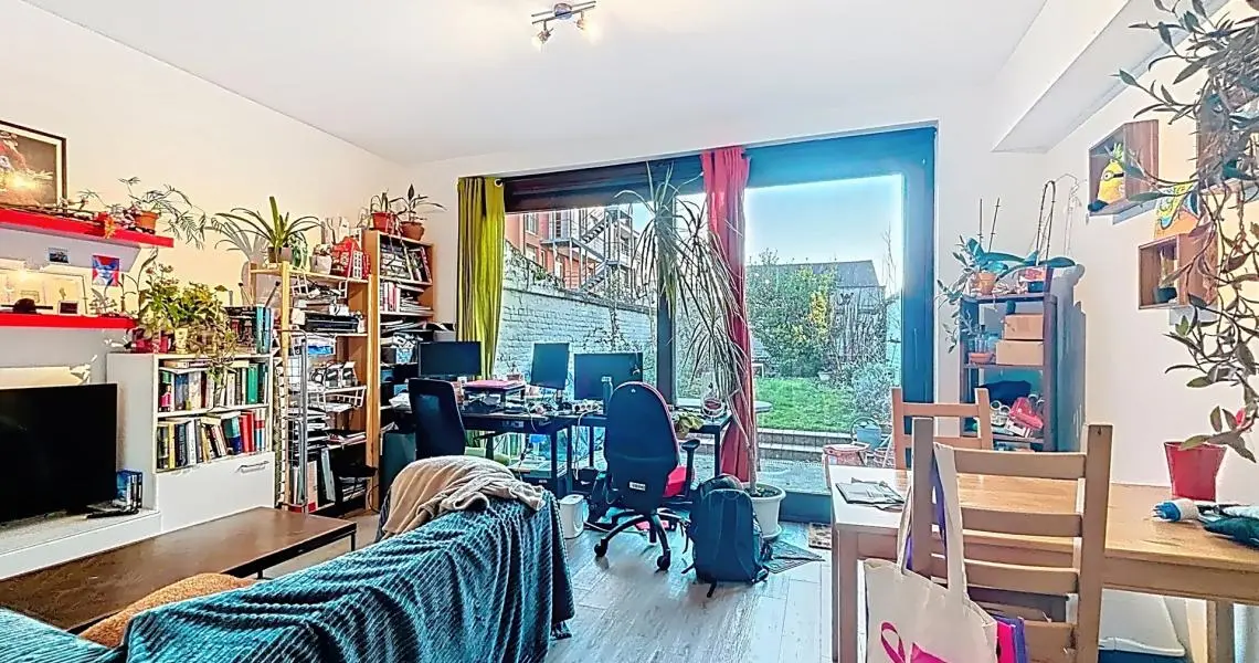 Le rez-de-chaussée se compose d’un hall d’entrée menant à une cuisine ouverte sur une lumineuse pièce de vie avec accès direct à un jardin bien orienté de +/- 55 m². Une chambre à l’avant ainsi qu’une salle de bain avec WC complètent ce niveau.