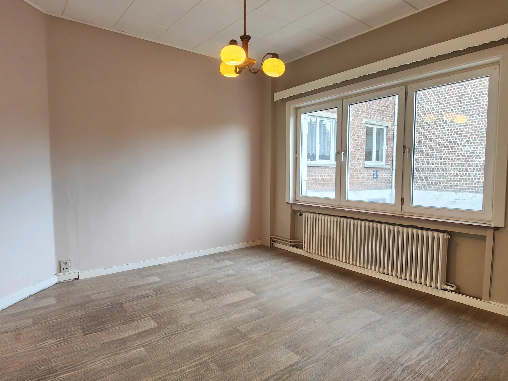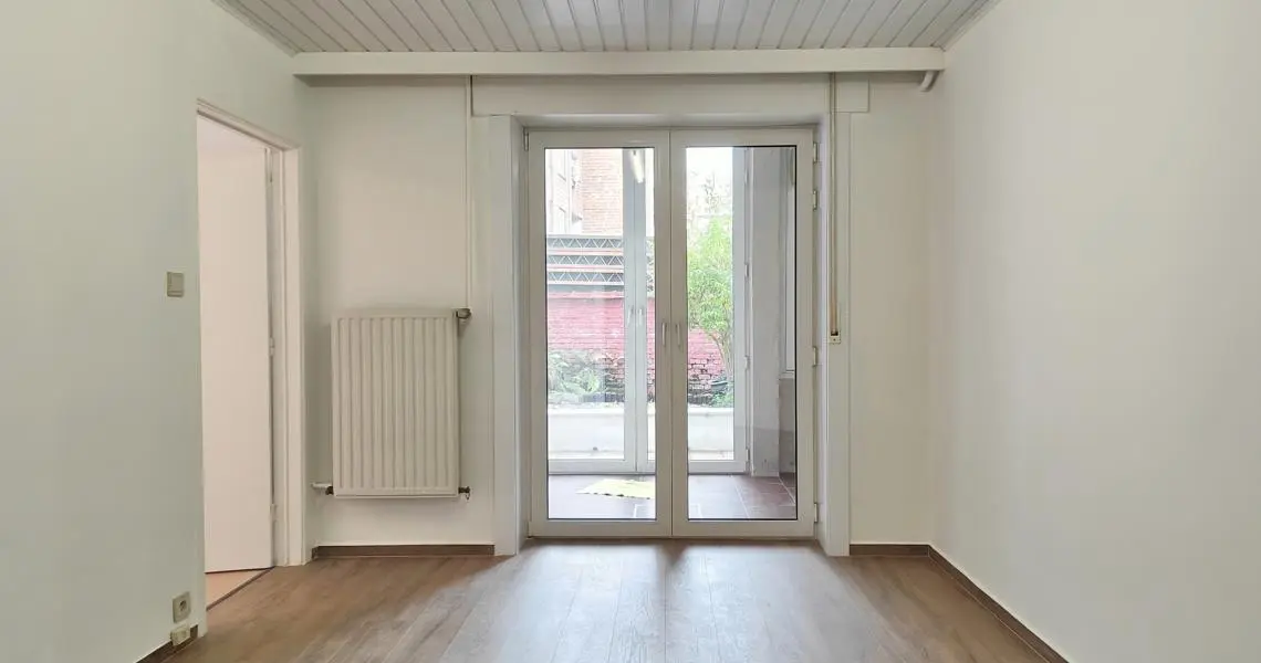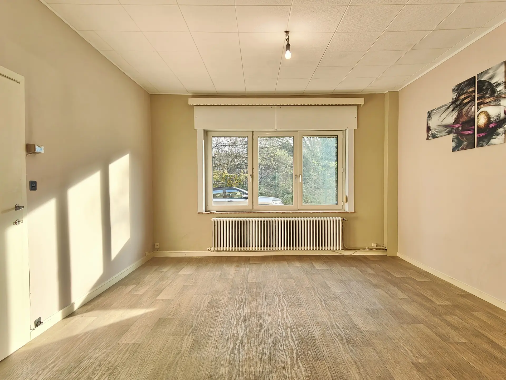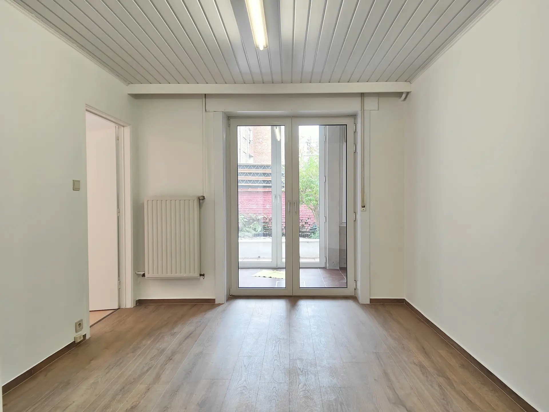 Le souplex de +/- 98 m² (selon PEB) offre au rez-de-chaussée un salon lumineux, une salle à manger et une cuisine ouvrant sur une terrasse.