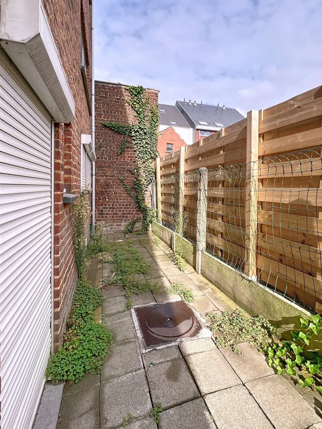 - AU REZ-DE-CHAUSSÉE: un hall d'entrée avec un débarras, une toilette séparée et un grand garage (raccordements buanderie disponibles) et une cour de +/- 10 m² orientée sud-est.