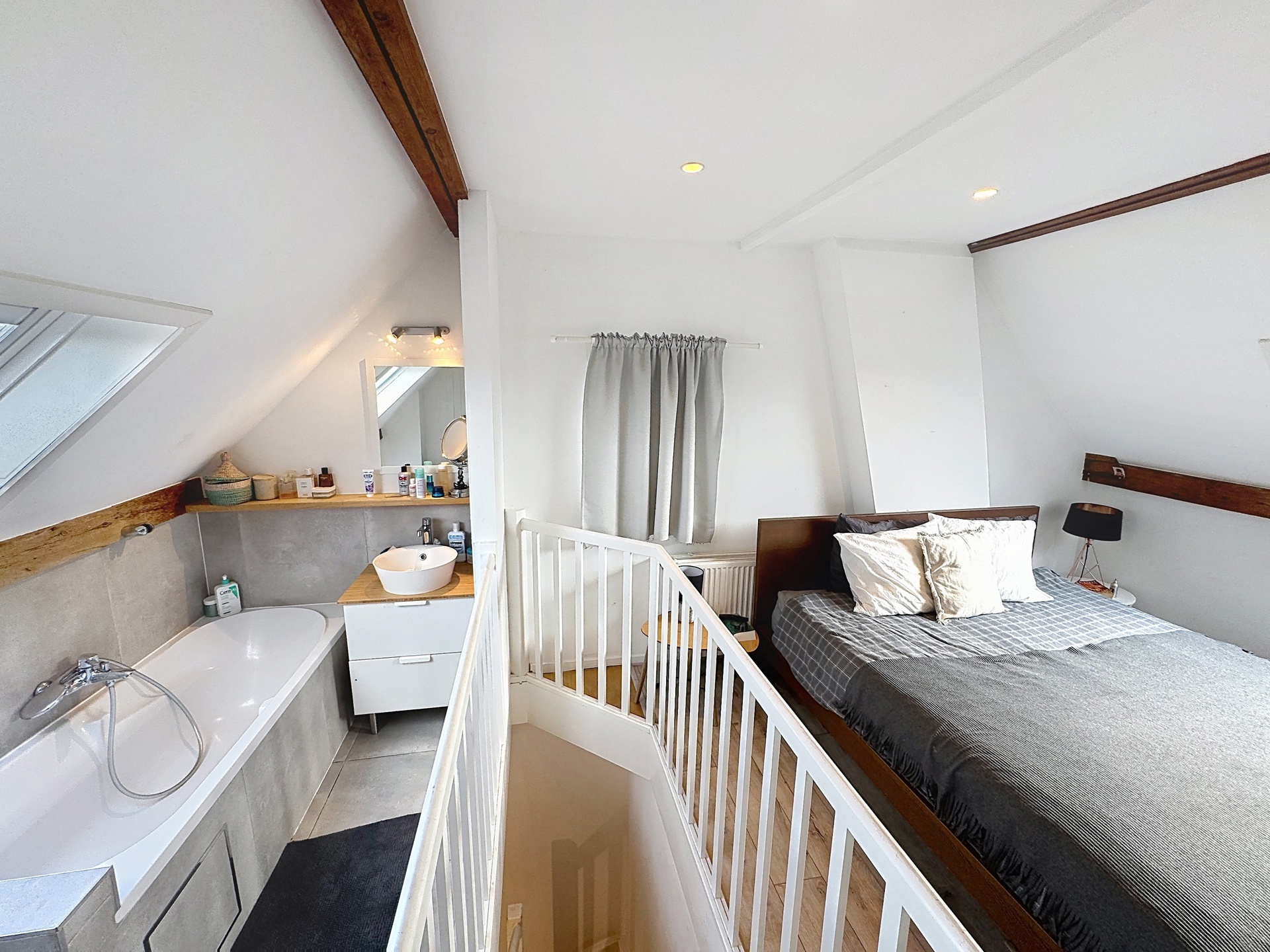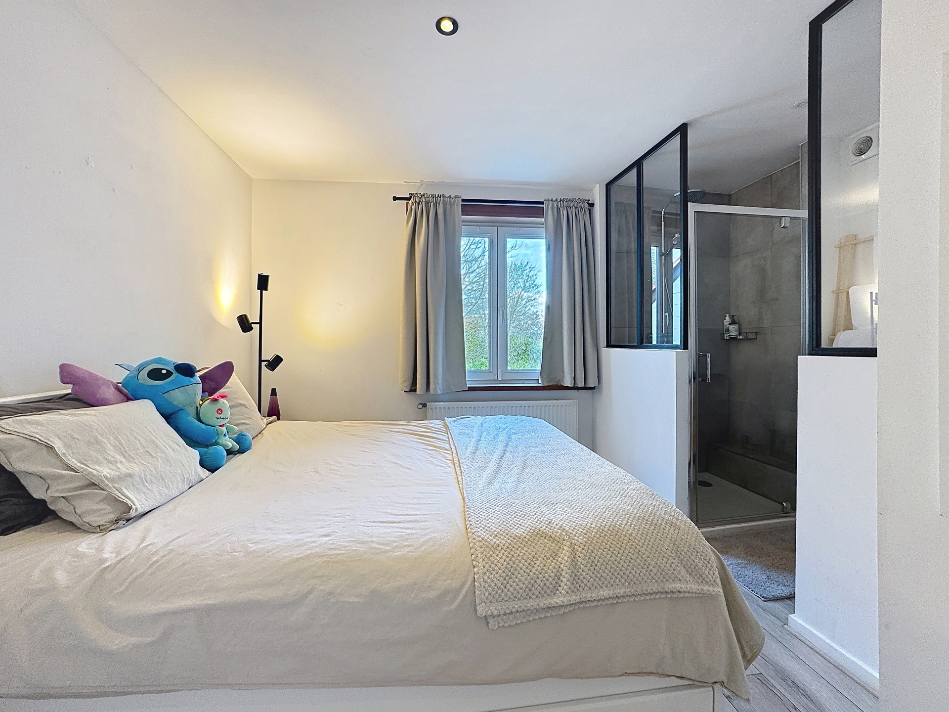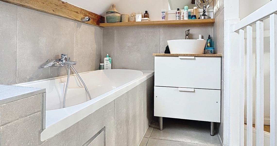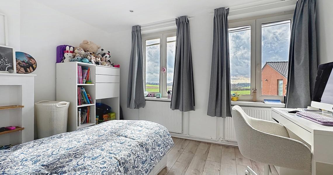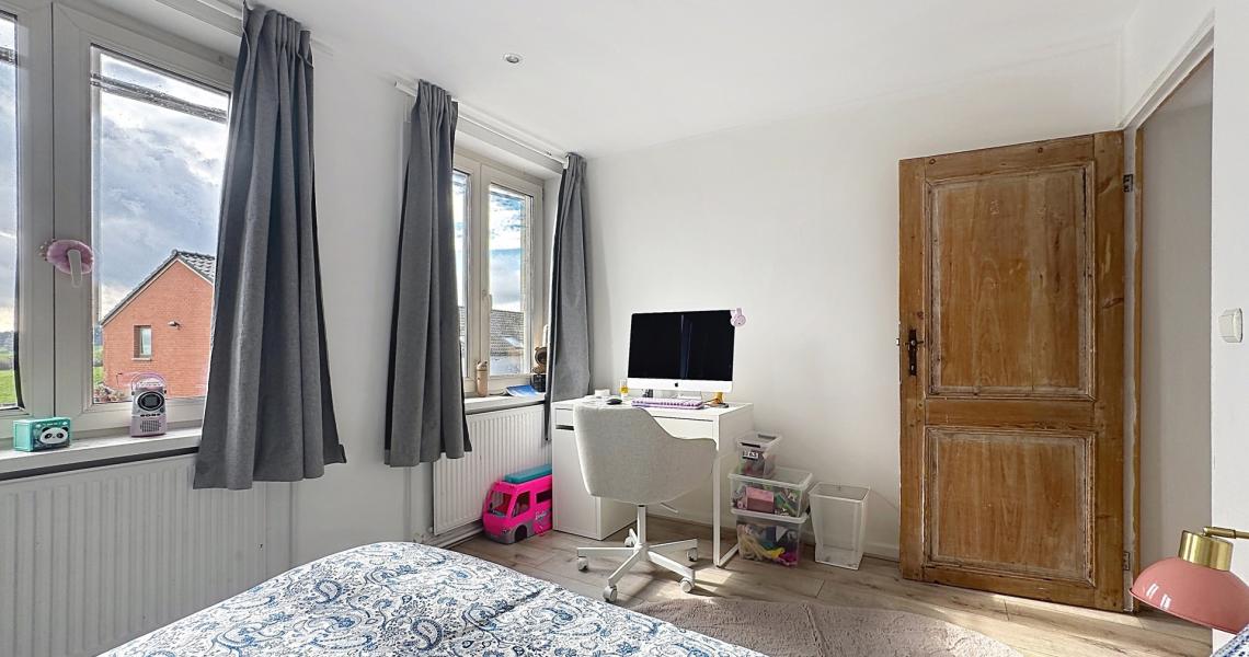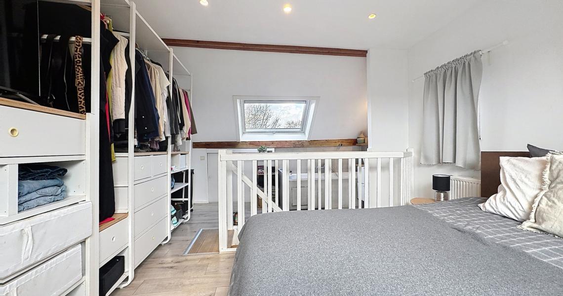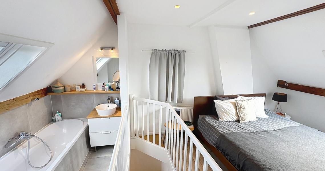 Le deuxième étage accueille une spacieuse chambre parentale avec salle de bains attenante, pour une surface totale d’environ +/-22 m².
