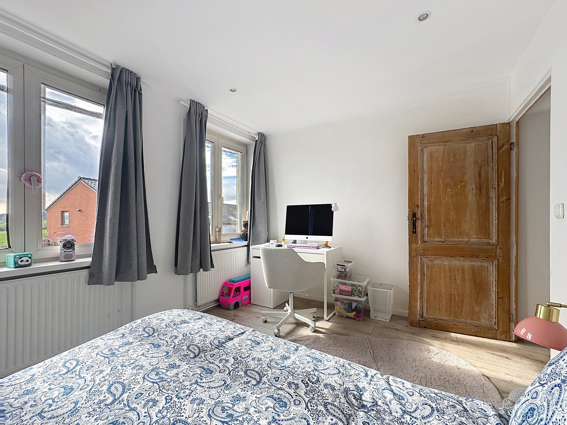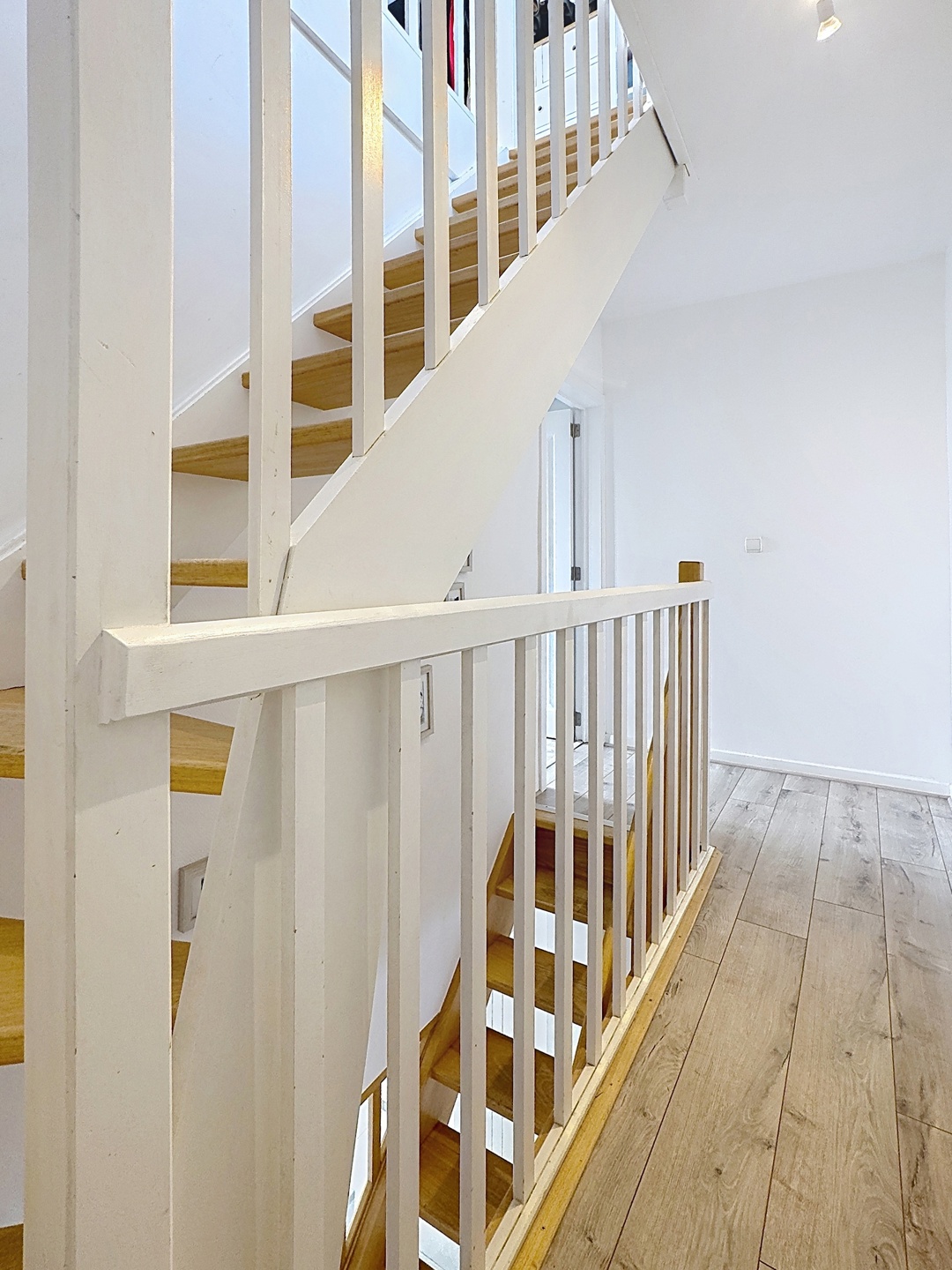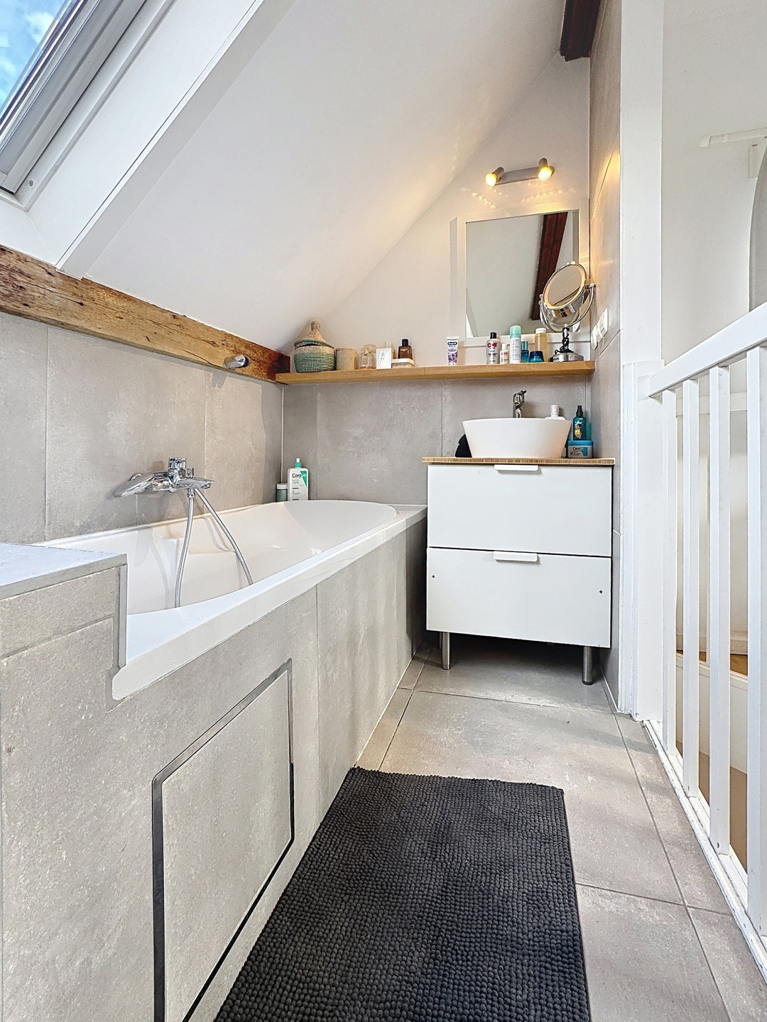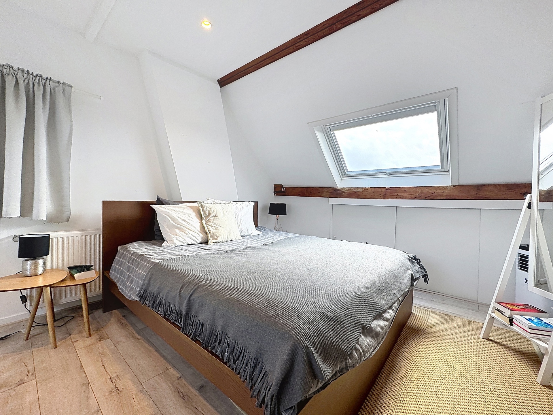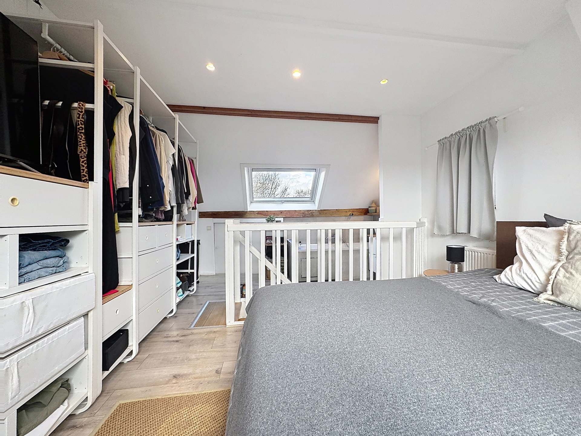 Le deuxième étage accueille une spacieuse chambre parentale avec salle de bains attenante, pour une surface totale d’environ +/-22 m².