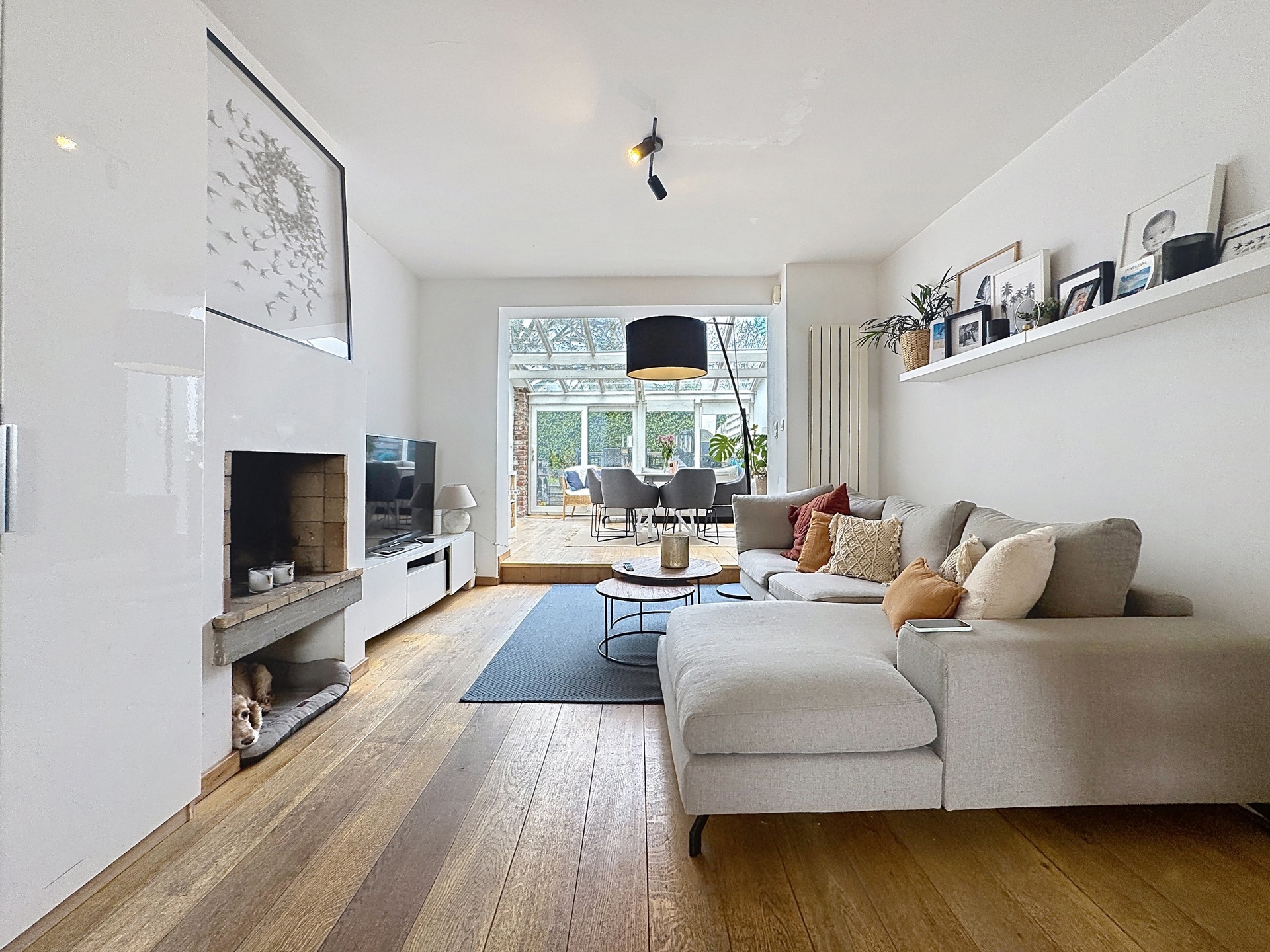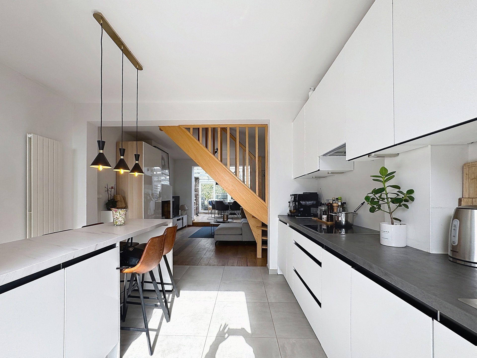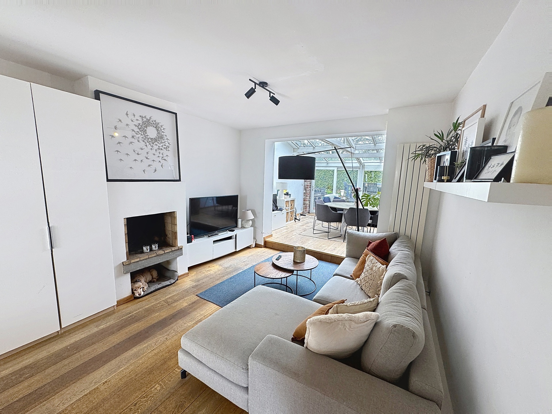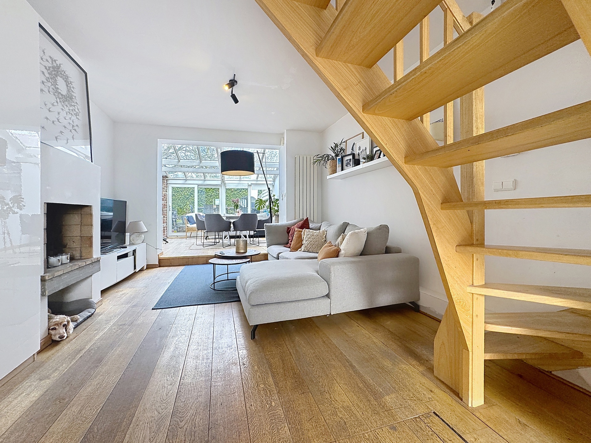 Elle se compose, au rez-de-chaussée, d’un hall d’entrée, d’une superbe cuisine ouverte entièrement équipée (installée en 2024) d’environ 16 m², d’un séjour chaleureux de ± 20 m² avec feu ouvert, ainsi que d’une salle à manger aménagée dans une véranda de ± 16 m², donnant accès à une terrasse et à un agréable jardin.