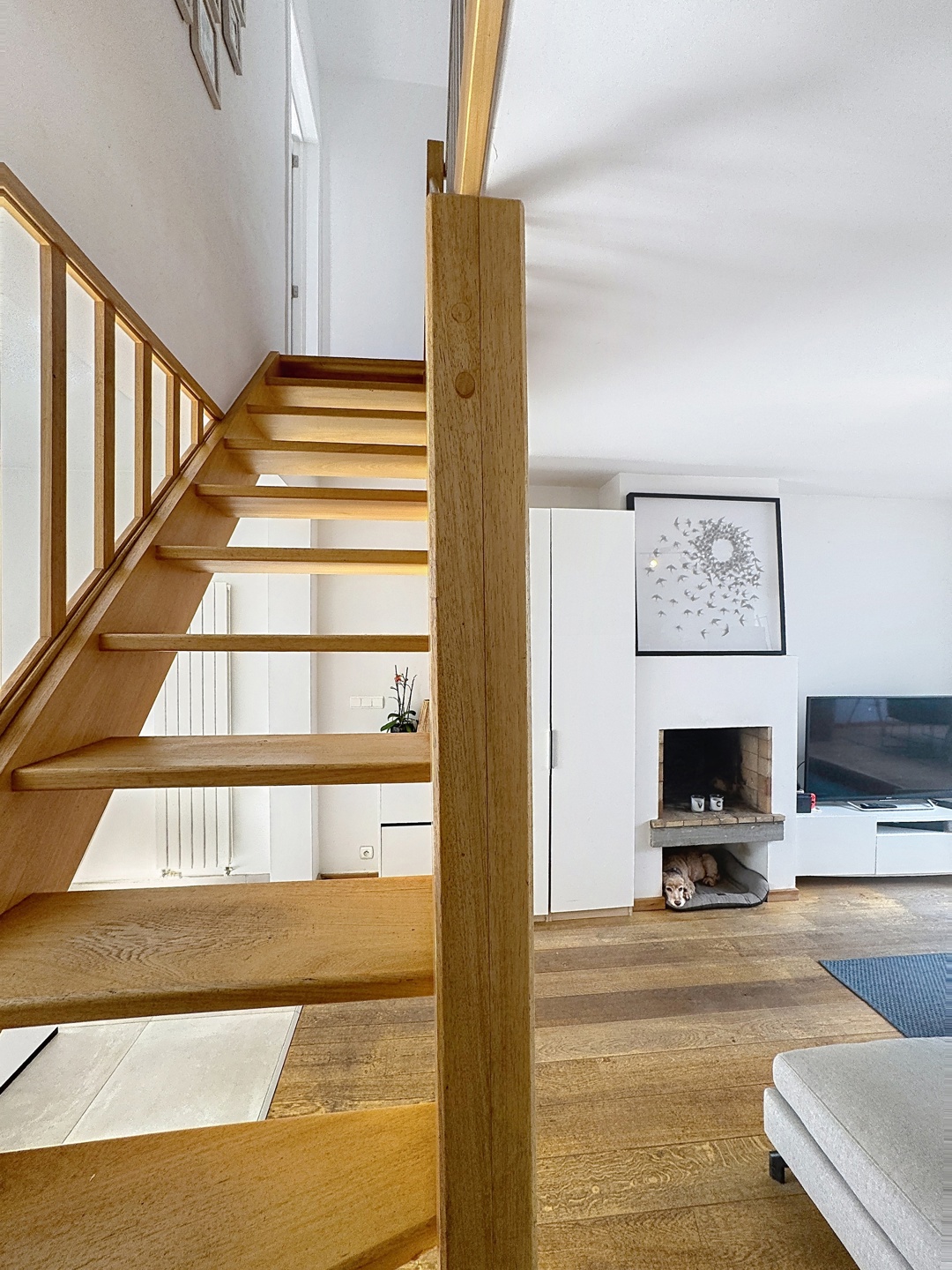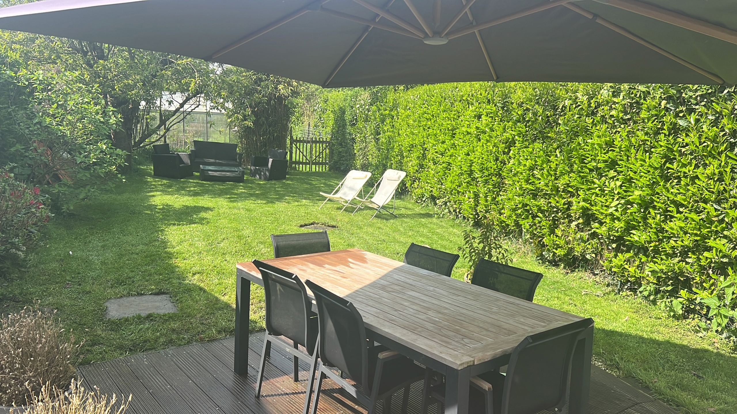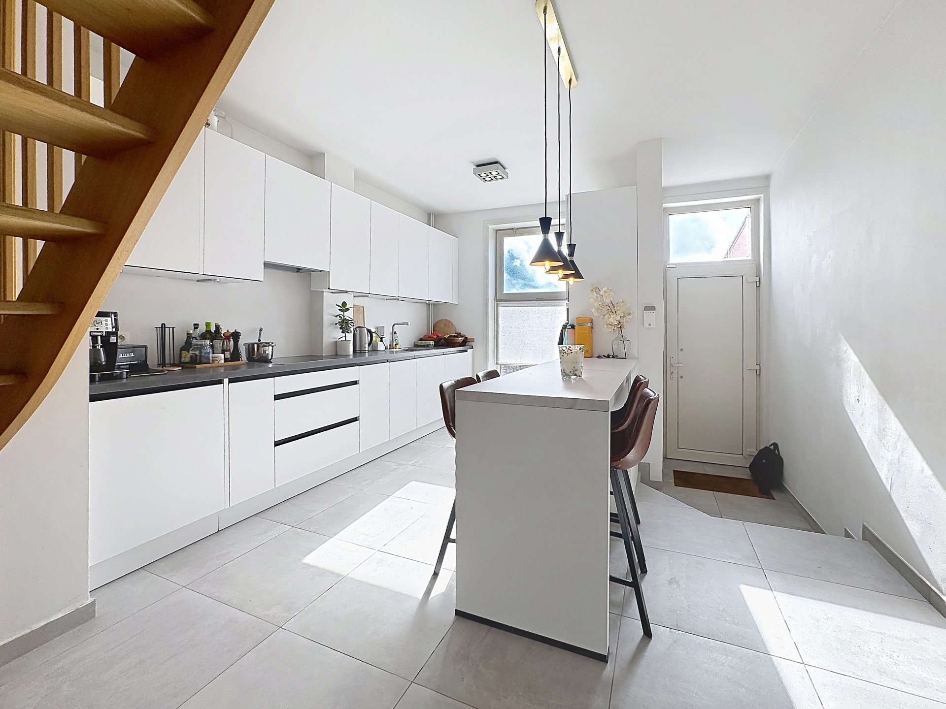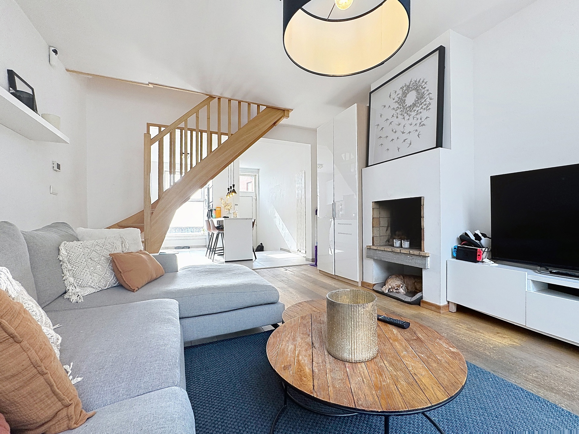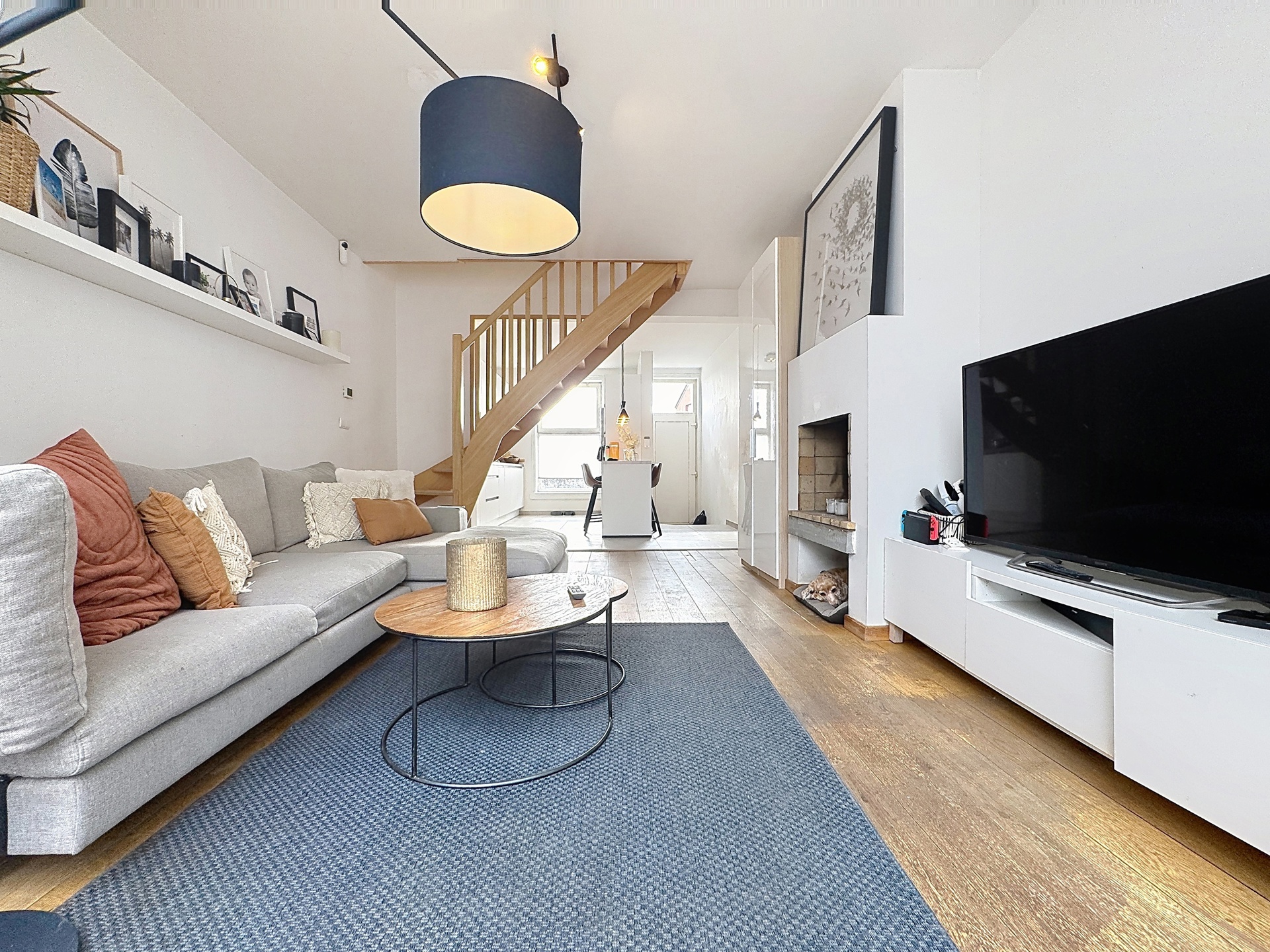 Elle se compose, au rez-de-chaussée, d’un hall d’entrée, d’une superbe cuisine ouverte entièrement équipée (installée en 2024) d’environ 16 m², d’un séjour chaleureux de ± 20 m² avec feu ouvert, ainsi que d’une salle à manger aménagée dans une véranda de ± 16 m², donnant accès à une terrasse et à un agréable jardin.