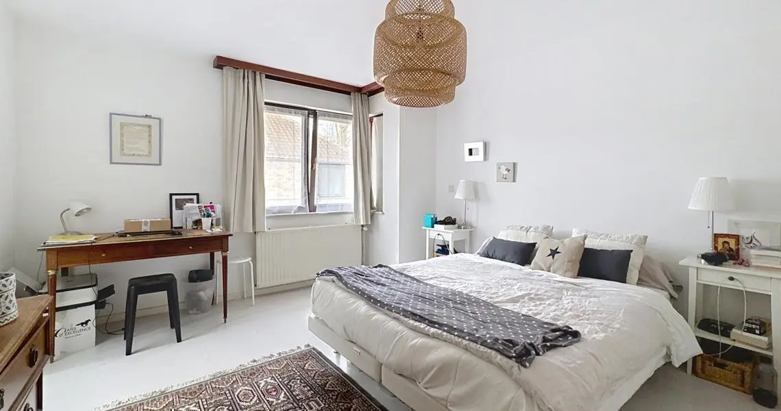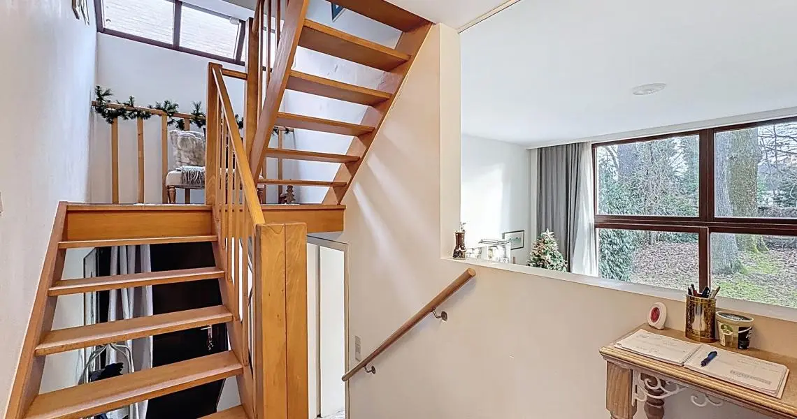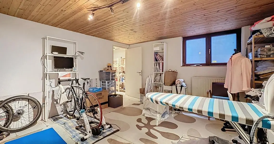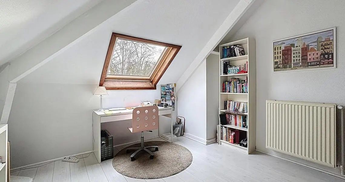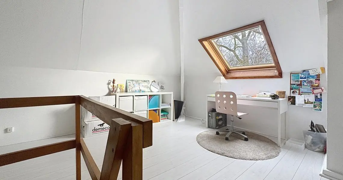 Elle se compose d’un hall d’entrée avec coin vestiaire, d’un spacieux séjour lumineux donnant accès au jardin, ainsi que d’une cuisine communicant avec la salle à manger et d’une toilette séparée au premier étage. Le deuxième étage offre trois chambres, une salle de bains, une salle de douche et une toilette séparée. Les combles aménagés accueillent une quatrième chambre, chaleureuse et unique, avec la possibilité d’y créer un coin douche supplémentaire.