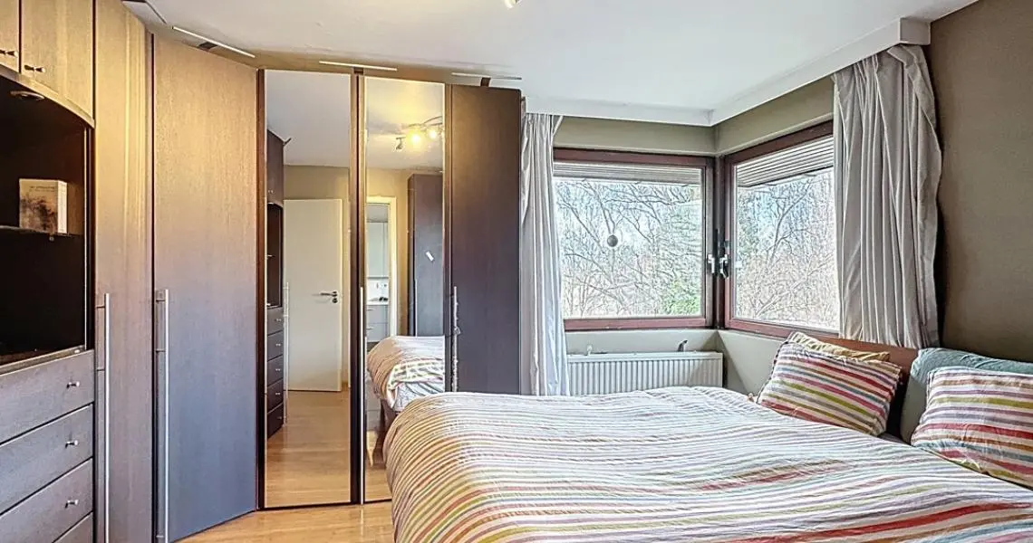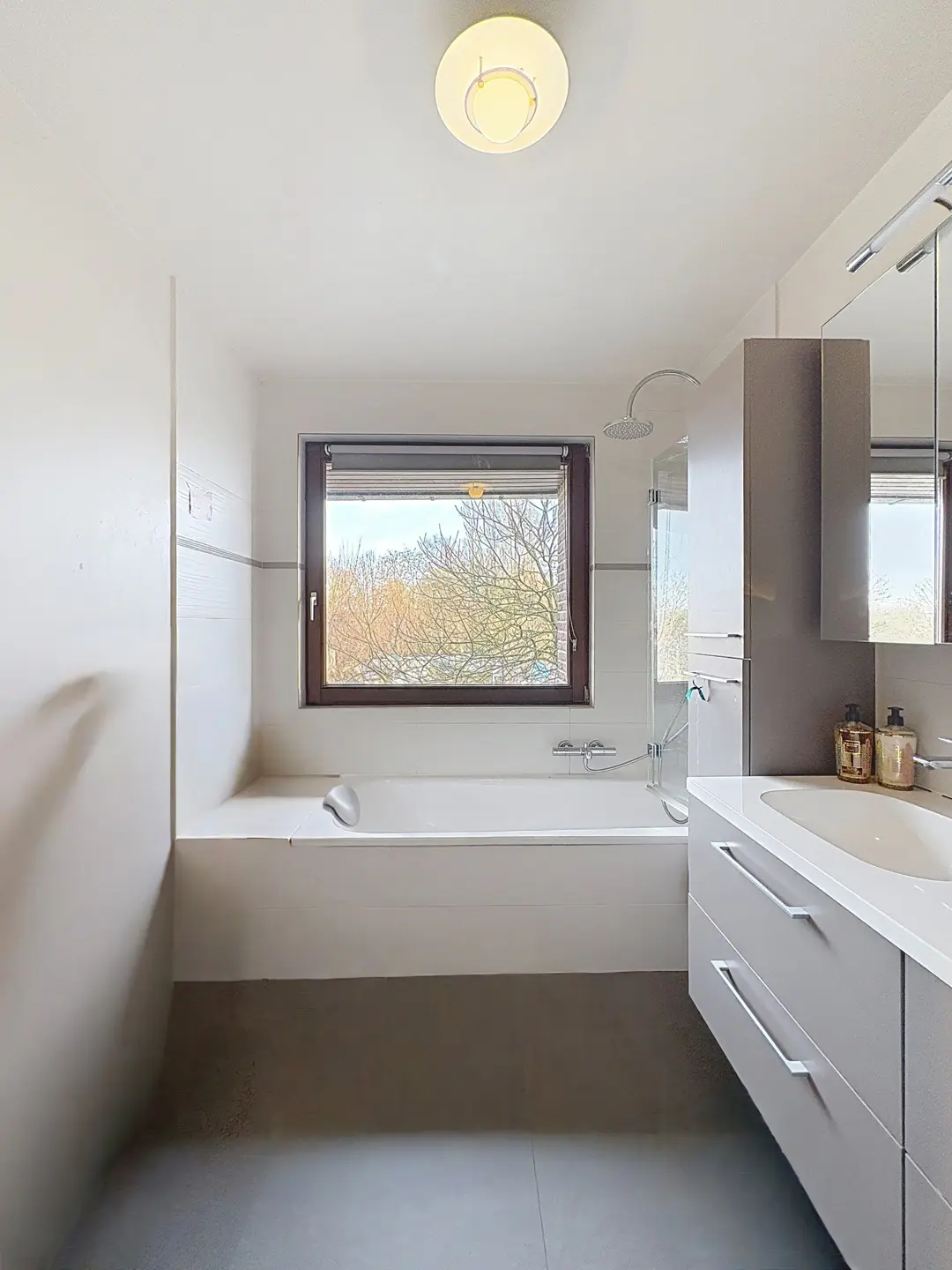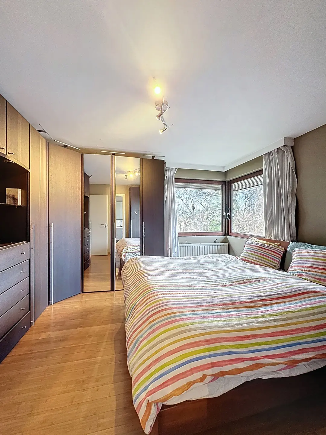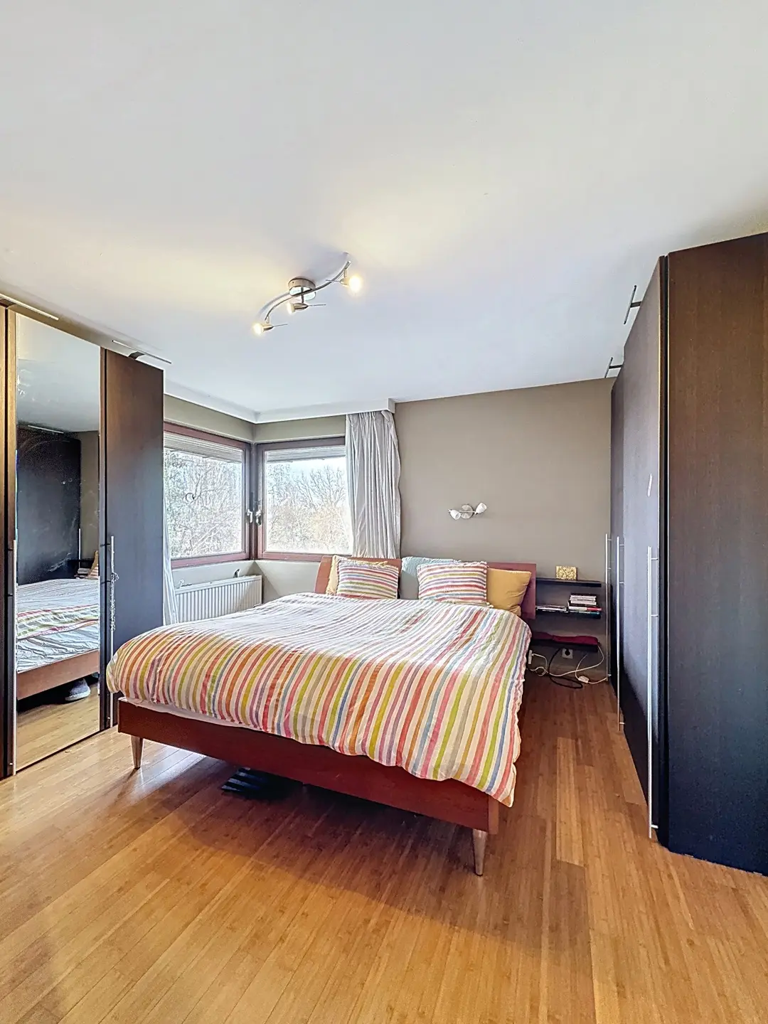 Niveau +2 : Hall de nuit donnant accès à 2 belles chambres avec vue arborée (+/- 12 m² et 10,5 m²), d'une agréable salle de douche rénovée en 2022 de +/- 9 m² et d'une suite parental avec placards (Hulsta) de +/-15 m² avec salle de bains attenante de +/- 9 m² et un WC séparé accessible via la salle de bains parentale.