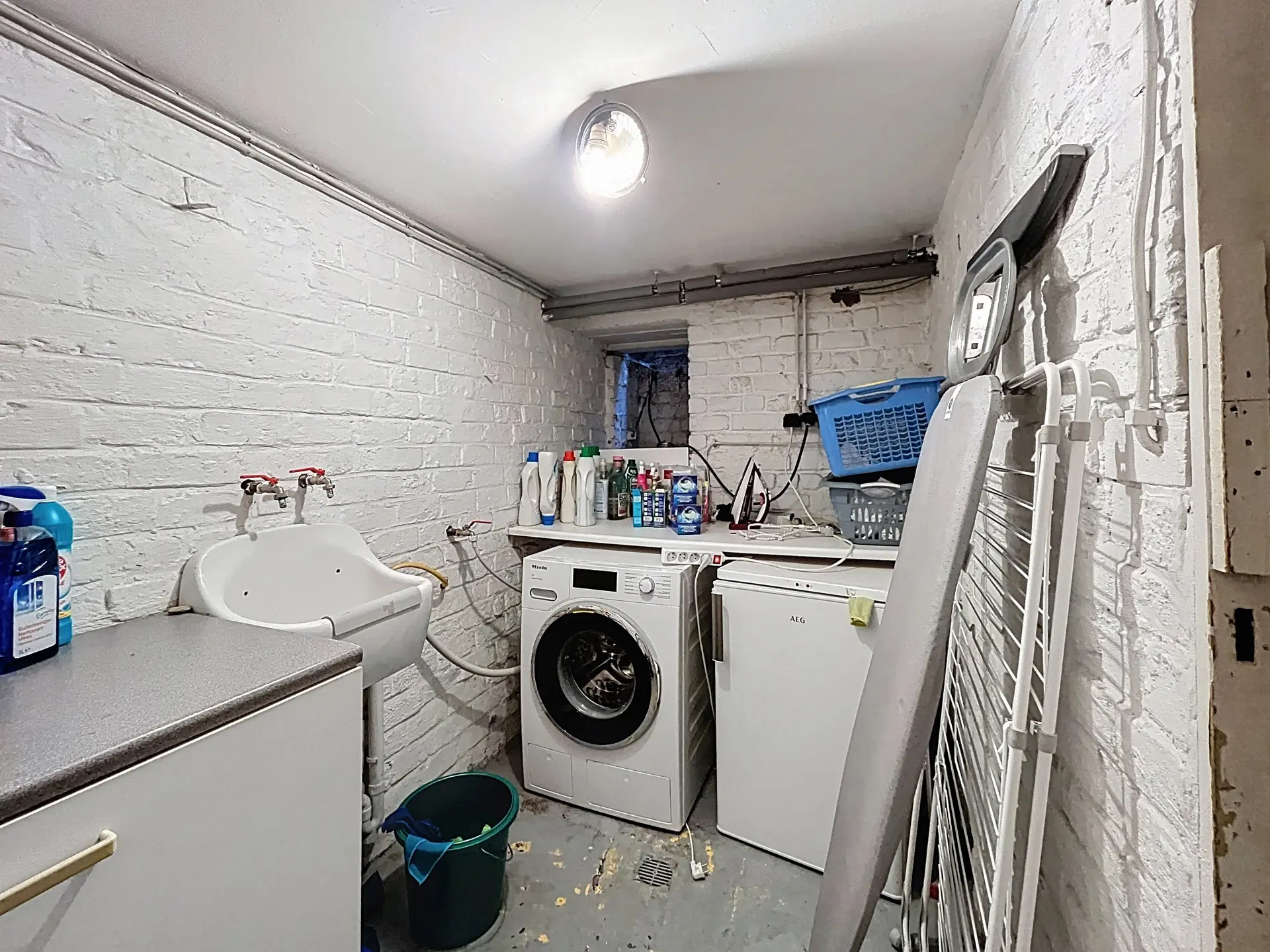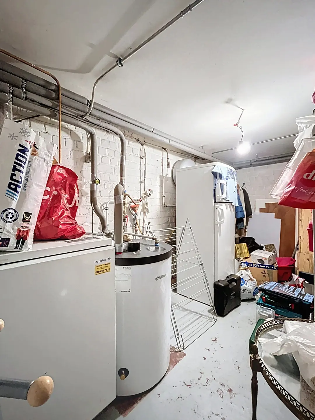 Le sous-sol comprend une chaufferie (+/- 8 m²), une buanderie (+/- 5 m²) et une réserve (+/- 3 m²). Un emplacement de parking situé devant la maison complète l’ensemble.