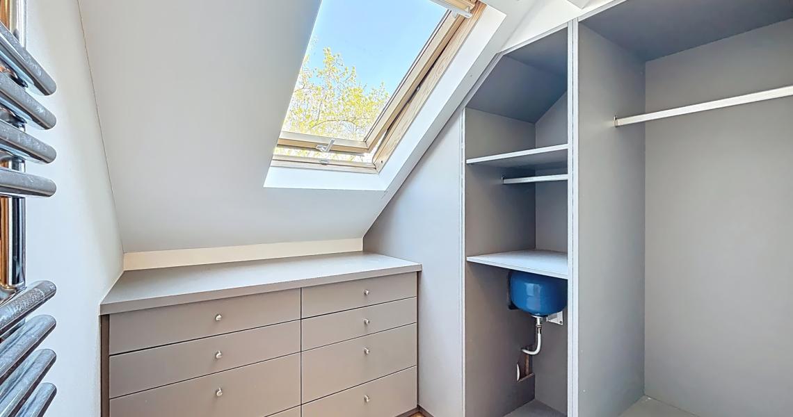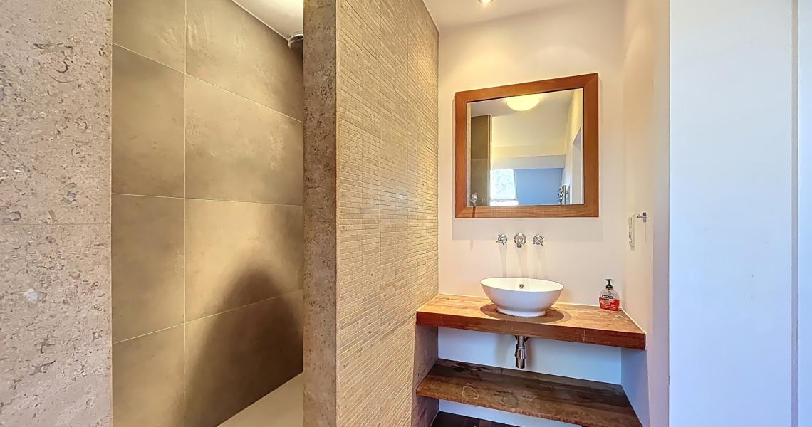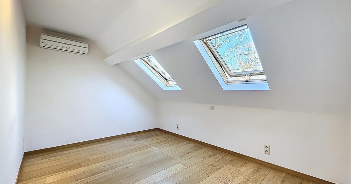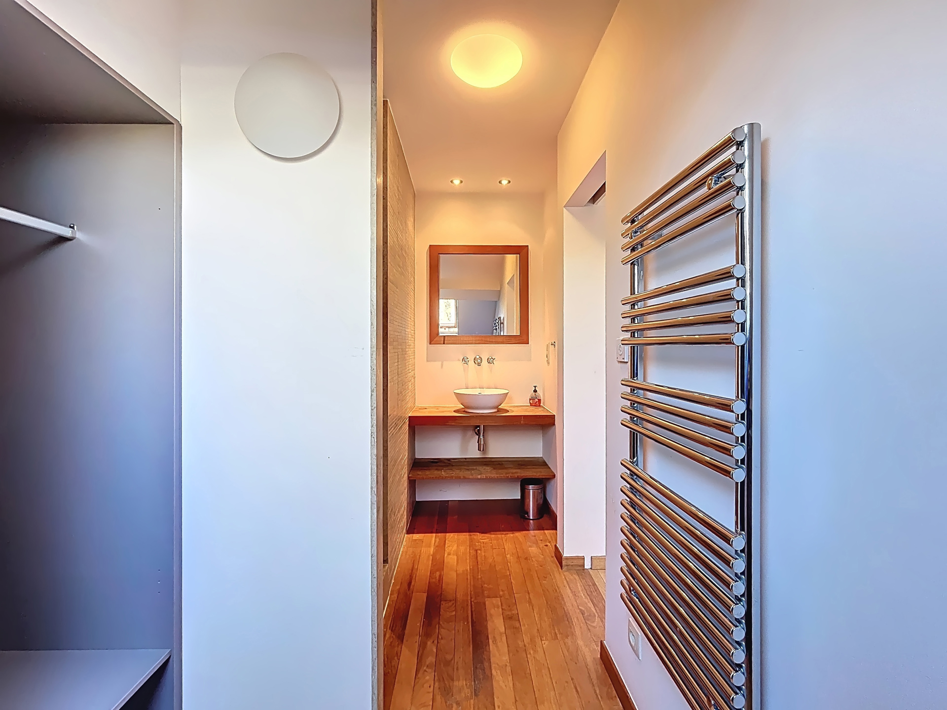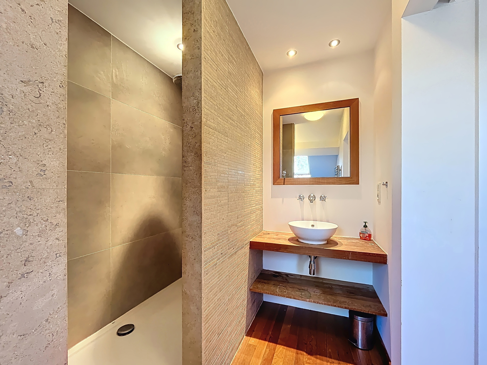 L’espace de nuit comprend une grande chambre de ±14 m², ainsi qu’une salle de douche contemporaine équipée d’une vaste douche à l’italienne, d’un meuble vasque, d’un radiateur sèche-serviettes en inox et d’un espace dressing. Au sous-sol, vous bénéficierez également d’une grande cave de rangement ainsi que d’un espace dédié au stockage des vélos.