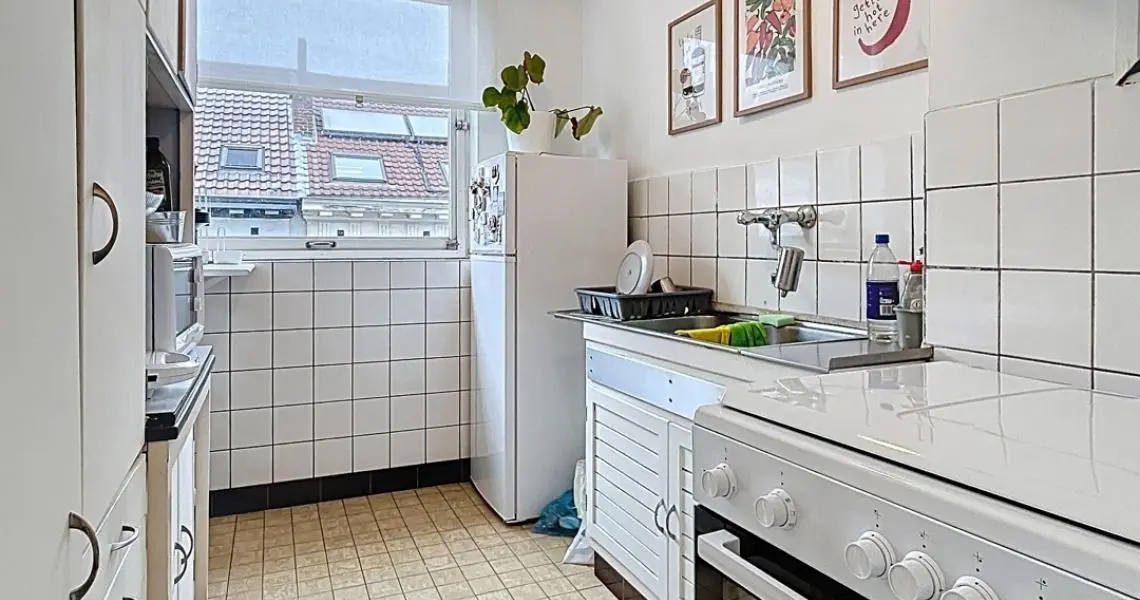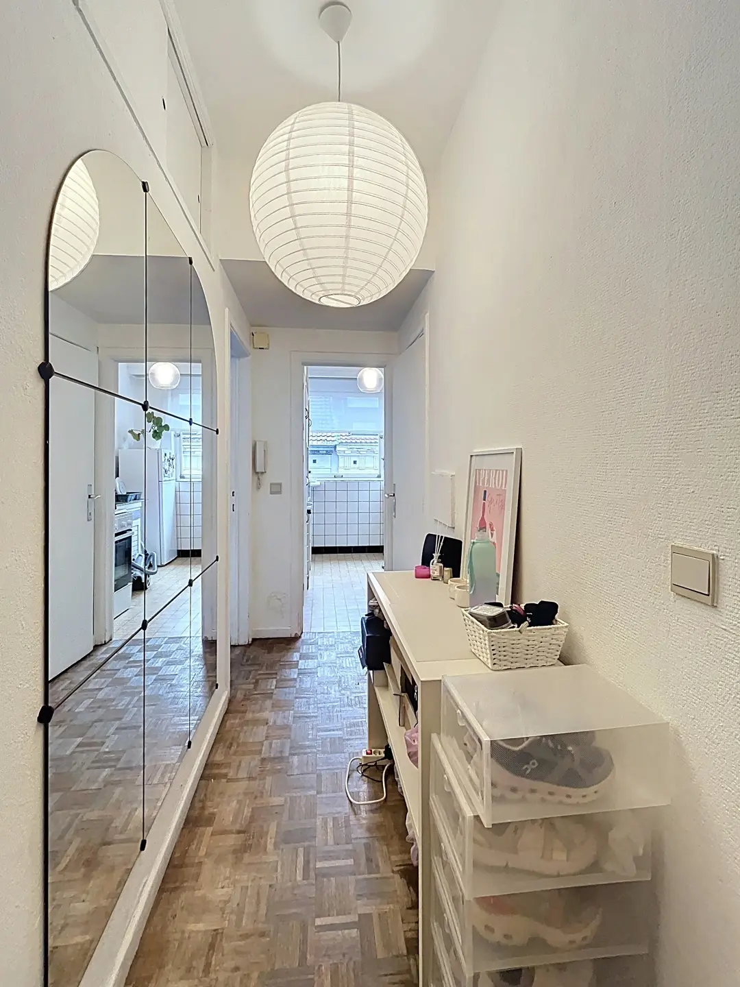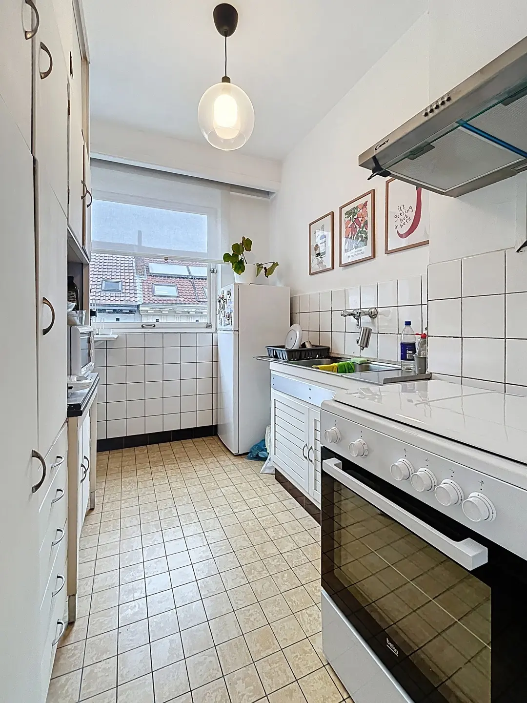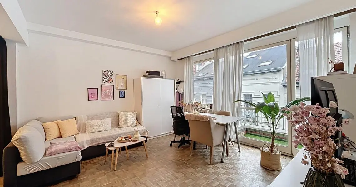 L’appartement se compose d’un hall d’entrée (+/- 4 m²) avec rangements, d’un espace salon et salle à manger (+/- 20 m²) donnant sur une agréable terrasse de 4 m², d’un coin à dormir (+/- 8m²) séparé visuellement, d’une cuisine super équipée (+/- 6 m²), d’une salle de bains (+/- 3 m²) avec machine à laver, et d’une toilette séparée. De nombreux espaces de rangement ainsi qu’une cave complètent le bien.