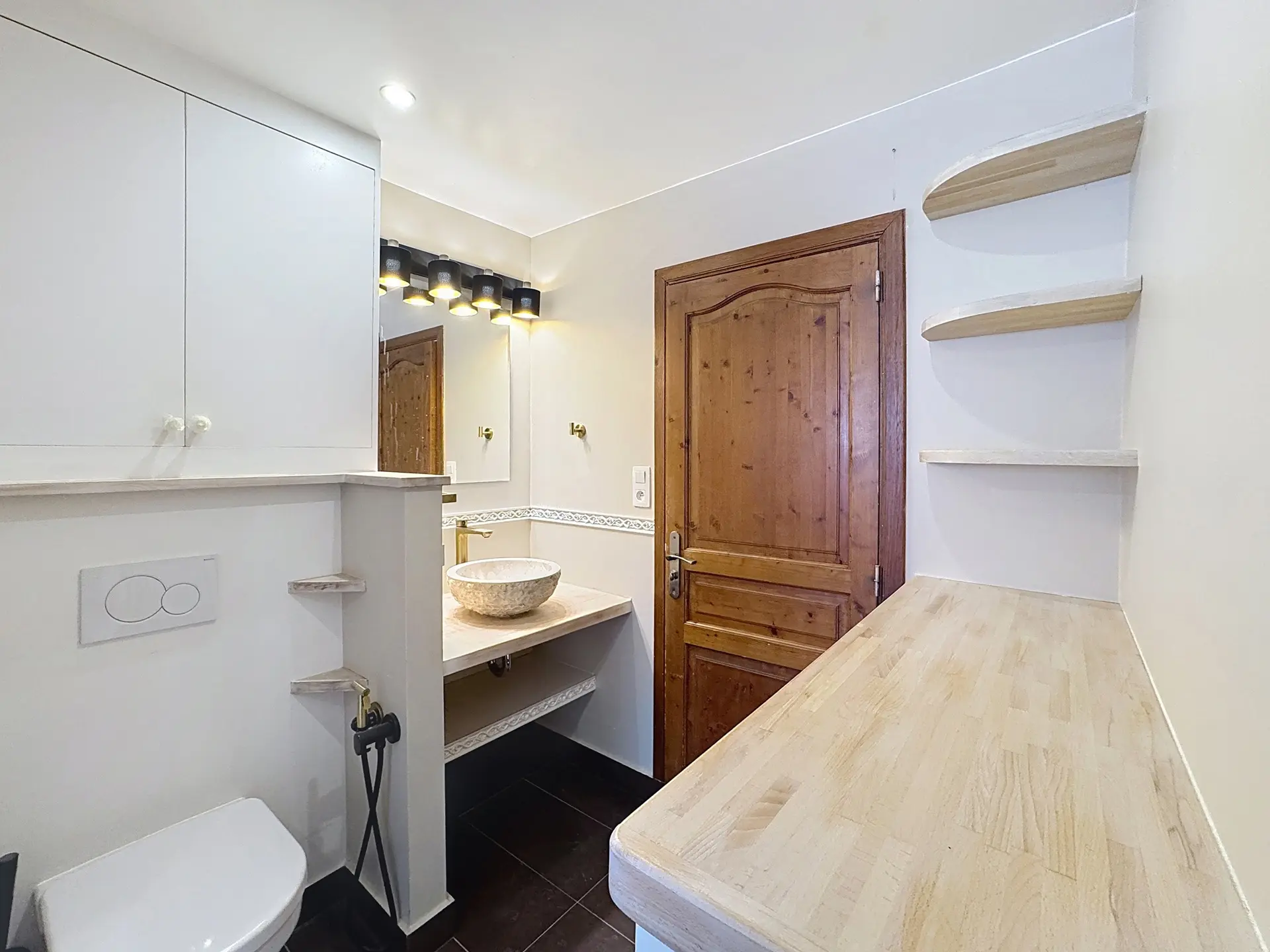 La salle de bains (+/- 10 m²), entièrement carrelée, propose à la fois une douche spacieuse et une baignoire sous velux, offrant un cadre apaisant et lumineux.