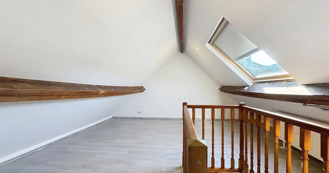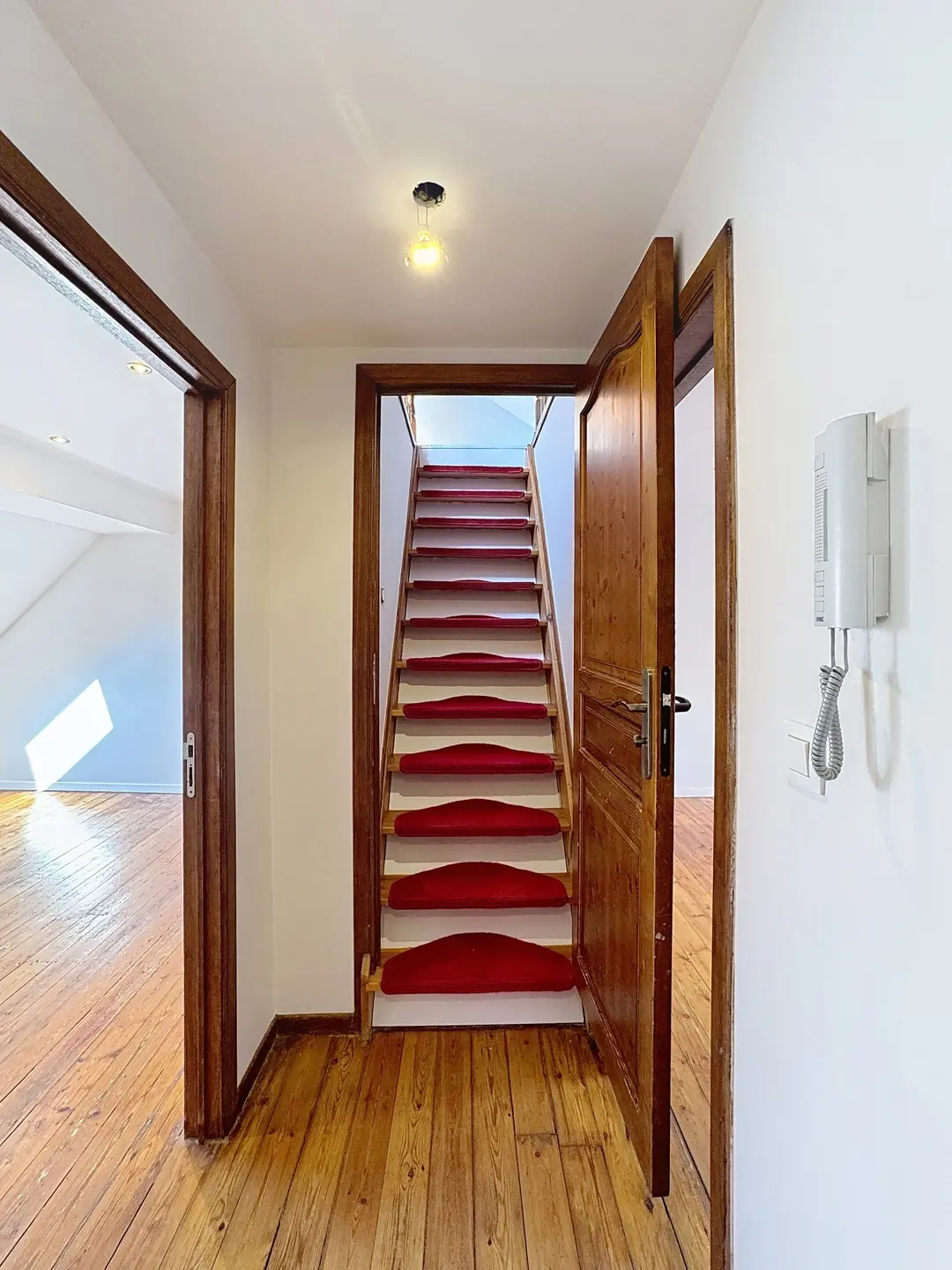 Un élégant escalier en bois (± 2,90 m²) mène à l’étage supérieur, où l’on retrouve la partie nuit. L’appartement comprend trois chambres (+/- 27 m², +/- 18 m² et +/- 11 m²)