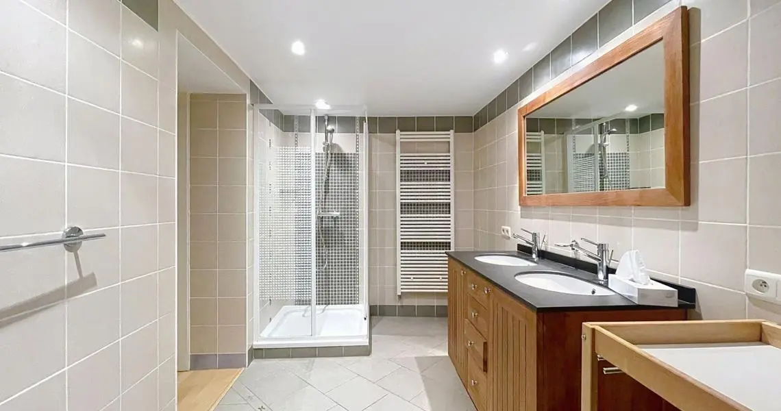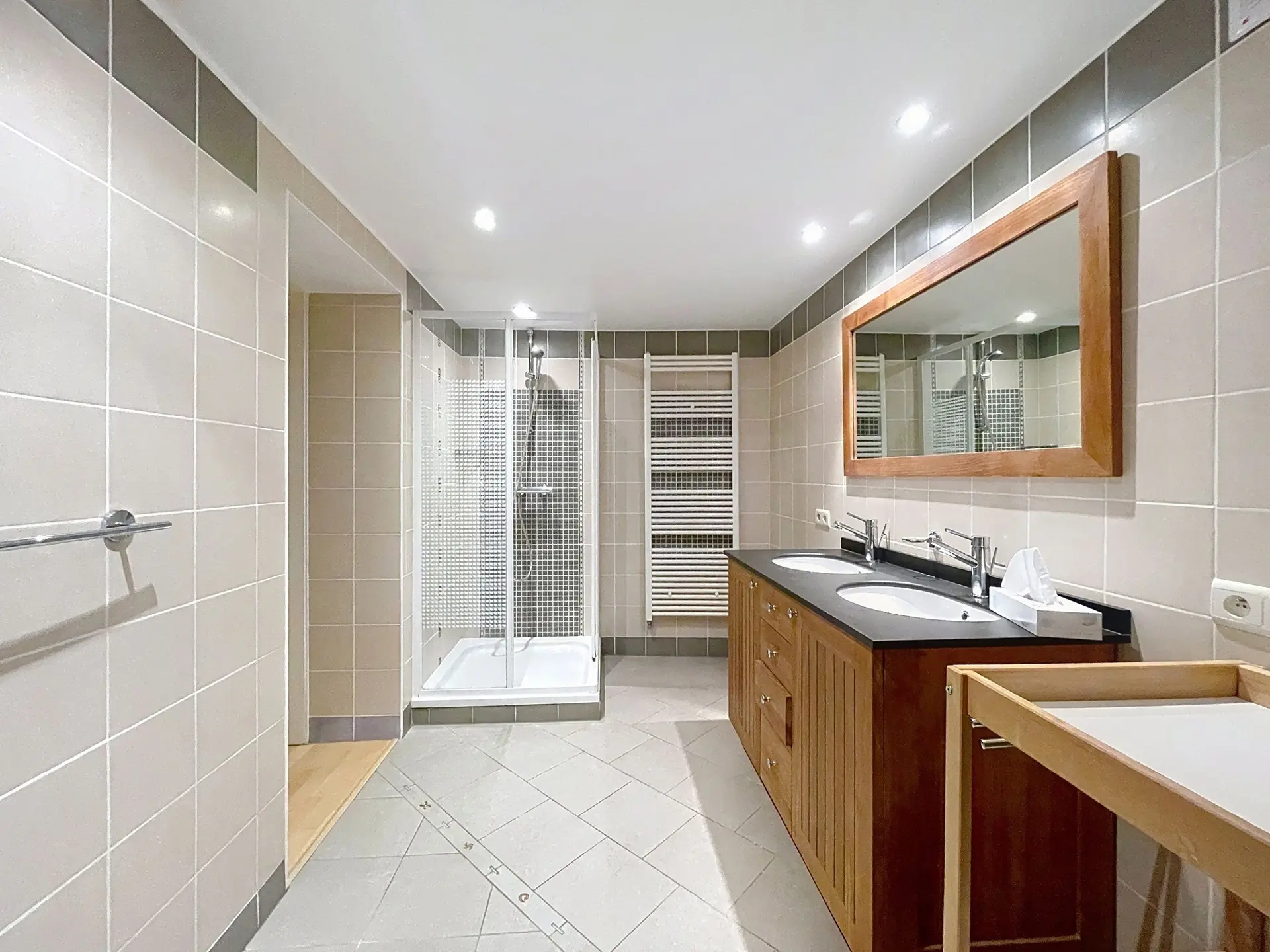 Il se compose notamment d’un vaste salon de +/- 50 m², d’une salle à manger de +/- 15 m², d’une cuisine super équipée de +/- 12 m², de trois chambres confortables (+/- 11 m², +/- 14 m², +/- 14 m²) et d’une suite parentale de +/- 19 m², d’un dressing de +/- 7 m², de deux salles de bains avec douche (9 m² et 10 m²), de deux halls de nuit totalisant plus de 29 m², ainsi que de deux WC séparés.